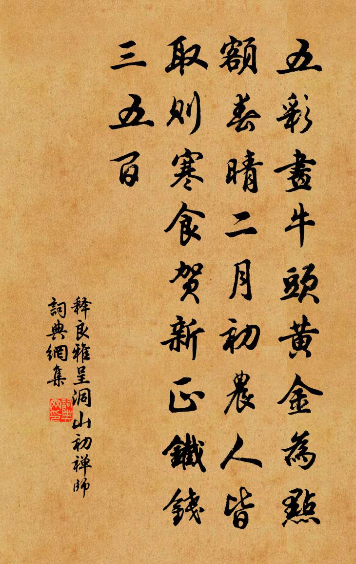 詩詞名句歷史字典書法欣賞書法字典國語詞典說文解字康熙字典古漢語字典標 題 作 者 詩 句 呈洞山初禪師作者:釋良雅 朝代:宋代呈洞山初禪師原文五彩畫牛頭,黃金為點額。春晴二月初,農人皆取則。寒食賀新正,鐵錢三五百。詩詞問答問:呈洞山初禪師的作者是誰?答:釋良雅問:呈洞山初禪師寫於哪個朝代?答:宋代釋良雅呈洞山初禪師書法欣賞呈洞山初禪師書法作品詩詞推薦句陳舜俞〔宋代〕石間圓影疊金波。梅花五首劉克莊〔宋代〕夜來幾陣隔窗風,便恐明朝已掃空。點在青苔真可惜,不如吹入酒杯中。春日江津游望杜審言〔唐代〕旅客搖邊思,春江弄晚晴。煙銷垂柳弱,霧卷落花輕。飛棹乘空下,回流向日平。鳥啼移幾處,蝶舞亂相迎。忽嘆勸農十首熊克〔宋代〕黃岩出穀半丹邱,使指新疏萬壑流。築堰未妨齊著力,旱天隨取灌高疇。寄襄陽楊侍郎三丈度正〔宋代〕茫茫天地間,萬象森紛羅。乃眷蜀三川,神氣尤雄豪。一川發於岷,一川發於洮。一川啟母來,其名為江沱。洮江寒夜次潘岷原韻查慎行〔清代〕一片西風作楚聲,臥聞落葉打窗鳴。不知十月江寒上,陡覺三更布被輕。霜壓啼鳥驚月上,夜驕飢鼠闞燈明。還家信筆陸游〔宋代〕有酒或一醉,無酒終日閒。雨足通南澗,木落見西山。飯飽出柴門,本散腰腳頑;偶然遇野人,笑語欲忘還。有感姜特立〔宋代〕少年如曉行,志竟多閒佚。老如夜還家,行李自迫怵。向來輕寸陰,此去惜余日。已往不可追,未來嗟莫失。昔人西園陸游〔宋代〕半掩朱門蘚徑斜,翠屏繡谷忽谽*。高高下下天成景,密密疏疏自在花。江近夕陽迎宿鷺,林昏殘角促歸鴉。吾舟憶山南陸游〔宋代〕醉墨淋漓酒百杯,轅門山色碧崔嵬。打球駿馬千金買,切玉名刀萬里來。結客漁陽時遣簡,踏營渭北夜銜枚。十年仇仁近之姑蘇別後奉寄方回〔宋代〕詩眼到姑蘇,今愁古恨俱。台驚吳後鹿,江問漢時鱸。矯奪風應息,懷襄氣未甦。梅邊早回首,飛鶴望林通。龍潭利眾院陳岩〔宋代〕日涵林壑紫光凝,草動花翻氣似蒸。勝地劃開鼪鼬逕,數間松屋住殘僧。江行四首陳造〔宋代〕帆館舟輕去若梭,平生忠信傲風波。忽然隱几驚搖兀,知是那吒石畔過。餞孟運判寺簿赴京三首岳珂〔宋代〕詔書夜下日華門,輦路爭看使者軒。烽火三邊尚勍敵,煙塵萬里欠公言。不須目睫憂多疊,好吐胸懷悟至尊。富貴三日侍鳳光殿曲水宴應制詩沈約〔南北朝〕光遲蕙畝。氣婉椒台。皇心愛矣。帝曰游哉。玉鸞徐騖。翠鳳輕回。別殿廣臨。離宮洞啟。川祇奉壽。河宗相禮。無題袁崇煥〔明代〕太息弓藏狗又烹,狐悲兔死最關情。家貧資罄身難贖,賄賂公行殺有名。脫幘憤深檀道濟,爰書冤及魏元成。備遭臨江仙閻選〔唐代〕雨停荷芰逗濃香,岸邊蟬噪垂楊。物華空有舊池塘。不逢仙子,何處夢襄王?珍簟對欹鴛枕冷,此來塵暗淒涼。欲頌古釋了朴〔宋代〕靈雲一笑見桃花,三十飯年始到家。從此春風春雨後,亂隨名字落天涯。偈頌四十一首釋慧暉〔宋代〕君看五月半旬颸,山上雪花滿地飛。烏雞昨夜入雲外,鷺鶴今朝出紫微。木馬聲聲嘶北風,金鵝口口啼南枝。石翁白日吟陳自修〔宋代〕白日不我待,志士心悲傷。功業一無就,雙鬢鏡中蒼。古人有遺訓,日進期無疆。讀盡天下書,拄腹復撐腸。談笑名句推薦毋意,毋必,毋固,毋我。孔子弟子《論語·子罕篇》 黑髮不知勤學早,轉眼便是白頭翁。佚名《增廣賢文·上集》 柳岸風來影漸疏,使君家似野人居。杜牧《齊安郡晚秋》 街南綠樹春饒絮。雪滿遊春路。晏幾道《御街行·街南綠樹春饒絮》 陌上風光濃處。第一寒梅先吐。李彌遜《十樣花·陌上風光濃處》 小樓一夜聽春雨,深巷明朝賣杏花。陸游《臨安春雨初霽》 言有招禍也,行有招辱也,君子慎其所立乎。荀子《荀子·勸學》 儒有博學而不窮,篤行而不倦戴聖《禮記·儒行》 舊相思、偏供閒晝。吳文英《夜遊宮·春語鶯迷翠柳》 離愁漸遠漸無窮,迢迢不斷如春水。歐陽修《踏莎行·候館梅殘》