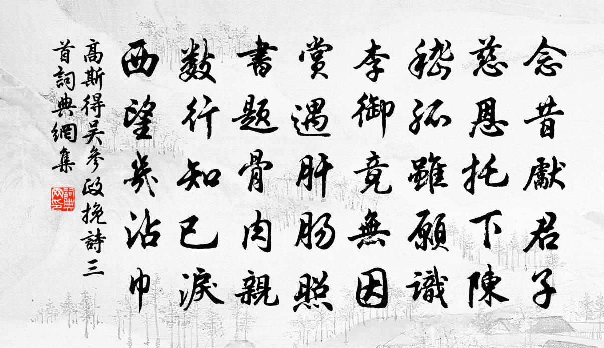 詩詞名句歷史字典書法欣賞書法字典國語詞典說文解字康熙字典古漢語字典標 題 作 者 詩 句 吳參政輓詩三首作者:高斯得 朝代:宋代吳參政輓詩三首原文念昔先君子,慈恩托下陳。嵇孤雖願識,李御竟無因。賞遇肝腸照,書題骨肉親。數行知已淚,西望幾沾巾。詩詞問答問:吳參政輓詩三首的作者是誰?答:高斯得問:吳參政輓詩三首寫於哪個朝代?答:宋代高斯得吳參政輓詩三首書法欣賞吳參政輓詩三首書法作品詩詞推薦襄陽樂楊巨源〔唐代〕閒隨少年去,試上大堤游。畫角棲烏起,清弦過客愁。碑沉楚山石,珠徹漢江秋。處處風情好,盧家更上樓。海月堂觀濤胡仲弓〔宋代〕青天與海連,羲娥代吞吐。封姨助餘威,陽侯倏起舞。或奔千丈龍,或轟萬疊鼓。蓬弱此路通,只界一斥鹵。浩浩送文子赴闕陳亮〔宋代〕直排閶闔挽天潢,到得雲章自帝鄉。電抉雷掀驚偉特,韻成鈞奏快鏗鏘。紫泥新拜絲綸寵,前席行依日月光。禁侍朝中措趙彥端〔宋代〕燒燈已過禁菸前。春信遞相傳。柳暗乍迷津路,花暄欲照江天。天涯賓主,相逢老矣,一笑歡然。晚歲許同廬社,自頌孟珙〔宋代〕有生必有滅,無庵無可說。踢倒玉崑崙,夜半紅日出。昭陵六馬唐文皇戰馬也琢石象之立昭陵前客持張耒〔宋代〕天將劃隋亂,帝逢六龍來。森然風雲姿,颯爽毛骨開。飆馳不及視,山立儼莫回。長鳴馳八表,擾擾萬駑駘。秦王望終南山李世民〔唐代〕重巒俯渭水,碧嶂插遙天。出紅扶嶺日,入翠貯岩煙。疊松朝若夜,復岫闕疑全。對此恬千慮,無勞訪九仙。訪隱李商隱〔唐代〕路到層峰斷,門依老樹開。月從平楚轉,泉自上方來。薤白羅朝饌,松黃暖夜杯。相留笑孫綽,空解賦天台。七夕(一本有寄懷二字)竇常〔唐代〕露盤花水望三星,仿佛虛無為降靈。斜漢沒時人不寐,幾條蛛網下風庭。竇常楚塞餘春聽漸稀,斷猿今夕讓沾衣。台頭寺送宋希元蘇軾〔宋代〕相從傾蓋只今年,送別南台便黯然。人夜更歌金縷曲,他時莫忘角弓篇。三年不顧東鄰女,二頃方求負郭田。我欲過雁汊岳珂〔宋代〕駢集千艘岸,喧拿百吏聲。黃旗優仕賈,白奪困商程。吳楚方憂蹙,研桑謾計贏。坐觀還一笑,關市古無征。浪淘沙晏幾道〔宋代〕小綠間長紅,露蕊煙叢。花開花落昔年同。惟恨花前攜手處,往事成空。山遠水重重,一笑難逢。已拼長在別離中秦州北山觀留詩呂岩〔唐代〕石池清水是吾心,剛被 * 倒沉。一到邽山宮闕內,銷閒澄慮七弦琴。范覺民輓詞四首張嵲〔宋代〕舊陰交蓋處,草草遂離群。何意終天別,居然此地分。豐盈宜上壽,鼎盛忽西曛。遙想天台路,悲笳慘暮雲。月下獨酌四首李白〔唐代〕花間一壺酒,獨酌無相親。舉杯邀明月,對影成三人。月既不解飲,影徒隨我身。暫伴月將影,行樂須及春。我歌和董伯玉不向東山久韻吳芾〔宋代〕塵緣嗟未斷,俗事頗相關。雖懷林下趣,坐失山中閒。時信清夜裡,夢繞雲水灣。寄語猿鶴伴,明朝歸故山。多雨仇遠〔宋代〕菜色青肥麥漸黃,雨多泥滑野畦荒。官田昨夜方車水,早起看來又渺茫。憶賈閬仙潘閬〔宋代〕風雅道何玄,高吟憶閬仙。人雖終百歲,君合壽千年。骨已西埋蜀,魂應北入燕。不知天地內,誰為讀遺編。為增城丞張元輔賦博見亭曾豐〔宋代〕東山未為高,坐覺魯之小。更上泰山巔,天下不勝眇。公作如是觀,所學胡可料。父兄自磨磋,師友相揉矯。猶恐悼玉溪張九成〔宋代〕聞名四十載,茲地忽相逢。每聽談前事,相看淚滿胸。干戈今偃息,詩酒曷從容。寂寞千秋恨,新阡植萬松。名句推薦何期今日酒,忽對故園花。文森《九日》 女曰雞鳴,士曰昧旦。佚名《女曰雞鳴》 牛羊自歸村巷,童稚不識衣冠。王維《田園樂七首·其四》 金陵子弟來相送,欲行不行各盡觴。李白《金陵酒肆留別》 小來思報國,不是愛封侯。岑參《送人赴安西》 形在江海之上,心存魏闕之下劉勰《文心雕龍·神思》 權者,人莫離也。來俊臣《羅織經·控權卷第四》 雄州霧列,俊采星馳。王勃《滕王閣序》 行行重行行,與君生別離。佚名《行行重行行》 君子之行,動則思義,不為利回,不為義疚范曄《後漢書·列傳·文苑列傳下》