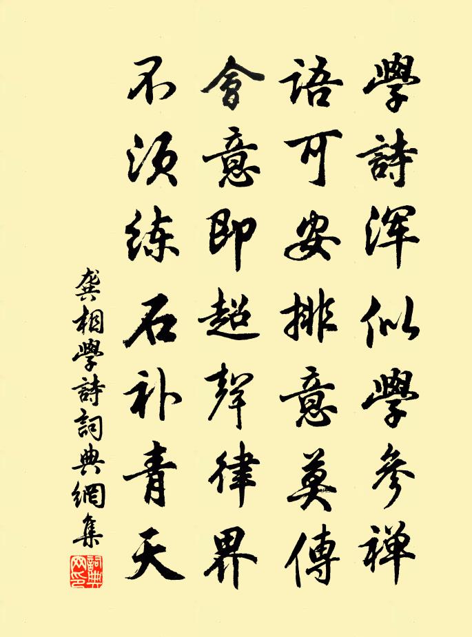 詩詞名句歷史字典書法欣賞書法字典國語詞典說文解字康熙字典古漢語字典標 題 作 者 詩 句 學詩作者:龔相 朝代:宋代學詩原文學詩渾似學參禪,語可安排意莫傳。會意即超聲律界,不須練石補青天。詩詞問答問:學詩的作者是誰?答:龔相問:學詩寫於哪個朝代?答:宋代龔相學詩書法欣賞學詩書法作品詩詞推薦齋樓之西有木花張明中〔宋代〕密蔭繁枝覆檐額,萬蕊千葩描不得。晚風不動日微烘,游蜂成陣香成國。野花有史說山礬,尺許來高塵土間。樹頭蘇木灘楊萬里〔宋代〕灘雪清濺眸,灘雷怒醒耳。落洪翠壁立,跳波碧山起。船進若戰勝,船退亦遊戲。若非篙師苦,進退皆可喜。忽逢光宗皇帝輓詩二首周必大〔宋代〕仁愛周華夏,英聰貫古今。知人符日照,裕物稱天臨。閒退親傳子,憂勞舊損心。景光昭百世,昧谷謾西沉。送程給事知越州周直孺〔宋代〕三吳冠蓋並驅弛,名德如公亦已稀。胥口沈珠唐相事,會稽懷綬漢臣歸。光華書繡家山近,浩蕩秋風畫鷁飛。十萬南柯子侯善淵〔元代〕厭靜曾居市,嫌喧卻住山。通真何處不清閒。內外逍遙,不備利名攀。蛻質空中顯,忘形物外觀。二神凝素出陽關觀雪黃庶〔宋代〕疑是天公戲,都傾海作鹽。松筠知不變,丘壑見無厭。清為詩家極,寒因酒戶添。冬溫成俗疫,得此勝針砭。賢者之孝二百四十首南陔孝子林同〔宋代〕為養還相戒,南陔昔有詩。都盧這個意,焉用補亡為。寄吳警齋胡仲弓〔宋代〕豸冠風采動簪紳,天子如何不得臣。去後赤心常體國,從前冷語頗冰人。好官盡屬時賢做,近事看來局面新。輪轍次韻洞真道士盧致遠陳著〔宋代〕虹橋關福地,門外任風濤。襟帶金鐘秀,根基鐵柱牢。安心培大棗,辦手摘蟠桃。坐鎮江山穩,新題立石高。次韻晁元忠西歸十首黃庭堅〔宋代〕麗姬封人子,弄影愛朝日。晉國始得之,泣涕甘首疾。憂危與安樂,一生誰能必。同床食芻豢,乃悔沾襟失。成王冠辭先秦無名〔先秦〕使王近於民。遠於佞。近於義。嗇於時。惠於財。親賢使能。寄子章某〔宋代〕九十衰翁七十兒,此時那可兩分離。客鄉已是三年別,人世應無百歲期。春雁北飛頻送目,夕陽西下幾顰眉。何如題安隱院曲竹林次麟〔宋代〕直節稜稜是此君,耳孫卻以曲為名。首陽山下知難種,只可斜封向管城。雨花岩頌彭澤三岩黃庭堅〔宋代〕孤峰中流分江南,馬當大雷無一帆。波濤抓空鳥不度,天花雨我讀書岩。泛蘭舟佚名〔宋代〕霜月亭亭時節,野溪開冰灼。故人信付江南,歸也仗誰托。寒影低橫,輕香暗度,疏籬幽院何在,秦樓朱閣。稱簾鄲州道中早行鄧肅〔宋代〕疏簾不下縱荷香,夢破紗廚月滿廊。笑盡一杯鞭馬走,恍疑山色是家鄉。章釣仙吹鐵笛善醫眼與齒相說法尤高姚勉〔宋代〕眼眵書冊隱廬蝸,健論誰聽落齒牙。說起元龍湖海志,扁舟又欲出蘆花。登般若台趙彥齡〔宋代〕撥置文書強作閒,佩壺聊得共躋攀。歸雲不識遊人意,遮盡江南一帶山。送趙侯之任戴雨耕〔宋代〕送君遠作羊荊州,送君西上黃鶴樓。漢晉諸公舊遊處,斷磯黃葉風雨秋。只今麾纛□南斗,整暇坐列皆公侯。江湖三登樂范成大〔宋代〕方帽沖寒,重檢校、舊時農圃。荒三徑、不知何許。但姑蘇台下,有蒼然平楚。人笑此翁,又來訪古。況五湖、元名句推薦樓頭客子杪秋後,日落君山元氣中。陳與義《登岳陽樓》 青鳥不傳雲外信,丁香空結雨中愁。李璟《攤破浣溪沙·手卷真珠上玉鉤》 深秋絕塞誰相憶,木葉蕭蕭。納蘭性德《採桑子·九日》 遺民忍死望恢復,幾處今宵垂淚痕。陸游《關山月》 薄倖郎君何日到,想自當初,莫要相逢好。施耐庵《蝶戀花·一別家山音信杳》 獵人箭底求傷雁,釣戶竿頭乞活魚。王建《寄舊山僧》 而浮生若夢,為歡幾何?李白《春夜宴桃李園序 / 春夜宴從弟桃花園序》 三千丈清愁鬢髮,五十年春夢繁華。喬吉《折桂令·客窗清明》 夜來攜手夢同游,晨起盈巾淚莫收。白居易《夢微之》 性靜情逸,心動神疲。周興嗣《千字文·全文》