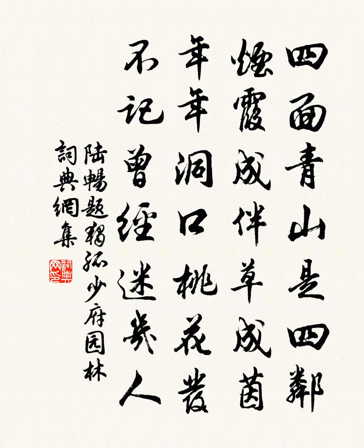 詩詞名句歷史字典書法欣賞書法字典國語詞典說文解字康熙字典古漢語字典標 題 作 者 詩 句 題獨孤少府園林作者:陸暢 朝代:唐代題獨孤少府園林原文四面青山是四鄰,煙霞成伴草成茵。年年洞口桃花發,不記曾經迷幾人。詩詞問答問:題獨孤少府園林的作者是誰?答:陸暢問:題獨孤少府園林寫於哪個朝代?答:唐代問:題獨孤少府園林是什麼體裁?答:七絕陸暢題獨孤少府園林書法欣賞題獨孤少府園林書法作品注釋全唐詩:卷478-26詩詞推薦夜月渡江沈德潛〔清代〕萬里金波照眼明,布帆十幅破空行。微茫欲沒三山影,浩蕩還流六代聲。水底魚龍驚靜夜,天邊牛斗轉深更。長風高士詠臺佟管寧吳筠〔唐代〕吾嘉台孝威,樂道隱岩穴。吾尚管幼安,棲真養高節。採藥聊自給,觀書任所悅。風塵不可混,真素比松雪。送朱叔止守南劍樓鑰〔宋代〕槜李曾蜚剸劇聲,貳車仍贊虎頭城。朱轓小試承流手,要繼桐鄉循吏名。踏莎行杜安世〔宋代〕閒院鞦韆,又還拆了。綠苔遍地青春老。畫樓日晚燕歸巢,紅稀翠盛梅初小。窈窕身輕,怎禁煩惱。羅衣漸減怯風聽鼓琴王九齡〔宋代〕至音不傳徒按譜,不傳之妙心自許。手揮五弦目飛鴻,千載流風如接武。鶉衣百年甘藍縷,鬢雪浸浸用心苦。我知淳熙十二年加上太上皇帝太上皇后尊號十一首佚名〔宋代〕二德同尊,兩耀齊光。巍巍煌煌,不球亦彰。實茂號榮,玉振金相。於萬斯年,既壽且昌。德壽宮慶壽口號十篇楊萬里〔宋代〕甘露祥風天上來,今回恩數賽前回。都將四海歡聲里,釀作慈皇萬壽杯。送鮮于帥三首吳泳〔宋代〕時事牽連卒未休,三邊烽火又驚秋。養鷹未得鷹揚力,豢虎終懷虎視憂。面勢只緣前局誤,肘方合向古人求。玉關白微時募縣小吏入令臥內嘗驅牛經堂下令妻怒…以詩謝雲李白〔唐代〕素麵倚欄鉤,嬌聲出外頭。若非是織女,何得問牽牛。送僧歸山劉言史〔唐代〕楚俗翻花自送迎,密人來往豈知情。夜行獨自寒山寺,雪徑泠泠金錫聲。娥江市陸游〔宋代〕小聚依江近,支流入浦分。荒寒孤店雨,零亂野祠雲。薄餉炊畲粟,珍烹采澗芹。年來去健羨,摩腹自欣欣。相和歌辭輓歌孟雲卿〔唐代〕草草門巷喧,塗車儼成位。冥寞何所須,盡我生人意。北邙路非遠,此別終天地。臨穴頻撫棺,至哀反無淚。爾形送之書記釋慧遠〔宋代〕大用現前全體是,聖凡情盡影難留。缽盂根底三千界,拄杖頭邊四百州。雲作伴,月為儔。到家別有通天路,把定生查子洪适〔宋代〕十月到盤洲,小小陽春節。晚菊自爭妍,誰管人心別。木末簇芙蓉,禁得霜如雪。心賞四時同,不與痴人說。和高吉父六絕杜范〔宋代〕端為稽田賦未均,一時板籍盡更新。三年敢作賢勞嘆,政恐才疎負邑人。前調(詠鴛鴦菊、雙心而白、秋晚始開)楊冠卿〔宋代〕金蕊飄殘。江城秋晚,月冷霜寒。一種幽芳,雕冰鏤玉,舞鳳翔鸞。悠然靜對南山。笑瓊沼、鴛飛翠瀾。小玉驚呼賀龐少尹除太常少卿賈島〔唐代〕太白山前終日見,十旬假滿擬秋尋。中峰絕頂非無路,北闕除書阻入林。朝謁此時閒野屐,宿齋何處止鳴砧。省中謝郟亶秘校見訪於鍾山之廬王安石〔宋代〕誤有聲名只自慚,煩君跋馬過茅檐。已知原憲貧非病,更許莊周知養恬。世事何時逢坦蕩,人情隨分值猜嫌。誰能六歌文天祥〔宋代〕我生我生何不辰,孤根不識桃李春。天寒日短重愁人,北風隨我鐵馬塵。初憐骨肉鍾奇禍,而今骨肉相憐我。汝在司中司命五首佚名〔宋代〕雲兮飄飄,風兮稜稜。飈馭返空,杲日來升。歸旎揚揚,眾樂鏘鏘。我神式歡,惠我嘉祥。名句推薦飲酒莫辭醉,醉多適不愁。高適《淇上送韋司倉往滑台》 殘酒憶荊高,燕趙悲歌事未消。陳維崧《南鄉子·邢州道上作》 倍道而妄行,則天不能使之吉。荀子《荀子·天論》 父兄教子弟,必正其身以率子,無庸徒事言詞也。王永彬《圍爐夜話·第三三則》 紅橋路,正一派、畫船蕭鼓中流住。納蘭性德《摸魚兒·午日雨眺》 失意還獨語,多愁只自知。張籍《薊北旅思 / 送遠人》 筆落驚風雨,詩成泣鬼神杜甫《寄李十二白二十韻》 悲懷感物來,泣涕應情隕。潘安《悼亡詩三首》 小人錯其在己者,而慕其在天者。荀子《荀子·天論》 獨自淒涼還自遣,自製離愁。龔自珍《浪淘沙·寫夢》