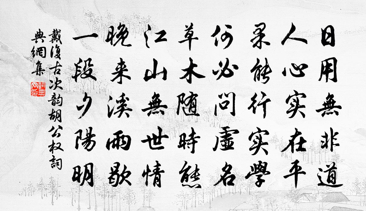 詩詞名句歷史字典書法欣賞書法字典國語詞典說文解字康熙字典古漢語字典標 題 作 者 詩 句 次韻胡公權作者:戴復古 朝代:宋代次韻胡公權原文日用無非道,人心實在平。果能行實學,何必問虛名。草木隨時態,江山無世情。晚來溪雨歇,一段夕陽明。詩詞問答問:次韻胡公權的作者是誰?答:戴復古問:次韻胡公權寫於哪個朝代?答:宋代問:戴復古的名句有哪些?答:戴復古名句大全戴復古次韻胡公權書法欣賞次韻胡公權書法作品詩詞推薦朝陽穿破衲二首釋智朋〔宋代〕襤襂衣,能多少。破不盡,補不了。新羅夜半日輪紅,線路何曾穿得透。西江月馬鈺〔元代〕臥化勝如坐化,修行所貴真常。假軀難以做馨香。何必臨歸著要。說破飛升一著,成仙只是神光。天宮無用臭皮囊六十六白居易〔唐代〕七十欠四歲,此生那足論。每因悲物故,還且喜身存。安得頭長黑?爭教眼不昏?交遊成拱木,婢僕見曾孫。瘦覺四和項安世〔宋代〕周家石鼓嵯峨,從臣才藝心多。所期喚起雅頌,渠止鐫成隸科。伐雙谷蘇轍〔宋代〕芳蘭非不嘉,當門自宜鋤。矧此惡木陰,久妨長者車。僕夫礪尋斧,告 * 方除。久持不忍意,柯條益扶疏。植根雜劇·虎牢關三戰呂布鄭光祖〔元代〕第一折(沖末袁紹領卒子上,雲)駿馬靡鞍紫錦袍,臨軍能識陣雲高。等閒贏得食天祿,願竭丹心輔聖朝。某乃冀山水圖王冕〔元代〕我生愛看真山水,眼底崎嶔每自諳。絕壑臥雲留宿雨,高林浮翠出晴嵐。青山近屋多於簇,白石攢沙小似蚶。展卷冬夜有感李新〔宋代〕蓼蟲常食苦,旅雁自知寒。談士惜捲舌,將軍解愁鞍。雪霜滿天冬夜永,地爐無火青燈殘。功名富踐苦不早,一年暮春雜興葛起耕〔宋代〕小隱山林羽已成,市朝聲利讓渠爭。是非每向靜中見,悔吝多從動處生。且約蒼官陪竹友,共邀歡伯訪梅兄。歲寒酬和元九東川路詩十二首。亞枝花白居易〔唐代〕山郵花木似平陽,愁殺多情驄馬郎。還似昇平池畔坐,低頭向水自看妝。四安道中所見牟巘五〔宋代〕人向長安渡口歸,長安不見但云霏。只應白鷺曾相識,船到前頭更不飛。霜風陸游〔宋代〕霜風近海夜颼颼,敢效庸人念褐裘。關吏雖通西域貢,王師猶護北平秋。黃旗馳奏有三捷,金印酬功多列侯。願補牽牛花三首楊萬里〔宋代〕曉思歡欣晚思愁,繞籬縈架太嬌柔。木犀未發芙蓉落,買斷西風恣意秋。從莫萬安覓柑子並以玉山沙藥合寄之六言三首趙蕃〔宋代〕我識令君人物,傳柑合侍清都。寂寞當思林下,有時病渴猶須。啜茶示兒輩陸游〔宋代〕圍坐團欒且勿嘩,飯余共舉此甌茶。麤知道義死無憾,已迫耄期生有涯。小圃花光還滿眼,高城漏鼓不停撾。閒人三高祠袁聘儒〔宋代〕功成但可將身去,逃難安貧適所遭。三子有靈應共笑,一時何意故為高。廬山寇準〔宋代〕江南到處佳山水,廬阜丹霞是勝游。獨抱古琴攜竹杖,若逢絕境莫歸休。阮籍嘯台(在尉氏)蘇軾〔宋代〕阮生古狂達,遁世默無言。猶余胸中氣,長嘯獨軒軒。高情遺萬物,不與世俗論。登臨偶自寫,激越盪乾坤。醒為後苦雨行方回〔宋代〕七晝夜雨可已否,五更屋角萬馬走。擊碎屋瓦如拳然,三橋街中人乘船。五斗陳米已萬錢,糴且無之矧借旃。一檐送游大冶歸建陽王炎〔宋代〕震澤黃柑熟,苕溪紫蟹肥。天寒留客舍,歲晚念親闈。抱負須時用,行藏與志違。臨分話情愫,衰謝亦謀歸。名句推薦嗚呼!楚雖三戶能亡秦,豈有堂堂中國空無人陸游《金錯刀行》 燕支長寒雪作花,蛾眉憔悴沒胡沙。李白《王昭君二首》 斷崖蒼蘚對立久,凍雨為洗前朝悲。黃庭堅《書摩崖碑後》 其持之有故,其言之成理。荀子《荀子·非十二子》 不負東籬約,攜尊過草堂。妙信《九日酬諸子》 妾身悔作商人婦,妾命當逢薄倖夫。徐再思《陽春曲·閨怨》 千里黃雲白日曛,北風吹雁雪紛紛。高適《別董大二首》 市恩不如報德之為厚,要譽不如逃名之為適,矯情不如直節之為真。陳繼儒《小窗幽記·集醒篇》 擬泛煙中片葉,但兩湖佳處,任風吹泊徐燦《念奴嬌·西湖雨感次素庵韻》 忘卻成都來十載,因君未免思量。蘇軾《臨江仙·送王緘》