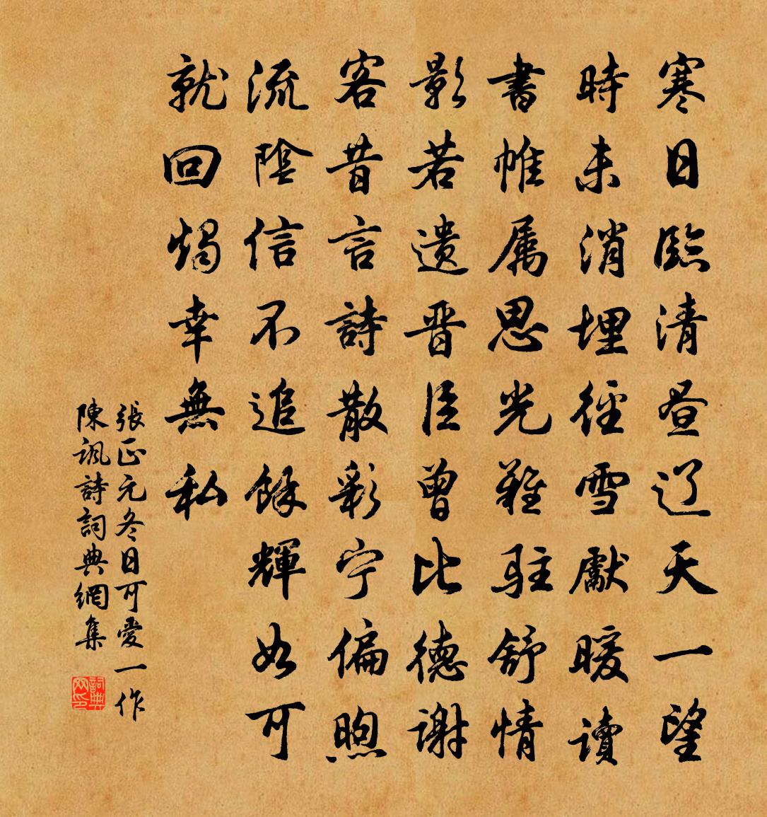詩詞名句歷史字典書法欣賞書法字典國語詞典說文解字康熙字典古漢語字典標 題 作 者 詩 句 冬日可愛(一作陳諷詩)作者:張正元 朝代:唐代冬日可愛(一作陳諷詩)原文寒日臨清晝,遼天一望時。未消埋徑雪,先暖讀書帷。屬思光難駐,舒情影若遺。晉臣曾比德,謝客昔言詩。散彩寧偏煦,流陰信不追。餘輝如可就,回燭幸無私。詩詞問答問:冬日可愛(一作陳諷詩)的作者是誰?答:張正元問:冬日可愛(一作陳諷詩)寫於哪個朝代?答:唐代問:冬日可愛(一作陳諷詩)是什麼體裁?答:五排張正元冬日可愛(一作陳諷詩)書法欣賞冬日可愛(一作陳諷詩)書法作品注釋全唐詩:卷319-20詩詞推薦相逢行唐寅〔明代〕相逢狹邪間,車窒馬不旋。雖言異鄉縣,豈非往世緣。脫轂且卷鞭,高揖問君廛。女弟新承寵,阿大李延年。何以柬陳宗之趙汝績〔宋代〕略約東風客袖寒,賣花聲里立闌乾。有錢不肯沽春酒,旋買唐詩對雨看。以朝雞送樊氏兄弟效魯直體作兩絕王灼〔宋代〕塵柄知君談亹亹,雞群笑我喚朱朱。曉窗試渠作人語,絕勝蠹簡用工夫。登壽沙和抑齋韻李曾伯〔宋代〕境占祝融勝,鎮從盤古為。車航一都會,鼎鼐幾樓台。遠水便鷗狎,前峰約雁回。當思牧民意,保養甚於胎。次韻谷口鄭東子見寄戴復古〔宋代〕自笑詩人多好酒,君能不飲任樽空。勸君莫倚醒醒眼,卻笑傍人醉面紅。題倪處士舊居許渾〔唐代〕儒翁九十餘,舊向此山居。生寄一壺酒,死留千卷書。檻摧新竹少,池淺故蓮疏。但有子孫在,帶經還荷鋤。紹興祀太社太稷十七首佚名〔宋代〕土發而祭,農祥是祈。籩豆加篚,典禮有興。惟茲珪幣,用告肅祗。神靈降鑒,錫我繁釐。鄂忠武王書簡帖贊岳珂〔宋代〕昔李四平在鳳翔,嘗以直道致主。慕魏鄭公,雖叔度之進言,猶毅然而不從。謂幸備於將相,詎愛身而苟容。猗歟驀山溪呂渭老〔宋代〕元宵燈火。月淡遊人可。攜手步長廊,又說道、傾心向我。歸來一夢,整整十年餘,人似舊,去無因,牽惹情懷破送朱仲微使君赴闕孫應時〔宋代〕聲跡周行舊,人門漢相延。謝宗康樂在,阮侄仲容賢。文獻群公側,風流晚輩先。天資超珏,心量極澄淵。世故雖泗源程企〔宋代〕泗源鬼奇且怪,鬼聲勢各喧鬼豗。虎豹鬼岩邊去,蛟龍窟里來。稍流煙作陣,初激雪成堆。派必人疏導,源應鬼鑿頌古四十四首釋師範〔宋代〕雨散雲收後,崔嵬數十峰。王維雖敏手,難落筆頭蹤。范叔剛以詩送豆粥次韻答之孫應時〔宋代〕平生畫餅復炊沙,空有飢腸不受嗟。多謝殷勤餉時節,頓忘惟悴客京華。賣書未卜來同往,厚意何時報有加。為說湖州歌九十八首 其九十五汪元量〔宋代〕東宮雪裡燕三宮,妃子殷勤把酒鍾。百十箜篌彈玉指,兩行珠翠擊金鏞。春深過黃亭李新〔宋代〕碧流未到小也五,半畝篔簹蔭紫苔。遲日暖風留不得,亂紅飛去燕銜來。春日田園雜興徐端甫〔宋代〕曉出東郊跨蹇驢,弄晴微雨潤如酥。犬依桑下鳥犍臥,鳩雜花間黃鳥呼。楊柳嫩搖風氣力,稻秧新著雨工夫。農家述韓柳詩釋智圓〔宋代〕退之排釋氏,子厚多能仁。韓柳既道同,好惡安得倫。一斥一以贊,俱令儒道伸。柳州碑曹溪,言釋還儒淳。吏部蝶戀花趙崇嶓〔宋代〕一翦微寒禁翠袂。花下重開,舊燕添新壘。風旋落紅香幣地。海棠枝上鶯飛起。薄霧籠春天欲醉。碧草澄波,的的偈頌一百四十一首釋師範〔宋代〕今朝又值四月八,天下叢林皆浴佛。清涼有令不能行,隨例大家廝淈{左氵右盾}。送張坦公方伯出塞丁澎〔清代〕老去悲長劍,胡為獨遠征?半生戎馬換,片語玉關行。亂石沖雲走,飛沙撼磧鳴。萬方新雨露,吹不到邊城。名句推薦東風兮東風,為我吹行雲使西來。李白《久別離》 君子惜名,小人愛身。來俊臣《羅織經·保身卷第七》 瑕不掩瑜、瑜不掩瑕戴聖《禮記·聘義》 竹疏虛檻靜,松密醮壇陰。張泌《女冠子·露花菸草》 士君子立言,貴平正,尤貴精詳。王永彬《圍爐夜話·第二五則》 千呼萬喚始出來,猶抱琵琶半遮面。白居易《琵琶行 / 琵琶引》 歸師勿掩,窮寇莫追。羅貫中《三國演義·第九十五回》 春風又綠江南岸,明月何時照我還?王安石《泊船瓜洲》 遠看山有色,近聽水無聲王維《畫》 嗟萬事難忘,惟是輕別。周邦彥《浪淘沙慢·曉陰重》