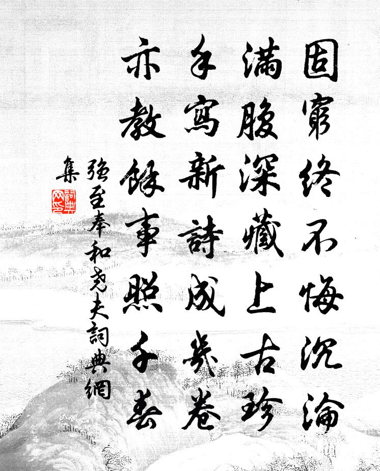 詩詞名句歷史字典書法欣賞書法字典國語詞典說文解字康熙字典古漢語字典標 題 作 者 詩 句 奉和堯夫作者:強至 朝代:宋代奉和堯夫原文固窮終不悔沉淪,滿腹深藏上古珍。手寫新詩成幾卷,亦教餘事照千春。詩詞問答問:奉和堯夫的作者是誰?答:強至問:奉和堯夫寫於哪個朝代?答:宋代強至奉和堯夫書法欣賞奉和堯夫書法作品詩詞推薦曉日韓偓〔唐代〕天際霞光入水中,水中天際一時紅。直須日觀三更後,首送金烏上碧空。郊外見梅再用前韻三首王炎〔宋代〕四山有雪未全融,蓓蕾梢頭茁小紅。也欲索花同一笑,蒼顏羞澀見春風。再用元韻二首王炎〔宋代〕倦遊莫忘大刀頭,老去行藏要熟謀。少病若能如萬福,上書安用學千秋。碧雲合處來何緩,黃鶴飛時挽不留。後夜上范秘監劉過〔宋代〕疇昔經行路,黃山更一過。天涯知己少,歲晚客愁多。路斷車生角,冰堅水不波。使君森畫戟,聞此盍如何。簟送人詩代簡二首吳儆〔宋代〕一幅冰紈織翠筠,風涵秋水碧鱗鱗。北窗高臥正須此,卷似閒曹吏隱人。枕上四首呈子景舒劉宰〔宋代〕籬邊把菊玩遺芳,未肯從渠入醉鄉。五字句中窺屈宋,七弦聲里到羲皇。簡勝上人張至龍〔宋代〕林深嵐氣重,一犬吠寒煙。高思天雲外,新房柏樹邊。愛蒲尋石種,惜茗濾泉煎。昔創如來殿,老於師一年。八月十一日晨興張耒〔宋代〕老人秋少睡,禪誦每晨興。鄰碓舂殘月,床蛩語暗燈。高林鳥聲起,幽草露華凝。筇杖兼禪榻,生涯一野僧。次韻趙主簿雪詩十韻二首項安世〔宋代〕墮地白初形,當空黑如影。喧豗復排拶,混沌方溟涬。惟餘塔可辨,始信江南回。浩蕩海揚塵,糢糊山覆頂。梅肥吊子陵釣台毛幵〔宋代〕先生高隱事如何,豈謂功名不足多。知道故人能辨事,一竿贏得釣清波。次韻斯遠投宿招賢道店對竹再用前韻見懷二首趙蕃〔宋代〕興懷王子猷,匪但一朝夕。看君愛主意,與渠蓋加璧。詩成辱持贈,經勝梧桐滴。我句本非儔,分光藉鄰壁。挽尤端明四首李曾伯〔宋代〕憶昨趨湘水,公歸問錫山。惜時為俗累,欠往拜師顏。不復親溫厲,疇其念險艱。莫持雞炙去,老淚不勝潸。偈頌一百零九首釋可湘〔宋代〕了了無言,驀胸一拳。蜃江水急,不許泊船。送德安五休司戶孫應時〔宋代〕相逢何必早,傾蓋已知心。璞玉常金質,高山流水音。眼中江漢闊,別後雪雲深。莫作窮途難,功名始自今。初除尚書郎,脫刺史緋白居易〔唐代〕親賓相賀聞何如?服色恩光盡反初。頭白喜拋黃草峽,眼明驚拆紫泥書。便留朱紱還鈴閣,卻著青袍侍玉除。無奈郫縣春日吟吳泳〔宋代〕素絲五緎詠羔羊,且是公餘燕日長。黃妳味甘逢孔聖,黑甜睡美謁羲皇。自維揚回儀真沈大椿〔宋代〕一官安敢問青膻,形影相看祗自憐。黃鵠已登清漢去,白鷗空占淺沙眠。杏花開遍蕪城雨,柳色渾鋪瓜渚煙。老眼齊雲亭憑高有感宋祁〔宋代〕憑高極目意茫然,坐對淮南搖落天。空把歸心同客雁,遂將緘口伴寒蟬。一罇醒醉黃花外,萬事蕭條白髮前。誰取護國寺秋吟八首白玉蟾〔宋代〕竹手擎雲重,松肩荷月高。煙收天地闊,醉目數秋毫。王原慶有詩寄謝丈簽判子暢尉曹具以見及次韻趙蕃〔宋代〕相望千里舊聞風,何意論交邂逅中。別去傷心念風雨,詩來滿眼眩青紅。通家契好君能記,末路飄零我亦同。江左名句推薦晴日暖風生麥氣,綠陰幽草勝花時。王安石《初夏即事》 憐夜冷孀娥,相伴孤照。吳文英《花犯·謝黃復庵除夜寄古梅枝》 聖人之道,寬而栗,嚴而溫,柔而直,猛而仁。劉安及其門客《淮南子·汜論訓》 匈奴草黃馬正肥,金山西見煙塵飛,漢家大將西出師。岑參《走馬川行奉送出師西征 / 走馬川行奉送封大夫出師西征》 辛勤好似蠶成繭,繭老成絲蠶命休。馮夢龍《醒世恆言·卷三十五》 君子立身,雖雲百行,唯誠與孝最為其首。魏徵《隋書·帝紀·卷二》 身既死兮神以靈,魂魄毅兮為鬼雄。屈原《國殤》 大凡物不得其平則鳴韓愈《送孟東野序》 清明時節雨聲嘩。潮擁渡頭沙。張炎《朝中措·清明時節》 木落雁南度,北風江上寒。孟浩然《早寒江上有懷 / 早寒有懷 / 江上思歸》