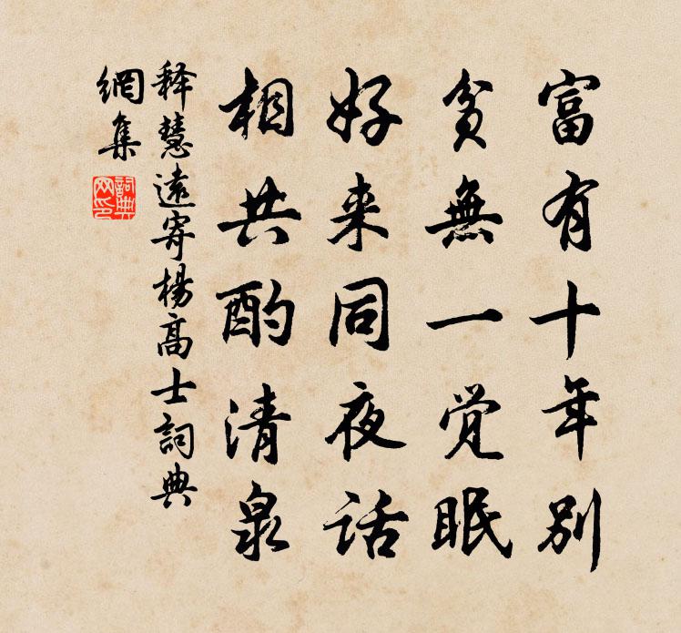 詩詞名句歷史字典書法欣賞書法字典國語詞典說文解字康熙字典古漢語字典標 題 作 者 詩 句 寄楊高士作者:釋慧遠 朝代:宋代寄楊高士原文富有十年別,貧無一覺眠。好來同夜話,相共酌清泉。詩詞問答問:寄楊高士的作者是誰?答:釋慧遠問:寄楊高士寫於哪個朝代?答:宋代釋慧遠寄楊高士書法欣賞寄楊高士書法作品詩詞推薦送昌言舍人得告蜀三首司馬光〔宋代〕迢遞銅梁道,凝嚴青鎖闈。負書當日去,鳴玉此時歸。鄉樹迎朱轂,江花照錦衣。臨邛不足並,榮耀古今稀。癸酉春暮鍾信甫寄詩次其韻馬廷鸞〔宋代〕深閉柴門水竹村,是非榮辰總忘言。捨生只懼本心失,犯患誰知尊足存。居士病來惟臥室,翟公客去莫書門。人心酬樂天齋滿日裴令公置宴席上戲贈劉禹錫〔唐代〕一月道場齋戒滿,今朝華幄管弦迎。銜杯本自多狂態,事佛無妨有佞名。酒力半酣愁已散,文鋒未鈍老猶爭。平陽題僧壁(一本有和韋蟾三字)段成式〔唐代〕有僧支頰撚眉毫,起就夕陽磨剃刀。到此既知閒最樂,俗心何啻九牛毛。詠懷鄭谷〔唐代〕迂疏雖可欺,心路甚男兒。薄宦渾無味,平生粗有詩。淡交終不破,孤達晚相宜。直夜花前喚,朝寒雪裡追。竹聲雨花台唐仲友〔宋代〕竟夕飛花一尺圍,今朝晴色荷神禧。共尋蕭寺因乘興,直上高台是愛奇。鳷鵲余寒通北極,鳳凰斜照落西垂。詩成水調歌頭王奕〔宋代〕長江衣帶水,歷代鼎彝功。服定衣冠禮樂,聊爾就江東。追憶金戈鐵馬,保以油幢玉壘,熢燧幾秋風。更有當頭著東武吟行陸機〔魏晉〕投跡短世間。高步長生闈。濯發冒雲冠。浣身被羽衣。飢從韓眾餐。寒就佚女棲。早起楊厚〔唐代〕星漢轉寒更,伊余索寞情。鍾催歸夢斷,雁引遠愁生。危壁蘭光暗,疏簾露氣清。閒庭聊一望,海日未分明。和集賢相公西溪侍宴觀競渡吳融〔唐代〕片水聳層橋,祥煙靄慶霄。晝花鋪廣宴,晴電閃飛橈。浪疊搖仙仗,風微定彩標。都人同盛觀,不覺在行朝。勉弟子還山頌張繼先〔宋代〕昔劫因緣今劫會,昨日顏容今日改。世間滄海盡桑田,慎勿重來呈傀儡。相和歌辭。王昭君顧朝陽〔唐代〕莫將鉛粉匣,不用鏡花光。一去邊城路,何情更畫妝。影銷胡地月,衣盡漢宮香。妾死非關命,都緣怨斷腸。石船澗陳岩〔宋代〕不怕掀天浪拍春,石船系在古溪濱。縱然水繞東流岸,猶勝虛舟誤觸人。詠史下荀彧陳普〔宋代〕河濟太山猶是漢,匆匆把作賊關中。久知天下無劉氏,不料人間有孔融。清心鏡 贈馬先生馬鈺〔元代〕好爽利,好豁暢。坐臥住行,逍遙坦蕩。細尋思、名利之人,怎知此味況。向閒中,搜修養。鍛鍊一顆,神珠晃朗年老逢春十三首邵雍〔宋代〕年老逢春認破春,破春不用苦傷神。身心自有安存地,草木焉能媚惑人。此日榮為佗日瘁,今年陳是去年新。世間大行皇帝輓詞五首許月卿〔宋代〕從諫如堯禹,聞言若舜文。五臣躋□□,三誥斥□君。聖度天同廣,忠謀日有聞。甲辰親策處,贛論玉顏欣。贈林逋處士釋智圓〔宋代〕深居猿鳥共忘機,荀孟才華鶴氅衣。滿砌落花春病起,一湖明月夜漁歸。風搖野水青蒲短,雨過閒園紫蕨肥。塵土樂府雜詠六首雙吹管陸龜蒙〔唐代〕長短裁浮筠,參差作飛鳳。高樓微月夜,吹出江南弄。贈率子連三首王祜〔宋代〕古星當崖映日間,年年常伴白雲閒。餱糧丹火何從出,四面無人見下山。名句推薦上苑風煙好,中橋道路平。白居易《洛橋寒食日作十韻》 柳花驚雪浦,麥雨漲溪田。李賀《南園十三首》 八佾舞於庭,是可忍也,孰不可忍也?孔子弟子《論語·八佾篇》 淡淡橫朝煙,脈脈深秋思。劉道著《湘江秋曉》 奢者富而不足,何如儉者貧而有餘。洪應明《菜根譚·概論》 此夜星繁河正白,人傳織女牽牛客。沈佺期《七夕曝衣篇》 有耳莫洗潁川水,有口莫食首陽蕨李白《行路難三首》 執道循理,必從本始,順為經紀,禁伐當罪,必中天理。佚名《黃帝四經·經法·四度》 喜得故人同待詔,擬沽春酒醉京華。高啟《清明呈館中諸公》 名無固實,約之以命實,約定俗成,謂之實名。荀子《荀子·正名》