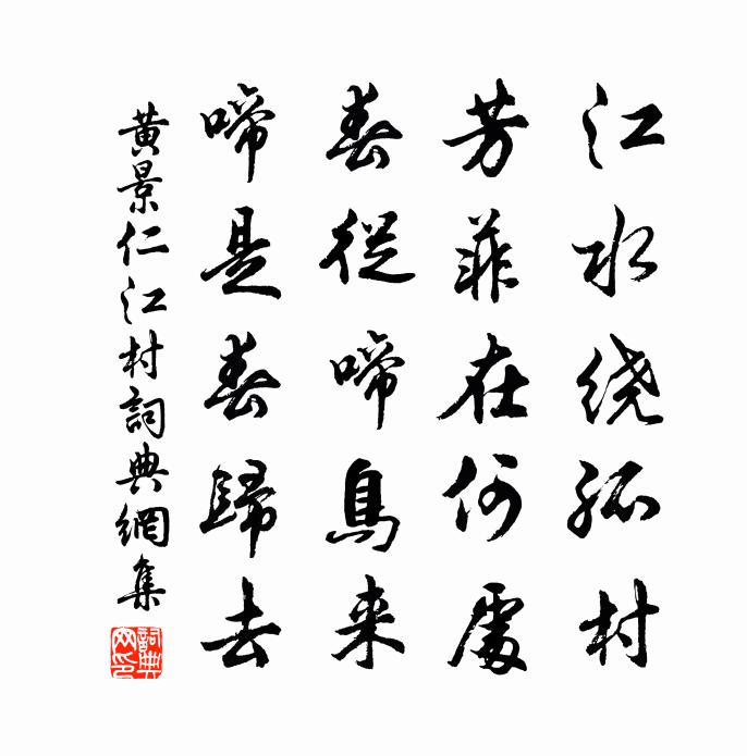 詩詞名句歷史字典書法欣賞書法字典國語詞典說文解字康熙字典古漢語字典標 題 作 者 詩 句 江村作者:黃景仁 朝代:清代江村原文江水繞孤村,芳菲在何處?春從啼鳥來,啼是春歸去。詩詞問答問:江村的作者是誰?答:黃景仁問:江村寫於哪個朝代?答:清代問:黃景仁的名句有哪些?答:黃景仁名句大全黃景仁江村書法欣賞江村書法作品詩詞推薦勸漢老弟飲酒虞儔〔宋代〕尊前一醉莫辭頻,三萬場當歲十旬。況有好詩能泣鬼,寧無妙畫可通神。快呼左手持螯客,莫著傾身障鹿人。綠漲山居鮑溶〔唐代〕窈窕垂澗蘿,蒙茸黃葛花。鴛鴦憐碧水,照影舞金沙。迎春花董嗣杲〔宋代〕破寒乘暖迓東皇,簇定剛條爛熳黃。野艷飄搖金譽嫩,露叢勾引蜜蜂狂。萬千花事從頭起,九十韶光有底忙。歲歲和西仲秋日聞鶯詩仇遠〔宋代〕不待風霜剪碧林,柳陰忽見一梭金。似傳西帝宸游信,空惹東窗夢覺心。暫輟笙歌聊試聽,既無桃杏莫須吟。舊交送超禪人歸省親釋心月〔宋代〕參玄曾未造玄微,肯學新豐十不歸。歸舉清涼答佛話,教娘知有祖師機。始發鄂渚寄表臣二首劉禹錫〔唐代〕祖帳管弦絕,客帆西風生。回車已不見,猶聽馬嘶聲。曉發柳林戍,遙城聞五鼓。憶與故人眠,此時猶晤語。金陵官舍後圃散二首楊萬里〔宋代〕旋種花窠二百株,不知種了有花無。阿誰便向春工說,急搗紅藍染玉酥。同程郎中父子月陂上閒步吟邵雍〔宋代〕草軟沙平風細溜,雲輕日淡柳低挼。狂言不記道何事,劇飲未嘗如此杯。景好只知閒信步,朋歡那覺太開懷。必期和邢惇夫秋懷十首黃庭堅〔宋代〕王度無畦畛,包荒用馮河。秦收鄭渠成,晉得楚材多。用人當其物,不但軸與薖。六通而四闢,玉燭四時和。寄趙茂實大著二首戴復古〔宋代〕詞臣工筆墨,亦足致功勳。細草平戎策,兼為諭蜀文。一言關治亂,千載有知聞。應笑垂綸叟,愁吟對海雲。挽宜人趙氏程珌〔宋代〕分胃 * 媛,來嬪相國孫。孝慈山上梓,法度潤濱蘩。鳳去簫沉響,鸞空鏡掩痕。家庭薰沐事,千古鏡南軒。隆蔭堂黃公度〔宋代〕意得壺觴外,心清杖屨間。簿書休吏早,花鳥向人閒。頌證道歌證道歌釋印肅〔宋代〕根境法中虛捏怪,見說是師便禮拜。汝從甚處到其間,且作街坊兼化菜。頌古十一首釋鹹傑〔宋代〕百戰場中舞纛旗,將軍立處十分危。遊人只看錐頭利,失卻吹毛總不知。送百丈專使釋重顯〔宋代〕大雄孤頂曾遐舉,遍索諸方誰敢拒。乳竇峰前捋虎鬚,再得完全又歸去。三日侍華光殿曲水宴代人應詔詩 四謝朓〔南北朝〕朝陽有乾。布葉萋萋。思皇威矣。鵷羽高棲。出馳先輅。入秉介珪。瞻秦望井。建魯分奎。句范彥輝〔宋代〕何當日月明,痛洗蒼生病。春貼子皇后閣五首真德秀〔宋代〕眼窺春暖欲工眠,梅妝點雪斗新妍。一年好處如今是,遠滕清明寒食天。唐享昊天樂第八武則天〔唐代〕奠璧郊壇昭大禮,鏘金拊石表虔誠。始奏承雲娛帝賞,復歌調露暢韶英。相和歌辭。江南弄王勃〔唐代〕江南弄,巫山連楚夢,行雨行雲幾相送。瑤軒金谷上春時,玉童仙女無見期。紫露香菸眇難托,清風明月遙相思。名句推薦二月湖水清,家家春鳥鳴。孟浩然《春中喜王九相尋 / 晚春》 碧毯線頭抽早稻,青羅裙帶展新蒲。白居易《春題湖上》 以身教者從,以言教者訟。范曄《後漢書·列傳·第五鍾離宋寒列傳》 春城無處不飛花,寒食東風御柳斜。韓翃《寒食 / 寒食日即事》 飛雪帶春風,裴回亂繞空。劉方平《春雪》 淒涼別後兩應同,最是不勝清怨月明中。納蘭性德《虞美人·曲闌深處重相見》 一切都是命,半點不由人。佚名《增廣賢文·上集》 欲求生富貴,須下死工夫。佚名《增廣賢文·上集》 車遙遙兮馬洋洋,追思君兮不可忘。傅玄《車遙遙篇》 從心所欲,不逾矩。孔子弟子《論語·為政篇》