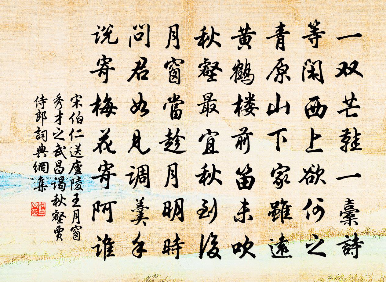 詩詞名句歷史字典書法欣賞書法字典國語詞典說文解字康熙字典古漢語字典標 題 作 者 詩 句 送廬陵王月窗秀才之武昌謁秋壑賈侍郎作者:宋伯仁 朝代:宋代原文一雙芒鞋一橐詩,等閒西上欲何之。青原山下家雖遠,黃鶴樓前笛未吹。秋壑最宜秋到後,月窗當趁月明時。問君如見調羹手,說寄梅花寄阿誰。詩詞問答問:《送廬陵王月窗秀才之武昌謁秋壑賈侍郎》的作者是誰?答:宋伯仁問:該詩寫於哪個朝代?答:宋代書法欣賞送廬陵王月窗秀才之武昌謁秋壑賈侍郎書法作品詩詞推薦偶作二首白玉蟾〔宋代〕雪後竹君子,霜前松大夫。梅殘半點白,猿叫一聲孤。聞李夷遇下第東歸因以寄贈薛能〔唐代〕囊中書是居山寫,海畔家貧乞食還。吾子莫愁登第晚,古人惟愛賤游閒。舟行散適江亭上,郡宴歌吟蠟燭間。從此上陽水窗旬宴得移字韻張九齡〔唐代〕河漢非應到,汀洲忽在斯。仍逢帝樂下,如逐海槎窺。春賞時將換,皇恩歲不移。今朝游宴所,莫比天泉池。上譙江州劉過〔宋代〕丘公鎮金陵,辛老治就口。君王神武欲籌邊,九江更使何人守。九江太守今譙侯,譙侯德量容九州。詩書禮樂晉元太平吟邵雍〔宋代〕老者得其養,幼者得其仰。勞者得其餉,死者得其葬。水調歌頭陳三聘〔宋代〕玉鑒十分滿,清露一年秋。漂流蹤跡,誰念楚尾與吳頭。此夜刮明塵眼。望極好張詩膽。何處有高樓。浩蕩銀潢冷酬姚合賈島〔唐代〕黍穗豆苗侵古道,晴原午後早秋時。故人相憶僧來說,楊柳無風蟬滿枝。襄陽樂蘇軾〔宋代〕使君未來襄陽愁,提戈入市裹氈裘。自從氈裘南渡沔,襄陽無事多春遊。襄陽春遊樂何許。峴山之陽漢江浦。使君與下夫、朋元游陳侍御園范成大〔宋代〕沙際春風卷物華,意行聊復到君家。年年我是曾來客,處處梅皆舊識花。官減不妨詩事業,地寒猶辦醉生涯。城中玉樓春劉因〔元代〕柳梢綠小梅如印。乍暖還寒猶未定。惜花長是為花愁,酒卻嫌添酒病。蠅頭蝸角都休竟。萬古豪華同一盡。東君題嚴子陵釣台章才邵〔宋代〕短櫂夷猶七里灘,人亡依舊水光寒。漢家名節君知否,盡在君家一釣竿。和郡守彭吏部按視湖亭凡二首周鍔〔宋代〕使群風味壓荊州,每為吾民樂更憂。錦里篇章推唱首,浣溪光景促遨頭。行春預約花欹帽,把酒方欣雪點裘。岳史頌古四十四首釋師範〔宋代〕同舟共賞洞庭春,終日徘徊柳岸陰。卻得漁人加櫓棹,等閒抹過碧波心。句方翥〔宋代〕山寒一杯酒,歲晚兩窮人。北望陸游〔宋代〕昔我初生歲,中原失太平。寧知墓木拱,不見塞塵清。京洛無來信,江淮尚宿兵。何時青海月,重照漢家營?冬夜讀書示子聿陸游〔宋代〕讀書萬卷不謀食,脫粟在傍書在前。要識從來會心處,曲肱飲水亦欣然。紹興享先農十一首佚名〔宋代〕大事在祀,齊潔為先。既興而升,奉以周旋。下觀而化,無敢不蠲。惟神降格,監厥精虔。春日書懷,寄東洛白二十二楊八二庶子劉禹錫〔唐代〕曾向空門學坐禪,如今萬事盡忘筌。眼前名利同春夢,醉里風情敵少年。野草芳菲紅錦地,遊絲撩亂碧羅天。心知奉答原甫見過寵示之作歐陽修〔宋代〕不作流水聲,行將二十年。吾生少賤足憂患,憶昔有罪初南遷。飛帆洞庭入白浪,墮淚三峽聽流泉。援琴寫得入此題畫山水楊汝士〔唐代〕太華峰前是故鄉,路人遙指讀書堂。如今老大騎官馬,羞向關西道姓楊。名句推薦苟得其養,無物不長;苟失其養,無物不消。孟子《孟子·告子章句上·第八節》 治強生於法,弱亂生於阿。韓非及後人《韓非子·外儲說右下》 來歲長安春事早,勸杏花、斷莫相思死。龔自珍《金縷曲·癸酉秋出都述懷有賦》 荊溪白石出,天寒紅葉稀。王維《山中》 驚風飄白日,忽然歸西山曹植《贈徐幹詩》 算韶華,又因循過了,清明時候。王雱《倦尋芳慢·露晞向晚》 思歸若汾水,無日不悠悠。李白《太原早秋》 欲加之罪,其無辭乎?左丘明《左傳·僖公·僖公十年》 無稽之言,不見之行,不聞之謀,君子慎之。荀子《荀子·正名》 過盡征鴻來盡燕,故園訊息茫然。趙長卿《臨江仙·暮春》