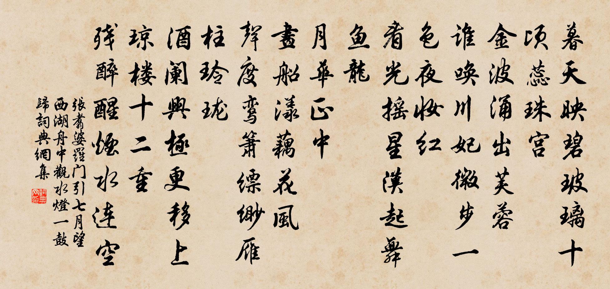 詩詞名句歷史字典書法欣賞書法字典國語詞典說文解字康熙字典古漢語字典標 題 作 者 詩 句 婆羅門引 七月望,西湖舟中觀水燈,一鼓歸作者:張翥 朝代:元代原文暮天映碧,玻璃十頃蕊珠宮。金波湧出芙蓉。誰喚川妃微步,一色夜妝紅。看光搖星漢,起舞魚龍。月華正中。畫船漾,藕花風。聲度鸞簫縹緲,雁柱玲瓏。酒闌興極,更移上、瓊樓十二重。殘醉醒、煙水連空。詩詞問答問:《婆羅門引 七月望,西湖舟中觀水燈,一鼓歸》的作者是誰?答:張翥問:該詩寫於哪個朝代?答:元代問:該詩是什麼體裁?答:詞書法欣賞婆羅門引 七月望,西湖舟中觀水燈,一鼓歸書法作品詩詞推薦送純禪者釋重顯〔宋代〕莎蘿雨滴蒼苔痕,前峰後峰啼斷猿。攜筇別我下層翠,何處靜敲仁者門。紅梅釋璉〔宋代〕嬌朱淺淺透煙光,瘦倚疏檐半出牆。雅有風情勝桃李,巧含春思避冰霜。融明醉臉籠輕暈,斂掩仙姿蹙嫩黃。旦暮秋旱繼以大風即事十首劉克莊〔宋代〕少耽章句老明農,無意為文忽自工。戲作小詩說場圃,細看似可續豳風。江梅引 寧海范明叔邀飯,覽月桂花王哲〔元代〕凌晨靜至樂倍,倚闌隈。*奇材。正是蟾宮。餘影世間來。遂得晴空甘露力,潤根*,發修條,偉又瑰。能綻粉苞項羽廟許表時〔宋代〕千載興亡莫浪愁,漢家功業亦荒丘。空餘原上虞姬草,舞盡春風未肯休。護駕泉王奕〔宋代〕岳泉匹練落雲間,萬折東流不得閒。駕到源頭猶且護,如何護不到崖山。蔣侯神歌溫庭筠〔唐代〕楚神鐵馬金鳴珂,夜動蛟潭生素波。商風颳水報西帝,廟前古樹蟠白蛇。吳王赤斧斫雲陣,畫堂列壁叢霜刃。巫娥園中開牡丹一枝朱翌〔宋代〕天下花王都洛京,清明寒食走香軿。東君欲表南來意,一朵薦然尚黃型。奉和喜雪應制徐安貞〔唐代〕兩宮齋祭近登臨,雨雪紛紛天晝陰。只為經寒無瑞色,頓教正月滿春林。蓬萊北上旌門暗,花萼南歸馬跡深。自有春江曲二首張仲素〔唐代〕家寄征河岸,征人幾歲游。不如潮水信,每日到沙頭。乘曉南湖去,參差疊浪橫。前洲在何處,霜里雁嚶嚶。次及甫覺寒洪咨夔〔宋代〕霜勒衾如水,寒於客有期。不成神女夢,空賦外孫詞。瓮暖宜桑落,冠涼怯竹皮。懸知鄱水上,冷落扊扅詩。塘閘楊萬里〔宋代〕山逢塘閘冠南中,小大高低十九峰。東畔連尖尤秀絕,一雙銅綠翠鋪茸。和新市雜詠趙希逢〔宋代〕歌聲嬌帶曉鶯啼,何處糟糠更有妻。脈脈寸心和酒悶,明朝還恐兩東西。【越調】柳營曲 賞春吳西逸〔元代〕花艷冶,柳欹斜,粉牆低畫樓人困也。庭院星列,羅綺雲疊,簇簇鬧蜂蝶。紫霞杯我輩豪俠,綠雲鬟仕女奇絕。烏過蘇岩楊萬里〔宋代〕仰望蒼岩高更深,岩中佳處著禪林。瓊泉萬仞峰頭落,一滴泉聲一醒心。和靜照詩韻釋妙弘〔宋代〕尋幽覓勝到天台,觸目風光剪剪開。欲問曇猷舊遺蹟,千山排闥送青來。句李師中〔宋代〕夜如何其斗欲落,歲雲莫矣天無晴。句王度〔宋代〕樵斧和雲斫,漁蓑帶雪披。送安同知赴闕五首魏了翁〔宋代〕閉門睡息正齁齁,野卉蓬蓬爛不收。只憂一夜西風急,惱亂東鄰卒未休。挽林聞遠黃公度〔宋代〕曾向文闈屈壯圖,羞將華發傍戎車。平生自致千金產,投老相辜一卷書。有子克家追羯末,何人會葬盡嚴徐。青天名句推薦多情只有春庭月,猶為離人照落花。張泌《寄人》 寧我負人,毋人負我。陳壽《三國志·魏書·武帝紀》 不知何處吹蘆管,一夜征人盡望鄉。李益《夜上受降城聞笛》 莊生曉夢迷蝴蝶,望帝春心托杜鵑。李商隱《錦瑟》 聽風聽雨過清明。愁草瘞花銘。吳文英《風入松·聽風聽雨過清明》 明月青山夜,高天白露秋。李嶠《同賦山居七夕》 午窗睡起鶯聲巧,何處喚春愁?朱淑真《眼兒媚·風日遲遲弄輕柔》 藏巧於拙,用晦而明,寓清於濁,以屈為伸。陳繼儒《小窗幽記·集醒篇》 山荒聊可田,錢鎛還易辦。王守仁《謫居糧絕請學於農將田南山詠言寄懷》 薊庭蕭瑟故人稀,何處登高且送歸。王之渙《九日送別》