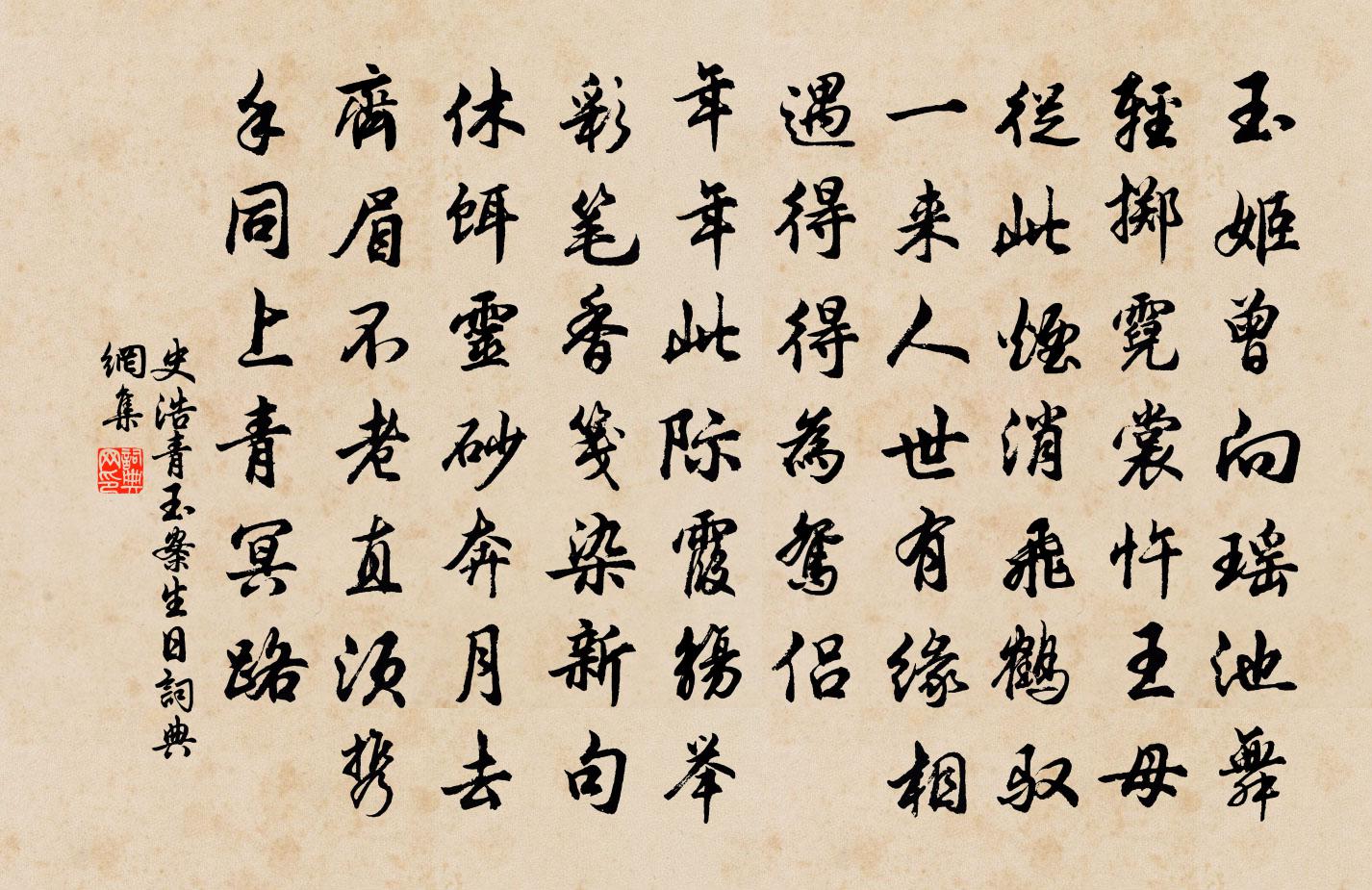 詩詞名句歷史字典書法欣賞書法字典國語詞典說文解字康熙字典古漢語字典標 題 作 者 詩 句 青玉案(生日)作者:史浩 朝代:宋代青玉案(生日)原文玉姬曾向瑤池舞。輕擲霓裳忤王母。從此煙消飛鶴馭。一來人世,有緣相遇,得得為鴛侶。年年此際霞觴舉。彩筆香箋染新句。休餌靈砂奔月去。齊眉不老,直須攜手,同上青冥路。詩詞問答問:青玉案(生日)的作者是誰?答:史浩問:青玉案(生日)寫於哪個朝代?答:宋代問:青玉案(生日)是什麼體裁?答:詞史浩青玉案(生日)書法欣賞青玉案(生日)書法作品詩詞推薦易元吉抱櫟狨文同〔宋代〕老櫟抱擁腫,金狨立鬅鬙。當年隴山道,似此見危層。謝章平遠惠筆黃庚〔宋代〕管城二子樣尖新,分惠山房勝饋金。淮兔拔毛夸匠巧,魯魚正字見功深。抄書未得纖毫力,握管難忘一寸心。揮翰虹橋胡仲弓〔宋代〕才過虹橋渡,漫山皆紫泥。鷗邊秋水落,牛背夕陽低。酒向污樽飲,詩從板壁題。江郎在何許,靈石與天齊。壽權漕大卿徐璣〔宋代〕青陽初動小春華,盡道蔥蘢曉氣佳。卿月早隨良月誕,繡衣元屢袞衣家。仙方養就雙瞳碧,和氣分成兩臉霞。看取田間黎廷瑞〔宋代〕牛羊散空煙,鳧鴨滿平坂。扶藜度西麓,脫屨涉南澗。行觀頳肩穫,坐媿綠陰飯。田毛信靡贏,井稅亦可辦。隔籬永遇樂(學士兄築室南山拒梗峰下,與西山相對。因生日,以詞見意)李彌遜〔宋代〕一水如繩,兩山如翼,綠野如繡。松院乾霄,筠莊枕浪,攬盡溪山秀。水南水北,竹輿蘭棹,來往月宵花晝。問人一叢花(謝濟倅宗室令郯送酒)晁補之〔宋代〕王孫眉宇鳳凰雛。天與世情疏。揚州坐上瓊花底,佩錦囊、曾憶奚奴。金盞醉揮,滿身花影,紅袖競來扶。十年一答李希淳屯田三首邵雍〔宋代〕胸中日月時舒慘,筆下風雲旋合離。老去無成尚如此,不知成後更何為。獨孤中丞筵陪餞韋君赴昇州皇甫冉〔唐代〕中司龍節貴,上客虎符新。地控吳襟帶,才高漢縉紳。泛舟應度臘,入境便行春。處處歌來暮,長江建業人。獲麟歌先秦無名〔先秦〕唐虞世兮麟鳳游。今非其時來何求。麟兮麟兮我心憂。送鄭權尚書南海王建〔唐代〕七郡雙旌貴,人皆不憶回。戍頭龍腦鋪,關口象牙堆。敕設薰爐出,蠻辭咒節開。市喧山賊破,金賤海船來。白氎林逋墓下趙師秀〔宋代〕梅花千樹白,不是舊時村。傾我酤來酒,酹君仙去魂。短碑藤倚蔓,空冢竹行根。猶有歸來鶴,清時欲與論。不禱華岳〔宋代〕不炷靈香不誦經,兆杯簽榜總欺人。窮通只合從天地,禍福何須問鬼神。命到死時生莫倖,事當直處曲還伸。從今夢仙謠三首王轂〔唐代〕前程漸覺風光好,琪花片片粘瑤草。有人遺我五色丹,一粒吞之後天老。青童遞酒金觴疾,列坐紅霞神氣逸。笑說轎中望泛仙山楊萬里〔宋代〕上卻籃輿卷卻簾,曉寒旋索熟衣添。孤松已自三千丈,更在仙山第一尖。月夜泛舟姚江樓鑰〔宋代〕秋暑不可耐,幾思泛中川。晚來興有適,溪船偶及門。涼月才上弦,平潮可黃昏。倚楫縱所知,臥看龍泉山。長虹金陵雜興二百首蘇泂〔宋代〕桃花園作芳林苑,濛汜池通祓禊堂。前以驕奢為晉宋,後無規鑒亦齊梁。菩薩蠻晁補之〔宋代〕玉京不許塵容到。疏慵只合疏慵老。鷗鳥共煙波。田夫與醉歌。忘懷無物我。莫似陳驚坐。勳業付長閒。西山爽氣和道溪君別業(一作和友人溪居別業)溫庭筠〔唐代〕積潤初銷碧草新,鳳陽晴日帶雕輪。風飄弱柳平橋晚,雪點寒梅小苑春。屏上樓台陳後主,鏡中金翠李夫人。花房元夜病起二首陳造〔宋代〕節物撩佳興,浮生盍自寬。山城如許樂,燈市不多寒。微步漂香細,行歌惜夜闌。何人欹醉帽,朱袖簇歸鞍。名句推薦殘月出門時,美人和淚辭。韋莊《菩薩蠻·紅樓別夜堪惆悵》 養其小者為小人,養其大者為大人。孟子《孟子·告子章句上·第十四節》 兩岸桃花烘日出,四圍高柳到天垂。姜彧《浣溪沙·山滴嵐光水拍堤》 飄零疏酒盞,離別寬衣帶。秦觀《千秋歲·水邊沙外》 孤村落日殘霞,輕煙老樹寒鴉,一點飛鴻影下。白樸《天淨沙·秋》 芳草年年惹恨幽。想前事悠悠。石延年《燕歸梁·春愁》 痴心做處人人愛,冷眼觀時個個嫌。馮夢龍《喻世明言·卷三》 茅檐人靜,蓬窗燈暗,春晚連江風雨。陸游《鵲橋仙·夜聞杜鵑》 東風靜、細柳垂金縷。万俟詠《三台·清明應制》 治大者不治細,成大功者不成小列子及其弟子《列子·楊朱》