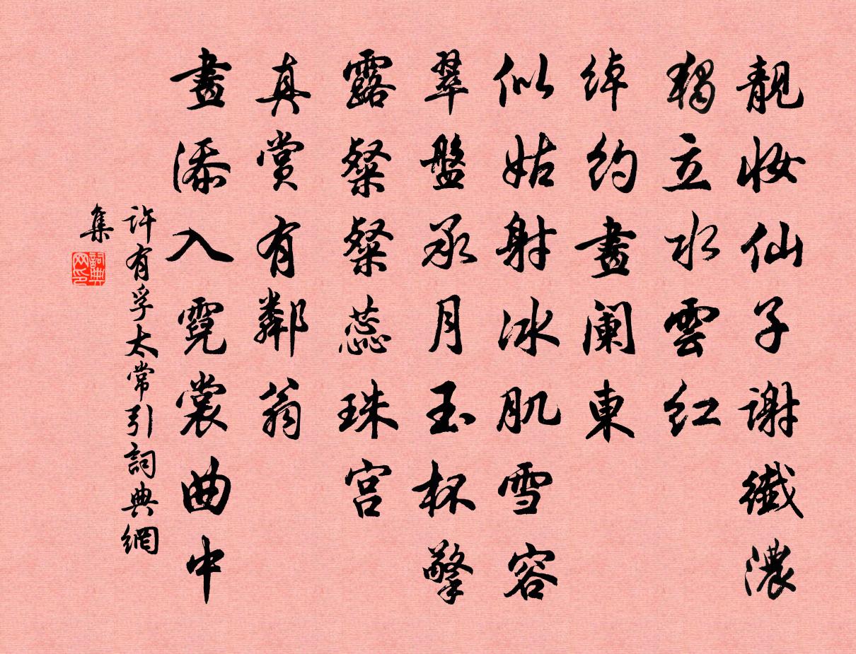 詩詞名句歷史字典書法欣賞書法字典國語詞典說文解字康熙字典古漢語字典標 題 作 者 詩 句 太常引作者:許有孚 朝代:元代太常引原文靚妝仙子謝纖濃。獨立水雲紅。綽約畫闌東。似姑射、冰肌雪容。翠盤承月,玉杯擎露,粲粲蕊珠宮。真賞有鄰翁。畫添入、霓裳曲中。詩詞問答問:太常引的作者是誰?答:許有孚問:太常引寫於哪個朝代?答:元代問:太常引是什麼體裁?答:詞許有孚太常引書法欣賞太常引書法作品詩詞推薦寄潤州龐籍范仲淹〔宋代〕北固高樓海氣寒,使君應此憑欄乾。春山雨後青無限,借與淮南洗眼看。長安賊中寄題江南所居茱萸樹武元衡〔唐代〕手種茱萸舊井傍,幾回春露又秋霜。今來獨向秦中見,攀折無時不斷腸。雜興陸游〔宋代〕犀象本安山海遠,楩楠豈願棟樑材。伏波病困壺頭日,應有嚴光入夢來。九日贈司空文明李端〔唐代〕我有惆悵詞,待君醉時說。長來逢九日,難與菊花別。摘卻正開花,暫言花未發。對琴待月白居易〔唐代〕竹院新晴夜,松窗未臥時。共琴為老伴,與月有秋期。玉軫臨風久,金波出霧遲。幽音待清景,唯是我心知。萬山堂飲歸方回〔宋代〕追懷往者數賢侯,得得經營續續修。依舊夜欄低北斗,幾番春絮委東流。同游盡道山能好,半醉誰知我獨愁。乃後商婦詞十首劉克莊〔宋代〕自說居奇貨。人知有販心。相如小商爾,賣賦得千金。題山居逸人黃滔〔唐代〕十畝餘蘆葦,新秋看雪霜。世人誰到此,塵念自應忘。斜日風收釣,深秋雨信梁。不知雙闕下,何以謂軒裳。和天衣聰老五首王之道〔宋代〕師去無為十五年,重來猿鶴亦忻然。此生不負今朝祝,冀結龍華會裡緣。和范元作五絕胡寅〔宋代〕久矣閟大音,無譏鄶以下。一聞入聖處,萬古洗凡馬。過孫員外藍田山居錢起〔唐代〕不知香署客,謝病翠微間。去幄蘭將老,辭車雉亦閒。近窗雲出洞,當戶竹連山。對酒溪霞晚,家人采蕨還。送黃提乾赴班李昴英〔宋代〕不枉金蘭貯一賢,唱名重見冕旒前。省闈見說第三賦,選調猶遲十八年。據實語人南嶠事,無多行李浙江船。壺山今年開歲三日上元三夕立春人日皆大晴陸游〔宋代〕今歲晴和歷歲無,江城歌舞溢通衢。天心只向人心卜,不用殷懃問紫姑。七夕感懷用尤悔庵原韻陳維崧〔清代〕鵲又填橋矣。滿長安、千門砧杵,四圍雲水。長記常年茅屋下,佳節團圞能幾!有和病、雲鬟雪涕。縱病倘然人尚過東陽諸人饒別獨劉叔明不至林季仲〔宋代〕松竹森森灝氣生,一簾疏雨故人情。扁舟還載離愁去,不見西城劉叔明。楚妃嘆張籍〔唐代〕湘雲初起江沉沉,君王遙在雲夢林。江南雨多旌旗暗,台下朝朝春水深。章華殿前朝萬國,君心獨自無終極。楚兵湖上吟許志仁〔宋代〕誰家短笛吹楊柳,何處扁舟唱采菱。湖水欲平風作惡,秋雲不薄雨無憑。近人白鷺麾方去,隔岸青山喚不應。好景送僧三首釋慧空〔宋代〕蜀川老覺家潼川,懷中交子是鐵錢。三年聽講大慈寺,執卷問之不識字。三年參禪大隋山,蓋龜劫火猶顢頇。瞿塘次韻答斌老病起獨游東園二首黃庭堅〔宋代〕萬事同一機,多慮乃禪病。排悶有新詩,忘蹄出兔徑。蓮花生淤泥,可見嗔喜性。小立近幽香,心與晚色靜。廣陵城(一作孟遲詩)趙嘏〔唐代〕紅映高台綠繞城,城邊春草傍牆生。隋家不向此中盡,汴水應無東去聲。名句推薦彌傷孤舟夜,遠結萬里心。權德輿《月夜江行 / 旅次江亭》 翠鈿曉寒輕,獨倚鞦韆無力。楊冠卿《如夢令·滿院落花春寂》 冷紅葉葉下塘秋。長與行雲共一舟。姜夔《憶王孫·番陽彭氏小樓作》 人老去西風白髮,蝶愁來明日黃花。張可久《折桂令·九日》 水國蒹葭夜有霜,月寒山色共蒼蒼。薛濤《送友人》 問姓驚初見,稱名憶舊容。李益《喜見外弟又言別》 不患位之不尊,而患德之不崇范曄《後漢書·列傳·張衡列傳》 上善若水,水善利萬物而不爭。老子《老子·道經·第八章》 當時父母念,今日爾應知。白居易《燕詩示劉叟》 江漢思歸客,乾坤一腐儒。杜甫《江漢》