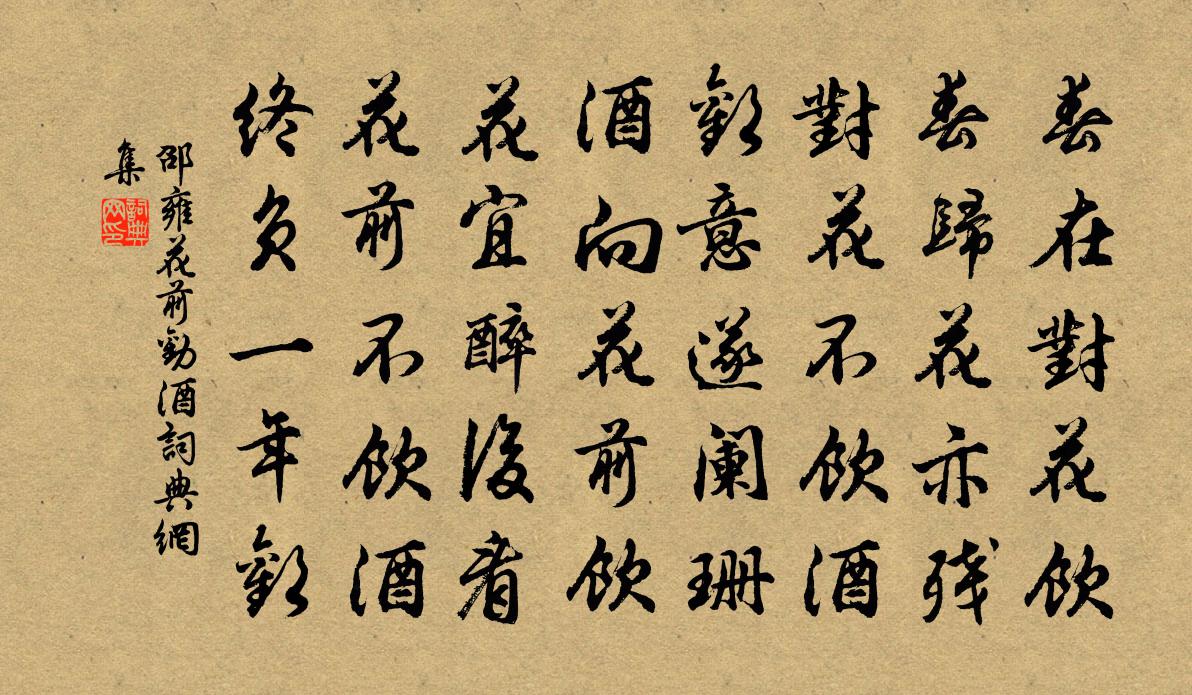 詩詞名句歷史字典書法欣賞書法字典國語詞典說文解字康熙字典古漢語字典標 題 作 者 詩 句 花前勸酒作者:邵雍 朝代:宋代花前勸酒原文春在對花飲,春歸花亦殘。對花不飲酒,歡意遂闌珊。酒向花前飲,花宜醉後看,花前不飲酒,終負一年歡。詩詞問答問:花前勸酒的作者是誰?答:邵雍問:花前勸酒寫於哪個朝代?答:宋代邵雍花前勸酒書法欣賞花前勸酒書法作品詩詞推薦胡笳曲十六拍文天祥〔宋代〕乃知貧賤別更苦,況我飄轉無定所。心懷百憂復千慮,世人那得知其故。嬌兒不離膝,哀哉兩決絕。也復可憐人,禪人並化主寫真求贊釋正覺〔宋代〕個是何人,氣清骨貧。煙霞面目,丘壑精神。二儀自然一體,萬像況與同塵。床上全威白額虎,鉤頭可意赤稍鱗。偈頌十八首釋師體〔宋代〕道妙休雲所得遲,不離聞見分明極。檻外一聲婆餅焦,黃頭碧眼斷訊息。斷訊息,最條直,是虎何須更插翼。蒼龍水亭晚坐楊冠卿〔宋代〕煙波渺涉白鷗雙,遠樹微紅襯夕陽。坐久江風起苹末,馮夷借我一襟涼。句黃元靚〔宋代〕各人自掃門前雪,休管他人瓦上霜。素梅 二一王冕〔元代〕春風一笑玉無垠,雲散空窗見月痕。半夜鶴歸詩思好,清香吹滿水南軒。初出濟州別城中故人(一作被出濟州)王維〔唐代〕微官易得罪,謫去濟川陰。執政方持法,明君照此心。閭閻河潤上,井邑海雲深。縱有歸來日,各愁年鬢侵。度東徑嶺武元衡〔唐代〕又過雁門北,不勝南客悲。三邊上岩見,雙淚望鄉垂。暮角雲中戍,殘陽天際旗。更看飛白羽,胡馬在封陲。菩薩蠻舒亶〔宋代〕畫檐細雨偏紅燭。疏星冷落排寒玉。賭得碧雲篇。金波更涉船。樽前當日客。行色垂楊陌。天闊水悠悠。含情獨倚惜春俞桂〔宋代〕春事三分過二分,桃花水上覓紅雲。遊人浪說春歸去,柳外黃鸝尚自吟。效退之青青水中薄五首王令〔宋代〕雙只水中鳧,來疾去閒暇。江湖風晚波,泛泛自高下。曉枕范成大〔宋代〕病夫心口相語,何日佳眠似渠?舒慘常隨天氣,關心窗暗窗明。日晏扶頭未起,喚人先問陰晴。秋思梅堯臣〔宋代〕梧桐在井上,蟋蟀在床下。物情有與無,節候不相假。寥寥風動葉,颯颯雨墮瓦。耳聽心自靜,誰是忘懷者。采菱行(一作采芰女)劉禹錫〔唐代〕白馬湖平秋日光,紫菱如錦彩鴛翔。蕩舟游女滿中央,采菱不顧馬上郎。爭多逐勝紛相向,時轉蘭橈破輕浪。長鬟拈古十四首釋法薰〔宋代〕南山不會禪,一向外邊走。臘月三十日,舌頭不出口。奉酬敬亭石隱君劉宰〔宋代〕宛陵侍處敬亭山,中有臞仙獨閒。賸喜好音來物外,莫令佳句到人間。和陸判院懷祖蘇泂〔宋代〕柴門臨水對山開,日日思君君不來。與世相忘書萬卷,於人無忤酒三杯。參乎畢竟曾師孔,賜也如何敢望回。況是武陵春 王小先問禪劉志淵〔元代〕法界一真心正住,當體滅諸緣。內外輝輝體現前。無地亦無天。取相於禪禪復遠,禪性月沉淵。動靜俱無鎮湛然。午憩二首楊萬里〔宋代〕晴邊雨後麥秋時,風色輕輕日色微。已隔深溪仍蘸水,卻教人折野薔薇。贈僧道光李廉訪〔宋代〕蒙泉崇福僧道光,只有詩腸無酒腸。野鶴性情猿伴侶,嘯吟風月獨昂藏。名句推薦前經洛陽陌,宛洛故人稀。王維《送魏郡李太守赴任》 枕上詩書閒處好,門前風景雨來佳。李清照《攤破浣溪沙·病起蕭蕭兩鬢華》 修身以敬,勿托以尊。房玄齡《晉書·列傳·第八章》 遊子乍聞征袖濕,佳人才唱翠眉低。鄭谷《鷓鴣》 胸中有誓深于海,肯使神州竟陸沉?鄭思肖《二礪》 不說自己井繩短,反說他人箍井深。佚名《增廣賢文·下集》 仁也者,人也。合而言之,道也。孟子《孟子·盡心章句下·第十六節》 槲葉落山路,枳花明驛牆。溫庭筠《商山早行》 創業還須深慮,恐貽害於子孫。王永彬《圍爐夜話·第三四則》 君思潁水綠,忽復歸嵩岑。李白《送裴十八圖南歸嵩山二首》