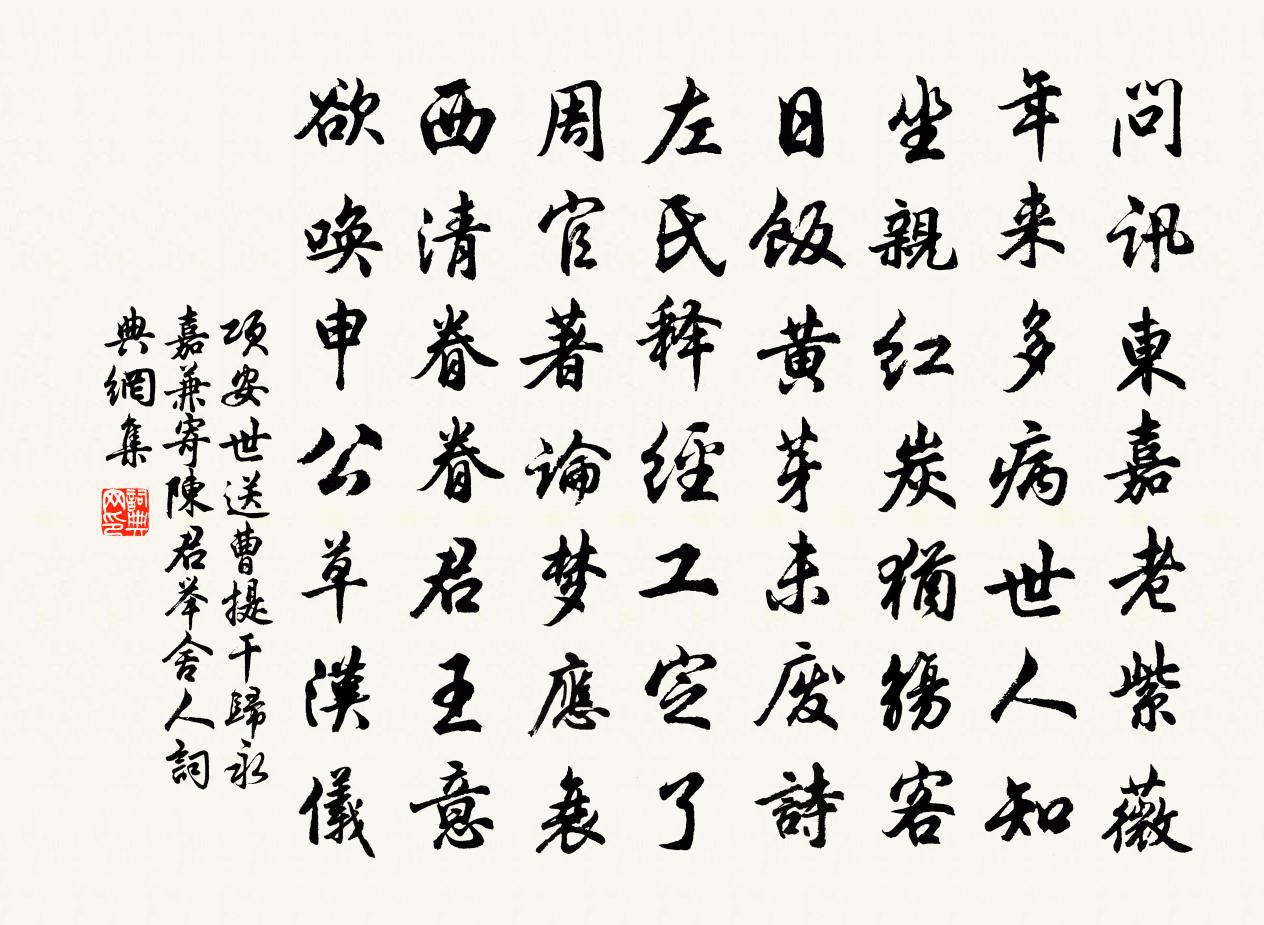 詩詞名句歷史字典書法欣賞書法字典國語詞典說文解字康熙字典古漢語字典標 題 作 者 詩 句 送曹提乾歸永嘉兼寄陳君舉舍人作者:項安世 朝代:宋代原文問訊東嘉老紫薇,年來多病世人知。坐親紅炭猶觴客,日飯黃芽未廢詩。左氏釋經工定了,周官著論夢應衰。西清眷眷君王意,欲喚申公草漢儀。詩詞問答問:《送曹提乾歸永嘉兼寄陳君舉舍人》的作者是誰?答:項安世問:該詩寫於哪個朝代?答:宋代書法欣賞送曹提乾歸永嘉兼寄陳君舉舍人書法作品詩詞推薦梁鼓吹曲 賢首山沈約〔南北朝〕賢首山。險而峻。乘峴憑臨胡陣。騁奇謀。奮卒徒。斷白馬。塞飛狐。殪日逐。殲骨都。刃谷蠡。馘林胡。草既潤滿庭芳仲殊〔宋代〕曉日迎涼,煙華生翠,玉麟香轉風輕。細絲鈞管,羅綺擁芝庭。競折蟠桃獻壽,雨露罩,春下仙瀛。碧池上,龜游通州丁溪館夜別李景信三首元稹〔唐代〕月濛濛兮山掩掩,束束別魂眉斂斂。蠡盞覆時天欲明,碧幌青燈風灩灩。淚消語盡還暫眠,唯夢千山萬山險。水環仆生平四到月岩寺而不識雲洞漫興長句趙蕃〔宋代〕只今四到月岩寺,不辨一為雲洞游。世事紛紛變蒼狗,暑途役役喘吳牛。細聽風合松楠響,應是雨催禾黍秋。留詠贈談命姚月壺黃庚〔宋代〕胸中訊息千年歷,舌底窮通一世人。試把五行推測看,廣文官冷幾時春。送崔生李新〔宋代〕斥鷃意自適,舉俛歡一枝。安知摶扶搖,乃有萬里期。鳴鳳困高岡,愧此腹背衣。我無瓊蕤漿,可以療酒飢。一稅贈余月心五首文天祥〔宋代〕月比於人歷世多,才圓又缺幾消磨。只因受用長生藥,嗟爾死蛙如月何。減字木蘭花魏夫人〔宋代〕西樓明月。掩映梨花千樹雪。樓上人歸。愁聽孤城一雁飛。玉人何處。又見江南春色暮。芳信難尋。去後桃花流水除夜方岳〔宋代〕春缸落面滑於油,旋潑醅來不用篘。窮鬼相隨政相熟,莫題荼壘惱渠休。哭孟郊賈島〔唐代〕身死聲名在,多應萬古傳。寡妻無子息,破宅帶林泉。冢近登山道,詩隨過海船。故人相吊後,斜日下寒天。驀溪山(寄寶學)劉子翬〔宋代〕浮煙冷雨,今日還重九。秋去又秋來,但黃花、年年如舊。平台戲馬,無處問英雄;茅舍底,竹籬東,佇立時搔首寒食二首蘇轍〔宋代〕寒食今年客汝南,余樽傾瀉亦醺酣。道人久厭世間濁,僧舍猶存肉食慚。花折園夫時送客,餳留孫女尚分甘。欲游過松源,晨炊漆公店六首楊萬里〔宋代〕政是行人腸斷時,子規得得向人啼。若能淚得居人臉,始信春愁總為伊。荷花蘇泂〔宋代〕荷花宮樣美人妝,荷葉臨風翠作裳。昨夜夜涼涼似水,羨渠宛在水中央。餞曹西士宰南康戴栩〔宋代〕君名華省里,廬岳未應過。壽日人兼餞,涼風湖際多。茶醒憐鶴睡,琴寂聽漁歌。候騎新來說,先聲眾已和。三月芙蓉白玉蟾〔宋代〕豈論春夏及秋冬,事事皆由造化工。誰道一生無好運,何緣三月見芙蓉。騷人猶恐東風誤,醉眼真疑芍藥紅。便是【商調】望遠行楊景賢〔元代〕悶拂銀箏,暫也那消停。響瑤階風韻清,忽驚起瀟湘外寒雁兒叫破沙汀,支楞的淚濕弦初定。弦初定,銀河淡月明和陳亮功張次夔二同年唱酬廉字誠字之作孫應時〔宋代〕早韭到晚菘,紫蓼用綠葵。古為聲節士,此昧良自知。銀鞍黃金絡,綺戶芙蓉閨。丈夫各自適,物理那能齊。如夢令王哲〔元代〕九九八方端鎖。團聚光明如火。焰焰做紅霞,裡面天花遍妥。成裹。成裹。瑩瑩明珠一顆。偈頌一百四十一首釋師範〔宋代〕作者相逢,你西我東。水歸滄海,月上孤峰。放出城中老鼠,咬殺村裹大蟲。因甚如此,閩蜀同風。名句推薦今夕復何夕,共此燈燭光。杜甫《贈衛八處士》 良禽擇木而棲,賢臣擇主而事。羅貫中《三國演義·第三回》 春來茗葉還爭白,臘盡梅梢盡放紅。韓元吉《送陸務觀福建提倉》 桐葉晨飄蛩夜語。旅思秋光,黯黯長安路。陸游《蝶戀花·桐葉晨飄蛩夜語》 東風楊柳欲青青。煙淡雨初晴。晏殊《訴衷情·東風楊柳欲青青》 又似賈客蜀道間,千鐸萬磬鳴空山牛殳《琵琶行》 士不以利移、不為患改。劉向《說苑·談叢》 人道惡盈而好謙。佚名《易傳·彖傳上·謙》 我醉欲眠卿且去,明朝有意抱琴來。李白《山中與幽人對酌》 鳥啼官路靜,花發毀垣空。張繼《清明日自西午橋至瓜岩村有懷》