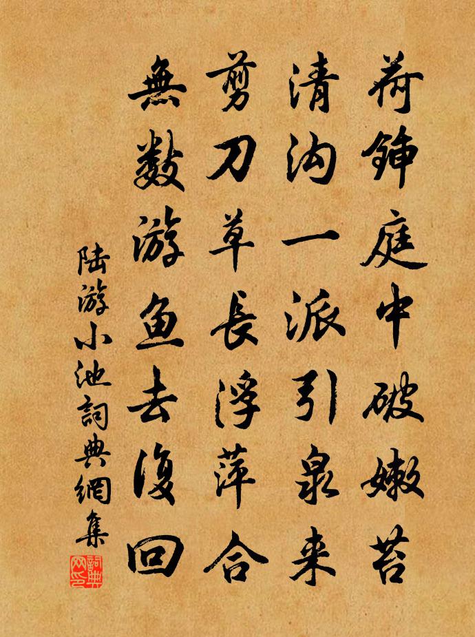 詩詞名句歷史字典書法欣賞書法字典國語詞典說文解字康熙字典古漢語字典標 題 作 者 詩 句 小池作者:陸游 朝代:宋代小池原文荷鍤庭中破嫩苔,清溝一派引泉來。剪刀草長浮萍合,無數游魚去復回。詩詞問答問:小池的作者是誰?答:陸游問:小池寫於哪個朝代?答:宋代問:陸游的名句有哪些?答:陸游名句大全陸游小池書法欣賞小池書法作品詩詞推薦望山間西際寺王洋〔宋代〕聞說林間寺,攀蘿一徑斜。有僧眠雪月,無客賞風花。太室虛名在,方袍歲事賒。空王無系著,破屋便傳家。哭僧清尚〔唐代〕道力自超然,身亡同坐禪。水流元在海,月落不離天。溪白葬時雪,風香焚處煙。世人頻下淚,不見我師玄。踏莎行 雲窗秋夢 復古詩集五王國器〔元代〕煙冷瑤欞,神遊貝闕。芙蓉城裡花如雪。仙郎同躡鳳凰翎,千門萬戶皆明月。地老天荒,山青海碧。滿身風露飄環詩贈晚學李君邢仙老〔宋代〕久掩山齋看古經,但矜猿鶴事高情。爐中且喜丹砂死,岩下近聞朱草生。堪鄙塵寰馳妄理,莫教流俗聽希聲。清溪池上竹張文姬〔唐代〕此君臨此池,枝低水相近。碧色綠波中,日日流不盡。漫感龔自珍〔清代〕絕域從軍計惘然,東南幽恨滿詞箋。一簫一劍平生意,負盡狂名十五年。聞我師大捷騎宵遁上時宰五十韻葛立方〔宋代〕憬彼金微虜,遊魂擅一隅。筋駑殂老革,乳臭立遺雛。毒螫鍾蛇豕,虔劉肆{左豸右契}貙。請和包橘詐,歸地反判誤書紙背裴諝〔唐代〕這畔似那畔,那畔似這畔。我也不辭與你判,笑殺門前著靴漢。讀韓杜集杜牧〔唐代〕杜詩韓筆愁來讀,似倩 * 癢處搔。天外鳳凰誰得髓?無人解合續弦膠。栽梅郭印〔宋代〕平生不愛花,獨喜雪中梅。江皋無人問,移近小亭栽。連朝勤培溉,的皪犯寒開。青枝綴瓊粒,絳萼扶冰腮。奇哉寄夾谷書隱何夢桂〔宋代〕巔崖一落費攀躋,汲綆千尋重挈提。往事雪中鴻印跡,舊恩堂上燕銜泥。錢塘東去江濤遠,銀漢西流斗柄低。天地雪山陸游〔宋代〕雪崦梅村一徑斜,茆檐煙火兩三家。眼明見此幽棲地,卻恨吾廬已太奢。書曹忠勇詩集王義山〔宋代〕當家七步已稱雄,君更豪吟句律工。瀘水城存空弔古,睢陽廟在凜生風。友聞不死世無敵,武惠重來戰有功。能不春遊西園朱淑真〔宋代〕閒步西園裡,春風明媚天。蝶疑莊叟夢,絮憶謝娘聯。踏草青茵軟,看花紅錦鮮。徘徊月影下,欲去又依然。水調歌頭(次李伯紀韻趣開東閣)李彌遜〔宋代〕安石寓絲竹,方朔雜詼諧。昂霄氣概,古來無地可容才。不見騎鯨仙伯,唾手功名事了,猿鶴與同儕。有意謝軒冕贈周茂叔何平仲〔宋代〕及物仁心稱物情,更將和氣助春榮。智深大易知幽賾,樂本鹹池得正聲。竹箭生來元有節,冰壺此外更無清。幾年感秋三絕張耒〔宋代〕秋思鄉愁兩苦辛,每臨西北望秋雲。此生更老情終在,誰為寄聲千里人。贈南嶽宣義大師英公蘇德祥〔宋代〕學就書聞在道林,幾年辛苦用身心。九霄雨露酬知早,百首風騷立意深。青白野雲閒里臥,古今碑碣醉中尋。因何晦日宴遊杜審言〔唐代〕日晦隨蓂莢,春情著杏花。解紳宜就水,張幕會連沙。歌管風輕度,池台日半斜。更看金谷騎,爭向石崇家。秦樓月·浮雲集范成大〔宋代〕浮雲集。輕雷隱隱初驚蟄。初驚蟄。鵓鳩鳴怒,綠楊風急。玉爐煙重香羅浥。拂牆濃杏燕支濕。燕支濕。花梢缺處名句推薦一聲畫角譙門,豐庭新月黃昏,雪裡山前水濱。白樸《天淨沙·冬》 憶昔西池池上飲,年年多少歡娛。晁沖之《臨江仙·憶昔西池池上飲》 借問此何時?春風語流鶯。李白《春日醉起言志》 回首暮雲遠,飛絮攪青冥。蘇軾《水調歌頭·昵昵兒女語》 問君何能爾?心遠地自偏。陶淵明《飲酒·其五》 林花著雨胭脂濕,水荇牽風翠帶長。杜甫《曲江對雨》 只有一枝梧葉,不知多少秋聲。張炎《清平樂·候蛩淒斷》 學之興廢,隨世輕重。顏之推《顏氏家訓·勉學篇》 舉頭紅日白雲低,四海五湖皆一望。唐寅《伯虎扮乞兒,作詩騙酒》 車遙遙兮馬洋洋,追思君兮不可忘。傅玄《車遙遙篇》