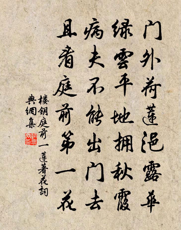 詩詞名句歷史字典書法欣賞書法字典國語詞典說文解字康熙字典古漢語字典標 題 作 者 詩 句 庭前一蓮著花作者:樓鑰 朝代:宋代庭前一蓮著花原文門外荷蓮浥露華,綠雲平地擁秋霞。病夫不能出門去,且看庭前第一花。詩詞問答問:庭前一蓮著花的作者是誰?答:樓鑰問:庭前一蓮著花寫於哪個朝代?答:宋代樓鑰庭前一蓮著花書法欣賞庭前一蓮著花書法作品詩詞推薦句徐似道〔宋代〕黃四娘花空朵朵,謝三郎鬢已蒼蒼。送太常魚博士通守漢州宋庠〔宋代〕春霰霽征塗,離人向蜀初。還拋博士蕝,貪佐使君旟。藻思夸名閣,忠懷慕叱車。布刀多計吏,行矣數通書。雞雛吟方逢辰〔宋代〕我聞先儒雲,雞雛可觀仁。須臾一舍母,是即孝弟根。不待教而知,不待習而成。於斯為良知,於斯為良能。人從山中吟釋文珦〔宋代〕自為山中人,不厭山中居。雲西最高峰,秀出如芙蕖。早秋言事趙湘〔唐代〕苔染衡門綠有錢,不堪風月漸悽然。蛩聲乍出斜陽外,山色初來落木邊。掃葉偶窺栽菊地,捲簾因作搗衣篇。故人發閶門顧瑛〔元代〕閶門西去是陽關,疊疊秋風疊疊山。便是早春相別處,如今楊柳不堪攀。憶滁州幽谷歐陽修〔宋代〕滁南幽谷抱千峰,高下山花遠近紅。當日辛勤皆手植,而今開落任春風。主人不覺悲華發,野老猶能說醉翁。誰與鷓鴣天鄭少微〔宋代〕誰折南枝傍小叢。佳人豐色與梅同。有花無葉真瀟灑,不問胭脂借淡紅。應未許,嫁春風。天教雪月伴玲瓏。池塘無題二首劉克莊〔宋代〕恕漢唾師德,酒徒拳伯倫。吾評此二士,顏子後無人。送豆盧膺秀才南遊序柳宗元〔唐代〕君子病無乎內而飾乎外,有乎內而不飾乎外者。無乎內而飾乎外,則是設覆為阱也,禍孰大焉;有乎內而不飾乎外玉樓春·別後不知君遠近歐陽修〔宋代〕別後不知君遠近。觸目淒涼多少悶。漸行漸遠漸無書,水闊魚沉何處問。夜深風竹敲秋韻。萬葉千聲皆是恨。故欹題池州覽亭劉過〔宋代〕塵土中無絕妙詞,不能重賦翠微詩。淋漓醉墨楊廷秀,慷慨悲吟杜牧之。岩壑尚多吾足倦,江山信美客歸遲。夕陽山寺引泉曹松〔唐代〕劈碎琅玕意有餘,細泉高引入香廚。山僧未肯言根本,莫是銀河漏泄無。金雞叫 警劉公王哲〔元代〕識得希夷方見妙。自然是、無煩無惱。妻男孫女長繚繞。愛獄恩山,把身軀緊縛抓。苦要玲瓏於已俏。把慧刀、快有感二首喻良能〔宋代〕再有淮南亂,紛紛幾戰場。血腥官道雨,骨映野田霜。行陣青黃氣,朝廷赤白囊。何時洗兵甲,四海重耕桑。龍興觀金籙建醮(景龍二年)王翰〔唐代〕泰山岩岩兮凌紫氛,中有群仙兮乘白雲,陳金薦璧兮□□□。次韻參寥師寄秦太虛三絕句時秦君舉進士不得釋元淨〔宋代〕秦郎文字固超然,漢武憑虛意欲仙。底事秋來不得解,定中試為問諸天。次韻柳子玉二首 紙帳蘇軾〔宋代〕亂文龜殼殳細相連,慣臥青綾恐未便。潔似僧巾白氎布,暖於蠻帳紫茸氈。錦衾速卷持還客,破屋那愁仰見天。但和錢舍人水植詩王建〔唐代〕盆里盛野泉,晚鮮幽更好。初活草根浮,重生荷葉小。多時水馬出,盡日蜻蜓繞。朝早獨來看,冷星沈碧曉。渾淪庵成悠然子親慶因以何字為韻共酌聯句石元規〔宋代〕作室鬼觀靈境,功成事若何。琴鬼消日月,耕釣老煙蘿。為羨雲蹤遠,時將鬼共過。東岩開玉洞,西澗瀉銀河。整名句推薦佇久河橋欲去,斜陽淚滿。吳文英《三姝媚·過都城舊居有感》 浮雲遮月不分明,誰挽長江一洗放天青?董士錫《虞美人·韶華爭肯偎人住》 鄉淚客中盡,孤帆天際看。孟浩然《早寒江上有懷 / 早寒有懷 / 江上思歸》 遙知獨聽燈前雨,轉憶同看雪後山。納蘭性德《於中好·送梁汾南還為題小影》 秋風起兮木葉飛,吳江水兮鱸正肥。張翰《思吳江歌》 功蓋三分國,名成八陣圖。杜甫《八陣圖》 亂則國危,治則國安。荀子《荀子·王霸》 乃翁知國如知兵,塞垣草木識威名。黃庭堅《送范德孺知慶州》 知君慣度祁連城,豈能愁見輪台月。岑參《送李副使赴磧西官軍》 一笛當樓,謝娘懸淚立風前史達祖《玉蝴蝶·晚雨未摧宮樹》