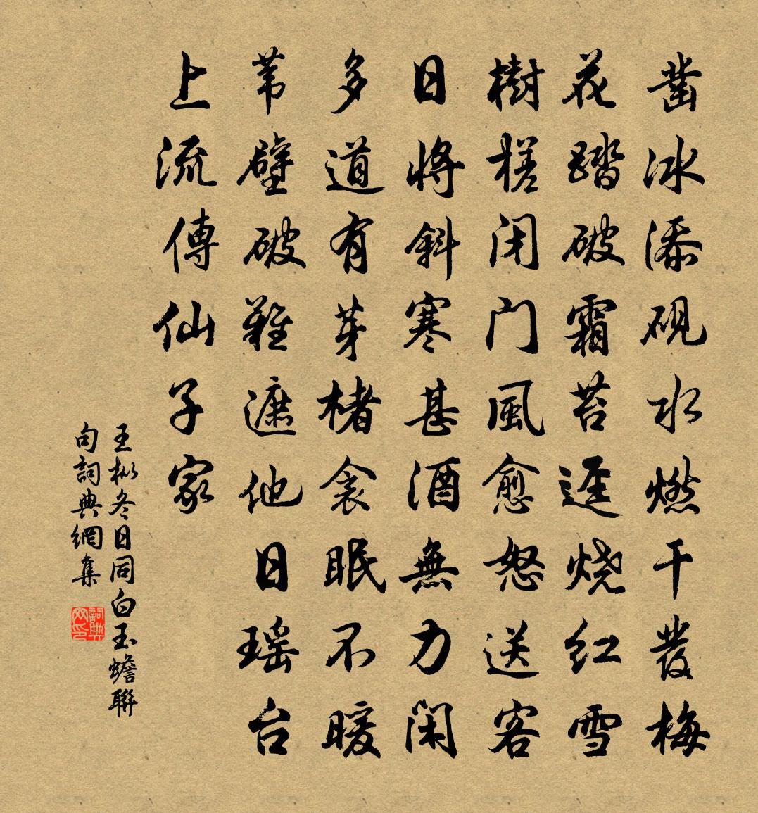 詩詞名句歷史字典書法欣賞書法字典國語詞典說文解字康熙字典古漢語字典標 題 作 者 詩 句 冬日同白玉蟾聯句作者:王樅 朝代:宋代冬日同白玉蟾聯句原文鑿冰添硯水,燃乾發梅花。踏破霜苔逕,燒紅雪樹槎。閉門風愈怒,送客日將斜。寒甚酒無力,閒多道有芽。楮衾眠不暖,葦壁破難遮。他日瑤台上,流傳仙子家。詩詞問答問:冬日同白玉蟾聯句的作者是誰?答:王樅問:冬日同白玉蟾聯句寫於哪個朝代?答:宋代王樅冬日同白玉蟾聯句書法欣賞冬日同白玉蟾聯句書法作品詩詞推薦滿庭芳洪适〔宋代〕風攪花間,雨慳柳下,人人懶拂愁眉。年荒省事,投轄井中稀。架上舞衣塵積,弦索斷、箏雁差池。南柯夢,轉頭次韻徐太博方岳〔宋代〕湖山雨過晚雲濕,解榻文堂夢亦清。秋入黃昏金粟粟,苔侵蒼翠 * 莖。蟲魚枉注書連屋,蠻觸令人笑絕纓。講罷和子遠春江用老杜韻王之道〔宋代〕欲去未成去,朔風鳴怒濤。片帆洲外舉,列岫霧中高。竹屋雨沾被,紙窗寒透袍。遙應望歸艇,向夕走兒曹。水紋扇范祖禹〔宋代〕剪出瀟湘一片秋,動搖君手向空流。微風自有雲濤氣,夢入江天一釣舟。行住坐臥三十二頌釋印肅〔宋代〕眾生垢重汩塵緣,豈自收心同覺源。挈水拾薪時節至,三通鼓罷物皆鮮。過武陵溪二首張詠〔宋代〕武陵山下水沖溶,往事追尋興莫窮。欲就漁人問閒趣,葉舟齊過蓼灣東。神宗皇帝輓詞三首蘇轍〔宋代〕承平終不處,付託重艱難。統接神孫正,人依聖母安。橋山封劍佩,原廟見衣冠。萬國纏哀處,嵩陽檜柏寒。十二月二十六日早起雪已三寸許夜來初不覺也虞儔〔宋代〕曉來眼界忽然新,一色瓊瑤與爛銀。人事乖時空請禱,天心回後只逡巡。不教三白孤殘臘,要與千家作好春。宿麥登邕州城陶弼〔宋代〕夜半孤成百尺台,亂蟲聲里一樽開。憂邊日繞南雲下,戀闕心隨北斗回。秋夜舟中作趙湘〔唐代〕酒醒身計正悠悠,澤國如萍信水流。獨夜聽鴻深浦宿,壞篷連雨一燈秋。年來自覺新詩澹,江上誰憐舊業優。腸斷換徐敦濟郎中詞二首韓元吉〔宋代〕強學三冬足,高談四座傾。書成唐北海,文假漢西京。籌幄嘗裨畫,星曹僅持名。生芻才一束,聊寄淚縱橫。駙馬宅宴罷曹松〔唐代〕粉牆殘月照宮祠,宴闋銀瓶一半欹。學語鶯兒飛未穩,放身斜墜綠楊枝。劉氏女自誓為尼憐其操者幸助成之葉適〔宋代〕漢上洪波不可親,夔州華發自嫌貧。世間浮想如枯蠟,還向虛空嫁此身。虞美人(雙蓮)趙長卿〔宋代〕二喬姊妹新妝了。照水盈盈笑。多情相約五湖游。似向群花叢里、騁風流。丁香枝上千千結。怨惹相思切。爭如特甘露陳岩肖〔宋代〕負土築新阡,松楸手親藝。結廬居墓傍,猿鶴為垂涕。屈批幾星霜,精誠動天帝。三宵神澤零,霏霏灑松蓋。曉看野興陸游〔宋代〕蓍草晨占大易爻,松肪夜借隱書抄。飢時每就猿分果,宿處時從鶴寄巢。旋賣荊薪持取醉,偶逢野叟即論交。頹然酬孫侍御春日見寄盧綸〔唐代〕經過里巷春,同是謝家鄰。顧我覺衰早,荷君留醉頻。松高猶覆草,鶴起暫縈塵。始悟達人志,患名非患貧。烏石山僧舍盛松坡〔宋代〕小徑通山寺,飛檐抹曉霞。松風驚蝶夢,梵磬雜蜂衙。僧臘菩提樹,禪心菡萏花。詩成因抵掌,飛起欲棲雅。摸魚子 並引 至正戊子秋,吾兄中丞公以賜許有孚〔元代〕亭圮,垣危卉木伐,惟雙古檜在庭。徒具畚鍤,從事疏鑿,池廣袤千餘步,深一仞,形如桓圭。西橢二洲,東規一田家三首張耒〔宋代〕新見鵲銜庭樹枝,黃口出巢今已飛。粟留啄椹桑葉老,科斗出畦新稻齊。田家苦作候時節,汲汲未免寒與飢。去來名句推薦當年燕子知何處,但苔深韋曲,草暗斜川。張炎《高陽台·西湖春感》 下謀上以術,術有窮者以力。來俊臣《羅織經·謀劃卷第九》 有心為善,雖善不賞。無心為惡,雖惡不罰。蒲松齡《聊齋志異·卷一·考城隍》 寒鴉飛數點,流水繞孤村。楊廣《失題》 昔孟母,擇鄰處。子不學,斷機杼。王應麟《三字經·全文》 唯有門前鏡湖水,春風不改舊時波。賀知章《回鄉偶書二首》 慘慘時節盡,蘭葉復凋零。徐幹《室思》 想烏衣年少,芝蘭秀髮,戈戟雲橫。葉夢得《八聲甘州·壽陽樓八公山作》 感時花濺淚,恨別鳥驚心。杜甫《春望》 浮天滄海遠,去世法舟輕。錢起《送僧歸日本》
