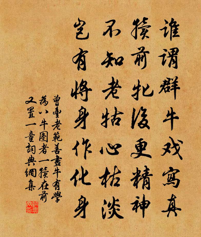 詩詞名句歷史字典書法欣賞書法字典國語詞典說文解字康熙字典古漢語字典標 題 作 者 詩 句 老范善畫牛有學為八牛圖者一犢在前又置一童作者:曾豐 朝代:宋代原文誰謂群牛戲寫真,犢前牝後更精神。不知老牯心枯淡,豈有將身作化身。詩詞問答問:《老范善畫牛有學為八牛圖者一犢在前又置一童》的作者是誰?答:曾豐問:該詩寫於哪個朝代?答:宋代書法欣賞老范善畫牛有學為八牛圖者一犢在前又置一童書法作品詩文賞析【原題】:老范善畫牛有學為八牛圖者一犢在前又置一童持竿牧其後詩詞推薦舟中戲書釋紹嵩〔宋代〕十二峰前且繫船,眼中百里舊山川。遙知此夕多情思,江月隨人處處圓。江梅引 贈李元法劉志淵〔元代〕不驚榮辱總無憂。度春秋。得優遊。打破**,無物掛心頭。天內一天為活計,調龍虎,恣盤旋,斗未休。紫金霜歸自陶山舟中示暹侄蘇泂〔宋代〕鐘聲四山晚,一舸鏡中歸。遠舍火明樹,寒天露濕衣。塔高城不禁,林暗鳥疇依。有句傳猶子,吾疏合世違。春遊康孝基〔宋代〕行春喜入虎邱山,按轡風和草色間。寺內翠微松檜里,空中紺宇水雲間。桃花時作翻翻落,苔蘚晴留點點斑。不為老猿舒岳祥〔宋代〕一笑已霜千丈發,三聲應斷九迴腸。巴陵月暝林巒慘,巫峽江空道路長。屏居北郊自秋涉冬絕省人事觸緒有感吒之諷吟程公許〔宋代〕口為禍之穽,異者同之分。誰龍噤不語,兀兀如羈囚。我豈好違俗,心未忘好修。本不慕華顯,寧有忮與求。趙遙漁具詩網陸龜蒙〔唐代〕大罟綱目繁,空江波浪黑。沈沈到波底,恰共波同色。牽時萬鬐入,已有千鈞力。尚悔不橫流,恐他人更得。五位頌釋慧暉〔宋代〕正中偏,混沌初分半夜天。轉側木人驚夢破,雪蘆滿眼不成眠。小隱園詩謝絳〔宋代〕僕本塵外士,功名若毫末。因尋小園隱,忽見群芳發。昔夢宛可記,靈契方茲達。會須掛朝纓,歸弄岩前月。五月望月蝕歷家又言六月朔日蝕樓鑰〔宋代〕閭巷夜爭呼,相傳救望舒。偶因雲暫破,真似月之初。孰謂蟆能瞎,端知歷不疎。太陽交蝕近,試看更何如。伊昔四首於石〔宋代〕伊昔西湖里,娉婷十里蓮。香凝花上露,影落鏡中天。枕簟水亭雨,笙歌月夜船。雙鴛不解事,常傍翠陰眠。蜀人舊食決明花耳潁川夏秋少菜崇寧老僧教人蘇轍〔宋代〕秋蔬舊采決明花,三嗅馨香每嘆嗟。西寺衲僧並食葉,因君說與故人家。□□□□□□□卷後劉克莊〔宋代〕□□□□□□□,□□□梁一點塵。繞樹都忘寒徹□,□□□□□□□。□□客至徘徊月,不怕天嗔漏□□,□□偶成李流謙〔宋代〕人生偶爾竟何須,點檢閒身一事無。可笑戰蝸猶曳甲,不妨夢蟻卻分符。夜涼白月誰相過,酒盡清樽可更沽。作個沁園春無聞翁〔宋代〕埋怨姐姐,銜恨婆婆。題杼山癸亭得暮字(亭,陸鴻漸所創)顏真卿〔唐代〕杼山多幽絕,勝事盈跬步。前者雖登攀,淹留恨晨暮。及茲紆勝引,曾是美無度。欻構三癸亭,實為陸生故。高賢偈頌一百二十三首釋普度〔宋代〕昨夜毗嵐撼山嶽,七十二峰俱倒卓。太湖萬頃涓滴無,黃葉亂飄星斗落。憶壽春廢虎坑余以春二月至郡主吏舉所職稱霍…去郡三載李紳〔唐代〕匪將履尾求兢惕,那效探雛所患爭。當路絕群嘗誡暴,為貓驅獮亦先迎。每推至化宣餘力,豈用潛機害爾生。休逐自居剡源少遇樂歲辛巳之秋山田可擬上熟吾貧戴表元〔宋代〕村郊多父老,面垢頭如蓬。我嘗使之言,辭語不待工。古來名節士,敢望彭城龔。有叟誚其後,更恨道不同。鄙哉六州歌頭·東風著意韓元吉〔宋代〕東風著意。先上小桃枝。紅粉膩。嬌如醉。倚朱扉。記年時。隱映新妝,面臨水岸。春將半。雲日暖。斜橋轉。夾名句推薦情似遊絲,人如飛絮。淚珠閣定空相覷。周紫芝《踏莎行·情似遊絲》 心多過慮,何異杞人憂天;事不量力,不殊夸父追日。程登吉《幼學瓊林·卷一·天文》 淚滴千千萬萬行,更使人、愁腸斷。樂婉《卜運算元·答施》 梧桐樹,三更雨,不道離情正苦。溫庭筠《更漏子·玉爐香》 天外黑風吹海立,浙東飛雨過江來。蘇軾《有美堂暴雨》 最是倉皇辭廟日,教坊猶奏別離歌,垂淚對宮娥。李煜《破陣子·四十年來家國》 雪裡溫柔,水邊明秀,不借春工力。辛棄疾《念奴嬌·梅》 巧而好度,必節;勇而好同,必勝;知而好謙,必賢。荀子《荀子·仲尼》 應是夜寒凝。惱得梅花睡不成。黃升《南鄉子·冬夜》 昨夜江邊春水生,艨艟巨艦一毛輕。朱熹《活水亭觀書有感二首·其二》