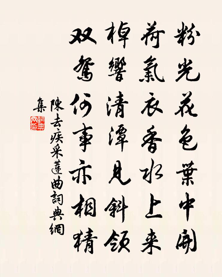 詩詞名句歷史字典書法欣賞書法字典國語詞典說文解字康熙字典古漢語字典標 題 作 者 詩 句 採蓮曲作者:陳去疾 朝代:唐代採蓮曲原文粉光花色葉中開,荷氣衣香水上來。棹響清潭見斜領,雙鴛何事亦相猜。詩詞問答問:採蓮曲的作者是誰?答:陳去疾問:採蓮曲寫於哪個朝代?答:唐代問:採蓮曲是什麼體裁?答:樂府陳去疾採蓮曲書法欣賞採蓮曲書法作品注釋全唐詩:卷490-17詩詞推薦採桑子晏殊〔宋代〕陽和二月芳菲遍,暖景溶溶。戲蝶游蜂。深入千花粉艷中。何人解系天邊日,占取春風。免使繁紅。一片西飛一片孟子引夏諺佚名〔先秦〕吾王不游。吾何以休。吾王不豫。吾何以助。一游一豫。為諸侯度。希年初度老友王希宣扁舟遠訪夙誼甚厚貺以十牟巘五〔宋代〕有酒巾可漉,無酒榼自空。但懷停雲友,相望各西東。賦張良臣〔宋代〕柳暗旗亭不忍看,臨江悉殺晉衣冠。傷心明月揚州路,十里珠簾蕙草寒。夜觀蜀志黃庭堅〔宋代〕蓋世英雄不自知,暮年初志各參差。南陽隴底臥龍日,北固樽前失者時。霸主三分割天下,宗臣十倍勝曹丕。寒爐洞仙歌(留春)晁補之〔宋代〕花恨月惱。更夏有涼風,冬軒雪皎。閒事不關心,算四時皆好。從來又說,春台登覽,人意多同,常是惜、春過了游後洞詩劉贄〔宋代〕寺久書荒寂無足往,念有子厚彌陀碑。獨趨一里轉岩腹,剝粉敗赤逢門楣。亭亭故碑亡舊主,覆以老屋疏且欹。常同劉孝若野步徐照〔宋代〕杖屨相隨步野田,坐臨階石和詩篇。要看隔水人家菊,試借系門漁父船。且緩歸情知有月,不生酒興為無錢。寒來登千福寺楚金禪師法華院多寶塔岑參〔唐代〕多寶滅已久,蓮華付吾師。寶塔凌太空,忽如湧出時。數年功不成,一志堅自持。明主親夢見,世人今始知。千家詠興五首。小庭亦有月白居易〔唐代〕小庭亦有月,小院亦有花。可憐好風景,不解嫌貧家。菱角報笙簧,谷兒抹琵琶。紅綃信手舞,紫綃隨意歌。[菱郊行寄杜位岑參〔唐代〕崷崒空城煙,淒清寒山景。秋風引歸夢,昨夜到汝潁。近寺聞鐘聲,映陂見樹影。所思何由見,東北徒引領。句裘萬頃〔宋代〕雲歸青嶂雨初歇,花臥碧苔春已休。湖上閒坐釋智圓〔宋代〕終日湖亭坐,悠悠萬慮閒。眼前何所有,寒水與秋山。宿甘露寺黃庚〔宋代〕山險疑無路,縈迴一徑通。鐘聲寒瀑外,塔影夕陽中。窗出茶煙白,爐分葑火紅。禪房遇耆舊,清話數霄同。次韻范子儀怡山飯訖訪王仙郡舊跡一首蘇籀〔宋代〕雲衲撞鐘集,鶴衣輿轎來。暫沽彭澤酒,豈礙太常齋。道釋縱橫說,門庭南北開。皂叢天籟響,棋罷想龜回。瑣窗寒楊無咎〔宋代〕柳暗藏鴉,花深見蝶,物華如繡。情多思遠,又是一番清瘦。憶前回、庭榭來春,個人預約同攜手。恨遲留,載酒謠薛瑤〔唐代〕化雲心兮思淑貞,洞寂滅兮不見人。瑤草芳兮思芬蒀,將奈何兮青春。游鼓山喝水岩姜特立〔宋代〕昔聞鼓山名,未到鼓山寺。勝游不易得,一失恐難值。今朝忽勇猛,便作入山計。雖無濟勝具,尚可策疲致。松下陳季常所蓄《朱陳村嫁娶圖》二首蘇軾〔宋代〕我是朱陳舊使君,勸農曾入杏花村。而今風物那堪畫,縣吏催租夜打門。答祖太博借山居要術余靖〔宋代〕經濟諒周當世務,收藏敢秘老農書。相逢莫羨山居好,歸去蓬山有直廬。名句推薦玉在櫝中求善價,釵於奩內待時飛。曹雪芹《紅樓夢·第一回》 上林苑裡花徒發,細柳營前葉漫新。杜審言《春日京中有懷》 不知馬骨傷寒水,惟見龍城起暮雲。王涯《塞下曲二首·其二》 相思了無益,悔當初相見。朱彝尊《憶少年·飛花時節》 鬱陶思君未敢言,寄聲浮雲往不還。曹丕《燕歌行》 一葉葉,一聲聲,空階滴到明。溫庭筠《更漏子·玉爐香》 以肉去蟻蟻愈多,以魚驅蠅蠅愈至。韓非及後人《韓非子·外儲說左下》 學是一個尋常的家飯,當隨事而警惕。洪應明《菜根譚·概論》 黃花深巷,紅葉低窗,淒涼一片秋聲。蔣捷《聲聲慢·秋聲》 片帆西去,一聲誰噴霜竹。辛棄疾《念奴嬌·登建康賞心亭呈史致道留守》