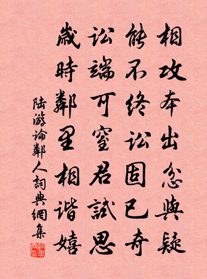 詩詞名句歷史字典書法欣賞書法字典國語詞典說文解字康熙字典古漢語字典標 題 作 者 詩 句 論鄰人作者:陸游 朝代:宋代論鄰人原文相攻本出忿與疑,能不終訟固已奇。訟端可窒君試思,歲時鄰里相諧嬉。詩詞問答問:論鄰人的作者是誰?答:陸游問:論鄰人寫於哪個朝代?答:宋代問:陸游的名句有哪些?答:陸游名句大全陸游論鄰人書法欣賞論鄰人書法作品詩詞推薦寄題宋職方翠樓余靖〔宋代〕層樓幽趣稱登臨,望遠憑高豁素襟。棋酒等閒忘世慮,溪山最樂是家林。松聲帶雨千峰外,潭影涵虛落照深。此景贈溪翁王建〔唐代〕溪田借四鄰,不省解憂身。看日和仙藥,書符救病人。伴僧齋過夏,中酒臥經旬。應得丹砂力,春來黑髮新。襲美以春橘見惠兼之雅篇,因次韻酬謝陸龜蒙〔唐代〕到春猶作九秋鮮,應是親封白帝煙。良玉有漿須讓味,明珠無纇亦羞圓。堪居漢苑霜梨上,合在仙家火棗前。珍重次韻徐宰集珠溪方岳〔宋代〕瀑煮春風生意長,梅花吹雪入詩香。夜寒記得僧房夢,修竹半窗雲一床。關山月曹勛〔宋代〕關山月,關山月。分景送征人,寒光射矛戟。胡笳聲斷塞鴻驚,征人淚下思鄉國。次韻曾仲躬侍郎同登伏龜二絕范成大〔宋代〕古來遊客謾西東,領會誰如我與公露坐繩床天不盡,絕勝簾雨棟雲中。無夢令 贈劉先生馬鈺〔元代〕不得迎之見首。怎得隨之見後。仰視愈彌高,鑽刺轉加堅厚。堅厚。堅厚。悟徹頭頭觀透。新曆未頒遺民感愴二首貽王達善曹季辯胡山甫舒岳祥〔宋代〕寒氣著人身似病,世塗多故鬢如銀。劫灰今信胡僧說,野燐多應戰鬼新。兵甲縱橫滿天地,衣冠顛倒走風塵。古今柯山雜詩四首張耒〔宋代〕幽人睡足戴綸巾,策杖開門卯酒醺。黃葉滿山烏鵲嗓,江城秋日少行人。初夏陸游〔宋代〕渺渺荒陂古埭東,柳姑小廟柳陰中。放翁老憊扶藜杖,也逐鄉人禱歲豐。送珙首座歸溫州釋可湘〔宋代〕江月松風何處無,戒珠心印強名模。煩君歸問老真覺,因甚闍梨氣不除。固城范成大〔宋代〕柳棬涼罐汲泉遙,味苦仍鹹似海潮。卻憶徑山龍井水,一杯洗眼洞層霄。酬杜舍人薛濤〔唐代〕雙魚底事到儂家,撲手新詩片片霞。唱到白苹洲畔曲,芙蓉空老蜀江花。浣溪沙(家人生日)毛滂〔宋代〕日照遮檐繡鳳凰。博山金暖一簾香。尊前光景為君長。不信臘寒雕鬢影,漸勻春意上妝光。梅花長共占年芳。雜題二首司空圖〔唐代〕先知左袒始同行,須待龍樓羽翼成。若使只憑三傑力,猶應漢鼎一毫輕。魚在枯池鳥在林,四時無奈雪霜侵。若教閒居陸游〔宋代〕自得窮通樂,而無寵辱驚。韜光聊混俗,去知默陶情。夜坐聞雪寄所知齊己〔唐代〕初宵飛霰急,竹樹灑乾輕。不是知音者,難教愛此聲。漸凌孤燭白,偏激苦心清。堪笑同文友,忘眠坐到明。奉和陳賢良蘇軾〔宋代〕不學孫吳與六韜,敢將駑馬並英豪。望窮海表天還遠,傾盡葵心日愈高。身外浮名休瑣瑣,夢中歸思已滔滔。三山送翁賓暘荊湖周端臣〔宋代〕君不見司馬子長志橫秋,少年足跡不肯休。胸中盤屈奇偉氣,筆力直與造化侔。又不見杜陵子美夸壯遊,一身幾走謝余薦鴞聽易惠詩一首陳藻〔宋代〕向得追隨父祖間,引來重結子孫懽。自嗟三世須臾見,不有餘生地遇難。詩社已收風月美,舉場只用秕糠殘。百錢名句推薦停車數行日,勸酒問回期。王建《送人游塞》 早須清黠虜,無事莫經秋岑參《送人赴安西》 去年戰桑乾源,今年戰蔥河道。李白《戰城南》 前不見古人,後不見來者。陳子昂《登幽州台歌》 西風來勸涼雲去,天東放開金鏡。史達祖《齊天樂·中秋宿真定驛》 宿空房,秋夜長,夜長無寐天不明。白居易《上陽白髮人》 草木搖殺氣,星辰無光彩。李白《經亂離後天恩流夜郎憶舊遊書懷贈江夏韋太守良宰》 家住層城臨漢苑,心隨明月到胡天。皇甫冉《春思》 盡道隋亡為此河,至今千里賴通波。皮日休《汴河懷古二首》 新年都未有芳華,二月初驚見草芽。韓愈《春雪》
