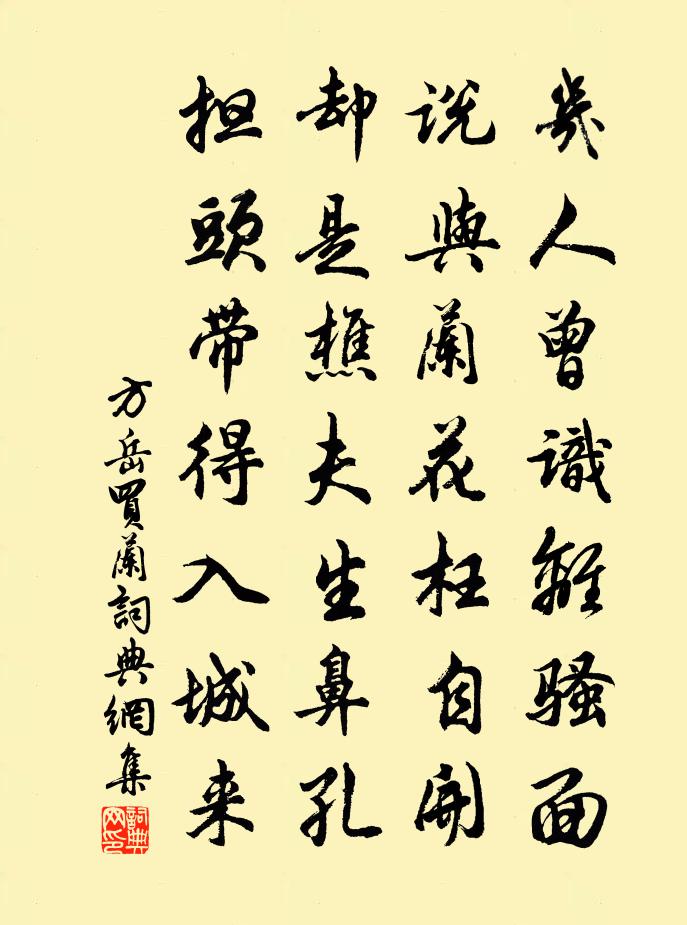 詩詞名句歷史字典書法欣賞書法字典國語詞典說文解字康熙字典古漢語字典標 題 作 者 詩 句 買蘭作者:方岳 朝代:宋代買蘭原文幾人曾識離騷面,說與蘭花枉自開。卻是樵夫生鼻孔,擔頭帶得入城來。詩詞問答問:買蘭的作者是誰?答:方岳問:買蘭寫於哪個朝代?答:宋代方岳買蘭書法欣賞買蘭書法作品詩詞推薦句梅蟠〔宋代〕延相堂前偏利市,袞衣相次又來迎。發孝感張耒〔宋代〕裊裊檣烏轉晚空,娟娟霜月入窗櫳。岸頭楊柳如憐客,猶舞蕭蕭五兩風。三閣詞二首徐照〔宋代〕龔孔與麗華, * 章宵晝。只知歡似前,豈知禍萌後。宿石門葉適〔宋代〕好溪瀉百壑,南北傾萬峰。山凡堆阜俗,映岸羞為容。石門忽秀出,老幹蔭渟洪。舍舟從口入,便已離塵中。眾芳題釣台障子李頻〔唐代〕君家儘是我家山,嚴子前台枕古灣。卻把釣竿終不可,幾時入海得魚還。扈駕馬蘭峪賜觀溫泉恭紀十韻納蘭性德〔清代〕御天來鳳輦,浴日啟龍池。野迥紆皇覽,春濃值聖時。落花縈彩仗,初柳拂朱旗。行漏三辰擁,停鑾萬象隨。瑞徵促促詞張籍〔唐代〕促促復促促,家貧夫婦歡不足。今年為人送租船,去年捕魚在江邊。家中姑老子復小,自執吳綃輸稅錢。家家桑麻方去言府判輓詩二首方回〔宋代〕壬戌同登日,秋崖尚見之。王家子敬字,謝氏惠連詩。鄉校六龍渡,宗盟七桂枝。殘碑麟筆絕,後死嘆吾衰。古陽關/陽關引晁補之〔宋代〕暮草書蛩吟噎。書暗柳螢飛書滅。空庭書雨過,西風緊,飄黃葉。卷書帷寂靜,對此傷離別。重感嘆、中秋數日又再次韻陳造〔宋代〕載羽其觴,客遄於行。歸從我私,茲焉用情。一奇搴秀,萬金論士。生世已後,識古君子。宮倡羽隨,至樂則和。次雪舟進退韻胡仲弓〔宋代〕誰肯因貧賣寶刀,半生湖洚分蹉跎。春回池草吟魂覺,月在梅花瘦影高。旅況又隨年事長,交情偏耐歲寒多。頂斯題明月堂舒坦〔宋代〕郢匠由來巧運斤,清光那復隔織塵。九秋萬里雲頭路,半夜千峰頂上人。坐見乾坤入肝膽,陡驚草木亦精神。應憐題三學山劉西園〔宋代〕棲賢古招提,十里巨松陰。棟宇自隋氏,悠悠歲月深。唐人范生畫,風雨欲剝侵。相傳金仙趾,玉質存至今。星黑憶故人羅公升〔宋代〕檐前一矯首,雲凍天欲愁。客心急歲晚,留滯此何州。黃金不療飢,暖老各一裘。珍重山中人,幅巾自無憂。初夏山居有懷長沙從游四首趙蕃〔宋代〕我愛長沙國,全如洛與伊。諸公早聞道,老我謾耽詩。憶昨相追逐,何知有別離。湘西一回首,莽莽便天涯。和陳叔易就晁以道求長松張表臣〔宋代〕暫隱嵩高六六峰,未乘雲氣御飛龍。自餐白石求黃石,更采長松寄赤松。初夏陸游〔宋代〕江鄉初夏暑猶輕,霽日園林有晚鶯。聊置尊罍師北海,盡除屏障學東平。綠槐露濕單衣爽,紅藥風翻病眼明。每感次韻苗彥先題薛獻可新居四首林季仲〔宋代〕軒檻青紅壓水濱,小橋斜出樹橫陳。功名豫計殊非計,且與龜魚作主人。黃氏沖和堂陸游〔宋代〕沖和堂中和氣襲,堆笏滿床群從集。宜州太史一紙書,百年筆墨猶山立。使君所學何超然?要是胸中不負天。王畿香海棠下會飲項安世〔宋代〕近看成洞遠成林,紅綠參差作晝陰。閒有工夫隨酒去,病無心力為花吟。調朱弄粉年應小,倚困含嬌意卻深。更向名句推薦明月出天山,蒼茫雲海間。李白《關山月》 萬事莫貴於義。墨子《墨子·47章 貴義》 燕子不來花又老,一春瘦的腰兒小。施耐庵《蝶戀花·一別家山音信杳》 茂苑人歸,秦樓燕宿,同惜天涯為旅。吳文英《齊天樂·新煙初試花如夢》 之子歸窮泉,重壤永幽隔。潘安《悼亡詩三首》 微雨眾卉新,一雷驚蟄始。韋應物《觀田家》 松雪飄寒,嶺雲吹凍,紅破數椒春淺。周密《獻仙音·吊雪香亭梅》 城中桃李愁風雨,春在溪頭薺菜花。辛棄疾《鷓鴣天·陌上柔桑破嫩芽》 田田初出水,菡萏念嬌蕊。龔翔麟《菩薩蠻·題畫》 遠牧牛,繞村四面禾黍稠。李涉《牧童詞》