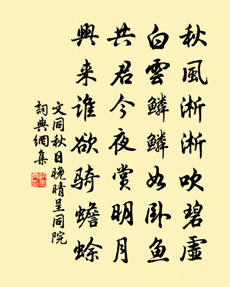 詩詞名句歷史字典書法欣賞書法字典國語詞典說文解字康熙字典古漢語字典標 題 作 者 詩 句 秋日晚晴呈同院作者:文同 朝代:宋代秋日晚晴呈同院原文秋風淅淅吹碧虛,白雲鱗鱗如臥魚。共君今夜賞明月,興來誰欲騎蟾蜍。詩詞問答問:秋日晚晴呈同院的作者是誰?答:文同問:秋日晚晴呈同院寫於哪個朝代?答:宋代文同秋日晚晴呈同院書法欣賞秋日晚晴呈同院書法作品詩詞推薦夜夢故人詩何遜〔南北朝〕客心驚夜魂。言與故人同。開簾覺水動。映竹見床空。浦口望斜月。洲外聞長風。九秋時未晚。千里路難窮。已如擬花蕊亞披紅詩楊萬里〔宋代〕花密非無蕊,繽紛亂眼中。千枝相亞鬧,一色總成紅。赴曉桃如積,爭晴杏欲烘。金須迷不見,玉頰醉來同。頓覺拜明招二先生墓有感王柏〔宋代〕束髮家庭識所宗,平生心在瓣香中。白頭始下券台拜,的的精誠自感通。及瓜將行留別南山方希覺〔宋代〕南山陳跡遍搜尋,好景森羅直萬金。別後不知誰念我,經營偏費主人心。丁未春日瓶中梅殊未開二首范成大〔宋代〕暖合無人到,寒枝為我橫。情鍾吹蕊破,靜極覺香生。老去魂休斷,春來眼且明。逃禪時索笑,百匝傍窗行。酬謝商秘丞見贈詩牌魏野〔宋代〕初得春方暖,今來歲已闌。紫泥辭卻易,白雪和終難。頻拂心寧倦,時吟齒覺寒。會須親謝去,閒拄折魚竿。西陵口觀海薛據〔唐代〕長江漫湯湯,近海勢彌廣。在昔胚渾凝,融為百川泱。地形失端倪,天色灒滉漾。東南際萬里,極目遠無象。山影和通判直閣立春聞鶯姚勉〔宋代〕畫角聲中曉喚春,依城柳眼又精神。試呼臘蟻梅邊酌,恰喜朝鶯雪底新。幽谷暖融空翠濕,上林香動軟紅塵。燕樓春日過田明府遇焦山人蘇廣文〔唐代〕陶公歸隱白雲溪,買得春泉溉藥畦。夜靜林間風虎嘯,月明竹上露禽棲。陳倉邑吏驚烽火,太白山人訝鼓鼙。相見送知殿釋慧空〔宋代〕黑月夜中無別,行人下足即疑。須得心燈發現,令渠是處光輝。南陵別兒童入京李白〔唐代〕白酒新熟山中歸,黃雞啄黍秋正肥。呼童烹雞酌白酒,兒女嬉笑牽人衣。高歌取醉欲 * ,起舞落日爭光輝。遊說和趙晦之司戶三首鄭剛中〔宋代〕文士務悅目,常患器局卑。余雖嗜古勁,而乏撫媚姿。袖繹起深愧。漸摩賴良規。溫言謾相訹,何以慰所思。送羊振文先輩往桂陽歸覲司馬都〔唐代〕此去歡榮冠士林,離筵休恨酒杯深。雲梯萬仞初高步,月桂余香尚滿襟。鳴棹曉沖蒼靄發,落帆寒動白華吟。君家賦秋鴻送劉衡州梅堯臣〔宋代〕秋鴻整羽翮,去就自因時。往春南方來,遂止天泉池。天泉水清泚,鴛鷺日追隨。蒲藻豈不樂,江湖信所宜。今朝戲唐仁烈(一作歲日先把屠蘇酒戲唐仁烈)裴夷直〔唐代〕自知年幾偏應少,先把屠蘇不讓春。倘更數年逢此日,還應惆悵羨他人。讀張忠獻公謚冊感嘆楊萬里〔宋代〕恩視韓兼趙,名均獻與忠。禮中非不極,勛外若為同。三聖無多學,千年僅一翁。猶憐公議在,拼淚乞秋風。化氈頌黃庭堅〔宋代〕奪卻群生夏衣,成得衲僧臥具。為伊業識茫茫,所以一奪一與。三百四百野狐隊,中有一兩個不瞌睡。十方虛空百醉中戲贈鄭使君(時使君先歸,留妓樂重飲)白居易〔唐代〕密座移紅毯,酡顏照淥杯。雙娥留且住,五馬任先回。醉耳歌催醒,愁眉笑引開。平生少年興,臨老暫重來。醉花陰(試茶)舒亶〔宋代〕露芽初破雲腴細。玉纖纖親試。香雪透金瓶,無限仙風,月下人微醉。相如消渴無佳思。了知君此意。不信老盧郎景丹徐鈞〔宋代〕領兵赴難共成名,良為吾來事可成。終把故鄉旌異賞,肯令衣錦向宵行。名句推薦笑別廬山遠,何煩過虎溪。李白《別東林寺僧》 猶喜閏前霜未下,菊邊依舊舞身輕。司空圖《白菊三首》 別夢依依到謝家,小廊回合曲闌斜。張泌《寄人》 君懷良不開,賤妾當何依。曹植《明月上高樓》 知君用心如日月,事夫誓擬同生死。張籍《節婦吟·寄東平李司空師道》 風蕭蕭兮易水寒,壯士一去兮不復還。佚名《荊軻歌 / 渡易水歌》 淑氣催黃鳥,晴光轉綠蘋。杜審言《和晉陵陸丞早春遊望》 來是空言去絕蹤,月斜樓上五更鐘。李商隱《無題四首》 西園何限相思樹,辛苦梅花候海棠。元好問《鷓鴣天·候館燈昏雨送涼》 舊時茅店社林邊,路轉溪橋忽見。辛棄疾《西江月·夜行黃沙道中》
