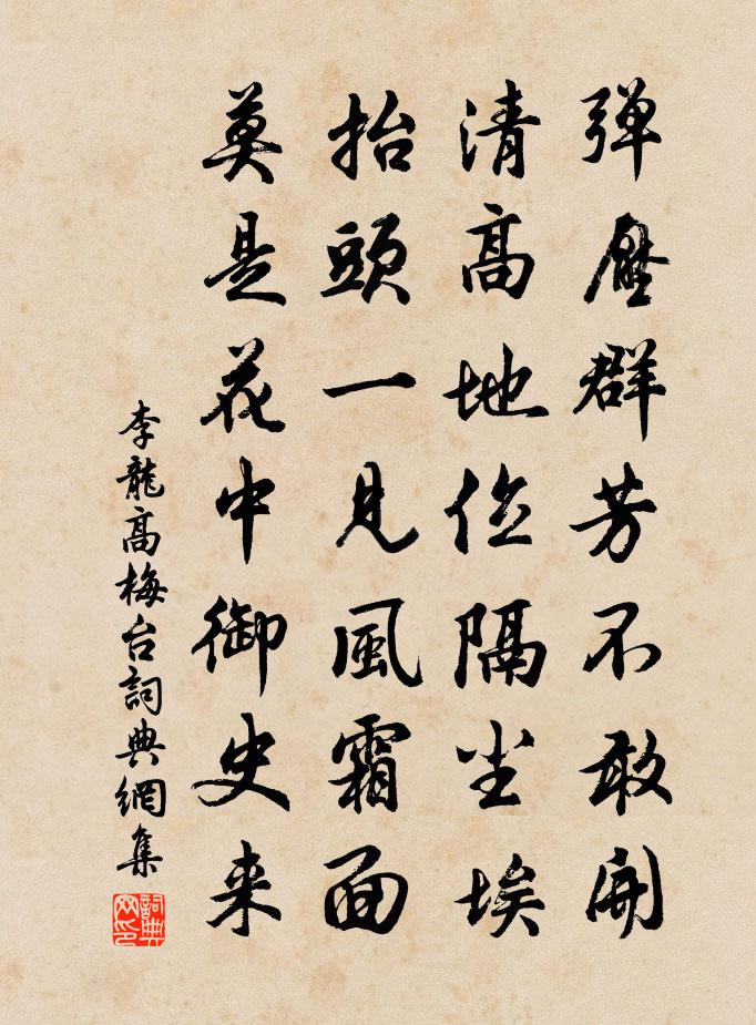詩詞名句歷史字典書法欣賞書法字典國語詞典說文解字康熙字典古漢語字典標 題 作 者 詩 句 梅台作者:李龍高 朝代:宋代梅台原文彈壓群芳不敢開,清高地位隔塵埃。抬頭一見風霜面,莫是花中御史來。詩詞問答問:梅台的作者是誰?答:李龍高問:梅台寫於哪個朝代?答:宋代李龍高梅台書法欣賞梅台書法作品詩詞推薦【中呂】滿庭芳 漁趙顯宏〔元代〕江天晚霞,舟橫野渡,網曬汀沙。一家老幼無牽掛,恣意喧譁。新糯酒香橙藕芽,錦鱗魚紫蟹紅蝦。杯盤罷,爭些扇子峽山腹有草閣小亭極幽邃意其非俗人居也陸游〔宋代〕絕境慰人心,誰家住玉岑?亂雲生翠竇,密雪灑青林。高閣臨空豁,孤亭隱邃深。定知非俗士,櫓急不容尋。聽歌六絕句。樂世(一名六么)白居易〔唐代〕管急弦繁拍漸稠,綠腰宛轉曲終頭。誠知樂世聲聲樂,老病人聽未免愁。上雲樂 方諸曲蕭衍〔南北朝〕方諸上。上雲人。業守仁。摐金集瑤池。步光禮玉晨。霞蓋容長肅。清虛伍列真。龍翔寺居喜胡權見訪因宿喻鳧〔唐代〕林棲無異歡,煮茗就花欄。雀啅北岡曉,僧開西閣寒。沖橋二水急,扣月一鍾殘。明發還分手,徒悲行路難。贈鄭國莊穆公主輓歌二首權德輿〔唐代〕追飾崇湯沐,遺芳藹禁闈。秋原森羽衛,夜壑掩容輝。睿藻悲難盡,公宮望不歸。笳簫向煙霧,疑是彩鸞飛。舊館清明日憶諸弟韋應物〔唐代〕冷食方多病,開襟一忻然。終令思故郡,煙火滿晴川。杏粥猶堪食,榆羹已稍煎。唯恨乖親燕,坐度此芳年。述九頌耀德程公許〔宋代〕郊見帝兮琮璜,瑟彼瓚兮流斯黃。物有專兮靈粹,寧糅雜兮尋常。懿君子兮毓協,可蠡測兮蘊藏。稟堪輿兮間氣,避寇白沙驛作貫休〔唐代〕避亂無深淺,蒼黃古驛東。草枯牛尚齕,霞濕燒微紅。□□時時□,人愁處處同。猶逢好時否,孤坐雪濛濛。行經古墓詩陰鏗〔南北朝〕偃松將古墓。年代理當深。表柱應堪燭。碑書欲有金。逈墳由路毀。荒隧受田侵。霏霏野霧合。昏昏隴日沉。懸劍聲聲慢(和韻賦江梅)李曾伯〔宋代〕修潔孤高,凌霜傲雪,蕭然塵外丰姿。一白無瑕,玉堂茅舍俱宜。飄飄羽衣縞袂,都不染、富貴膏脂。調羹事,看鷓鴣天佚名〔宋代〕香霧氤氳結彩山。蓬萊頂上駕頭還。繡韉狨坐三千騎,玉帶金魚四十班。風細細,佩珊珊。一天和氣轉春寒。千門重次臞軒韻二首劉克莊〔宋代〕憶昔抽毫白玉堂,奏篇字字谷年荒。內人久已呼才子,明主今方記寢郎。駑豆未應堪秣驥,鶉籠誰道可容皇。何當湖上晚望寄友人釋智圓〔宋代〕不得天涯信,相思對景濃。驚飆吹落葉,殘日在遙峰。照水魚村火,沈煙野寺鐘。幽懷向誰說,靜立自搘筇。早秋釋智圓〔宋代〕雨歇變氣候,空庭葉颼颼。閒聽一枝風,乃知千里秋。百蟲鳴四壁,新月生高樓。登樓看明月,濤光滿林丘。人生野興陸游〔宋代〕紅飯青蔬美莫加,鄰翁能共一甌茶。舍西日緊花房斂,港北風生柳腳斜。筇杖不妨閒有伴,茆檐終勝老無家。自驚奉餞元侍郎加豫章採訪兼賜章服(時初停節度)劉長卿〔唐代〕任重兼烏府,時平偃豹韜。澄清湘水變,分別楚山高。花對彤襜發,霜和白雪操。黃金裝舊馬,青草換新袍。嶺暗寄居邠趙蕃〔宋代〕黃溪茶種有閩風,憶昨緘封自贊公。筠焙久空青箬里,紙囊盍寄白雲中。寄羅主管四首項安世〔宋代〕把酒東南望,關心歙水邊。三君同別我,小友不論年。賈虎風行地,王珠月映川。州人亦驚倒,此客定能賢。翠蛟亭兩絕洪咨夔〔宋代〕晴雷碾破白雲窩,無數林華袞下坡。好把轆轤翻轉著,崑崙頂上卷黃河。名句推薦江暗雨欲來,浪白風初起。何遜《相送》 天長地久有時盡,此恨綿綿無絕期。白居易《長恨歌》 紙屏石枕竹方床,手倦拋書午夢長。蔡確《夏日登車蓋亭》 常恐秋節至,焜黃華葉衰。佚名《長歌行》 客思似楊柳,春風千萬條。王安石《壬辰寒食》 人生在勤,不索何獲。范曄《後漢書·列傳·張衡列傳》 占得杏梁安穩處,體輕唯有主人憐,堪羨好因緣。牛嶠《憶江南·銜泥燕》 為君持酒勸斜陽,且向花間留晚照。宋祁《玉樓春·春景》 天下未有不學而成者也。王通《中說·卷六·禮樂篇》 漸老多憂百事忙,天寒日短更心傷。李覯《秋晚悲懷》