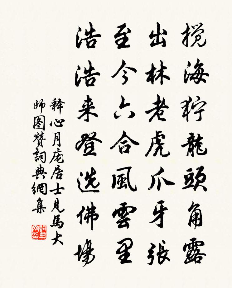 詩詞名句歷史字典書法欣賞書法字典國語詞典說文解字康熙字典古漢語字典標 題 作 者 詩 句 龐居士見馬大師圖贊作者:釋心月 朝代:宋代龐居士見馬大師圖贊原文攪海獰龍頭角露,出林老虎爪牙張。至今六合風雲里,浩浩來登選佛場。詩詞問答問:龐居士見馬大師圖贊的作者是誰?答:釋心月問:龐居士見馬大師圖贊寫於哪個朝代?答:宋代釋心月龐居士見馬大師圖贊書法欣賞龐居士見馬大師圖贊書法作品詩詞推薦寄景孺提刑文同〔宋代〕江由岩嶮地,萬木與雲齊。弭節山中宿,思歸夜半啼。麝香沾野草,虎跡滑春泥。到此須憑酒,何人手可攜。景安錄示舊雪詩擬簡齋走筆賦所感奉謝方回〔宋代〕名都十萬戶,擁貂者為誰。一二達官外,絮纊或無之。南雪壓瘴癘,此事不可遲。窶人既雲眾,速霽斯為宜。天公和鮑倅吳芾〔宋代〕彯纓誰不是王臣,抗志如今有幾人。墜典固嘗深探討,頹綱猶未許彌綸。擬歸舊隱消殘臘,旋買新田作好春。聖主九宮山謝枋得〔宋代〕真人何人結幽棲,累世奎光煥紫泥。日月高奔黃道近,衡廬傍出玉繩低。錢續古贅趙氏方鳳〔宋代〕年華冠帶玉輝輝,本悟秦風出贅扉。為要權宜就家室,不妨暫時別庭幃。化推正始余麟厚,占協和鳴待鳳飛。老我卜運算元 飲酒不寫書辛棄疾〔宋代〕一飲動連宵,一醉長三日。廢盡寒暄不寫書,富貴何由得。請看冢中人,冢似當時筆。萬札千書只恁休,且進杯中送青神宰樊允南解官次杜應求韻史堯弼〔宋代〕並轡中岩寺,芳樽一破愁。更寒譚袞袞,雲曉玉浮浮。會有相從樂,還如此地不。合離真有數,那敢作人謀。送石長卿太學秋補黃庭堅〔宋代〕長卿家亦但四壁,文君窺之介如石。胸中已無少年事,骨氣乃有老松格。漢文新覽天下圖,詔山采玉淵獻珠。再三詩呈同院溫益〔宋代〕秋日同文館,文編亦共攜。升沉都莫問,榮辱已能齊。酒美何妨醉,詩成強自題。從容約歸日,訪子省闈西。贈廬山崇勝珂長老祖無擇〔宋代〕珂也僧中秀,曹溪得祖衣。雲泉聊適性,缾錫遂忘歸。九月秋風老,千山暮雨霏。我來陪靜話,相對兩無機。水調歌頭辛棄疾〔宋代〕我志在寥闊,疇昔夢登天。摩挲素月,人世俯仰已千年。有客驂麟並鳳,雲遇青山赤壁,相約上高寒。酌酒援北斗重和韓偓〔唐代〕冷宴殷勤展小園,舞鞇柔軟彩虬盤。篸花盡日疑頭重,病酒經宵覺口乾。嘉樹倚樓青瑣暗,晚雲藏雨碧山寒。文章送李秀才歸江南(一作送孫革及第歸江南)韓翃〔唐代〕過淮芳草歇,千里又東歸。野水吳山出,家林越鳥飛。荷香隨去棹,梅雨點行衣。無數滄江客,如君達者稀。代人上平江徐郎五首曾協〔宋代〕秋到人間斂麴塵,於門初見矞星辰。須知宇內風雲合,況是天邊雨露新。盛德可容窺底蘊,殊功端自見經綸。不應醜奴兒(子母猿)張炎〔宋代〕山人去後知何處,風月清虛。來往無拘。戲引兒孫樂有餘。懸崖掛樹如相語,常守枯株。久與人疏。閒了當年一卷贈鄰里往還白居易〔唐代〕問予何故獨安然,免被饑寒婚嫁牽。骨肉都盧無十口,糧儲依約有三年。但能斗藪人間事,便是逍遙地上仙。唯恐再用韻答謝石嶼庾使趙汝騰〔宋代〕一翁閒伴兩星台,亭畔看花花半開。我盍歸田垂釣隱,公行持橐侍鸞回。流鶯似避宮妝靚,黃鵠曾將蜀種來。二妙四先生像贊晦庵朱文公劉黻〔宋代〕天振斯文,紫陽木鐸。博詳反約,是繼絕學。日月昭炳,揭之以行。閒居野服,身屈道亨。減字木蘭花沈瀛〔宋代〕荷公臨止。賓客慣看兒亦喜。歌雅歌風。通鑑通書又史通。欲相酹酒。瓦缶田家羞出壽。甚欲舟何。愧沒瑤觴玉斝寄晁元中十首黃庭堅〔宋代〕濟岱有佳人,肌膚若冰雪。我願從之游,補我黥與刖。了不解人嗔,真成一痴絕。櫟社定頹然,聊用神吾拙。名句推薦九日龍山飲,黃花笑逐臣。李白《九日龍山飲》 池台竹樹三畝餘,至今人道江家宅。劉禹錫《金陵五題·並序》 北窗高臥,莫教啼鳥驚著。辛棄疾《念奴嬌·賦雨岩》 眾鳥高飛盡,孤雲獨去閒。李白《獨坐敬亭山》 要問相思,天涯猶自短。晏幾道《清商怨·庭花香信尚淺》 世之道,人不自害而人害也;人之道,人不恕己而自恕也。來俊臣《羅織經·保身卷第七》 魏都接燕趙,美女夸芙蓉。李白《魏郡別蘇明府因北游》 春色將闌,鶯聲漸老。紅英落盡青梅小。寇準《踏莎行·春色將闌》 皮之不存,毛將安傅?左丘明《左傳·僖公·僖公十四年》 夜長爭得薄情知,春初早被相思染。姜夔《踏莎行·自沔東來》
