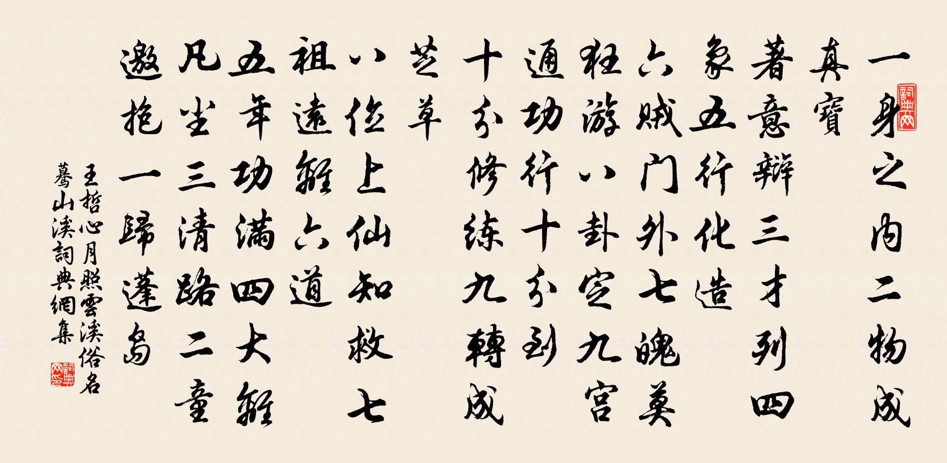 詩詞名句歷史字典書法欣賞書法字典國語詞典說文解字康熙字典古漢語字典標 題 作 者 詩 句 心月照雲溪 俗名驀山溪作者:王哲 朝代:元代心月照雲溪 俗名驀山溪原文一身之內,二物成真寶。著意辯三才,列四象、五行化造。六賊門外,七魄莫狂游,八卦定,九宮通,功行十分到。十分修練,九轉成芝草。八位上仙知,救七祖、遠離六道。五年功滿,四大離凡塵,三清路,二童邀,抱一歸蓬島。詩詞問答問:心月照雲溪 俗名驀山溪的作者是誰?答:王哲問:心月照雲溪 俗名驀山溪寫於哪個朝代?答:元代問:心月照雲溪 俗名驀山溪是什麼體裁?答:詞王哲心月照雲溪 俗名驀山溪書法欣賞心月照雲溪 俗名驀山溪書法作品詩詞推薦宿紫閣山北村白居易〔唐代〕晨游紫閣峰,暮宿山下村。村老見余喜,為余開一尊。舉杯未及飲,暴卒來入門。紫衣挾刀斧,草草十餘人。奪我偶書邵雍〔宋代〕妻強夫殃,奴強主殃,臣強君殃。尾大於身,不堅於霜。辯之不早,國破家亡。燈詞姜夔〔宋代〕沙河雲合無行處,惆悵來游路已迷。卻入靜坊燈火空,門門相似列蛾眉。九月十四日夜雞初鳴夢一故人相語曰我為蓮華陸游〔宋代〕白首歸修汗簡書,每因囊粟戲侏儒。不知月給千壺酒,得似蓮華博士無?大雲寺贊公房四首杜甫〔唐代〕心在水精域,衣沾春雨時。洞門盡徐步,深院果幽期。到扉開復閉,撞鐘齋及茲。醍醐長發性,飲食過扶衰。把臂春野五首宋庠〔宋代〕衡蓽負城開,春兼野色來。煙扶霽日柳,雪惱故年梅。波影魚先動,林聲鳥並催。欣欣群意悅,病骨獨邅回。寄題洛陽致政張少卿靜居堂歐陽修〔宋代〕洛人皆種花,花發有時闌。君家獨種玉,種玉產琅玕。子弟守家法,名聲聳朝端。歲時歸拜慶,閭里亦相歡。西台江乾覽鏡陽枋〔宋代〕千重涌淺身曾過,萬頃湖深也去來。平地雪中蕭店宿,掀天浪里片帆開。干戈鼎沸騰還失,炎暑甑蒸師正災。小艇行徑薛能〔唐代〕盤逕入依依,旋驚幽鳥飛。尋多苔色古,踏碎籜聲微。鞭節橫妨戶,枝梢動拂衣。前溪聞到處,應接釣魚磯。出塞(春寒有感)辛棄疾〔宋代〕鶯未老。花謝東風掃。鞦韆人倦彩繩閒,又被清明過了。日長減破夜長眠,別聽笙簫吹曉。錦箋封與怨春詩,寄與和周仲嘉再示三篇王洋〔宋代〕舊日衣冠說開林,風流曾不減山陰。百年人物千山秀,萬里功名天下心。族姓人人夸盛事,溪山處處稱高吟。後生書文與可墨竹蘇軾〔宋代〕筆與子皆逝,詩今誰為新。空遺運斤質,卻吊斷弦人。題醉僧圖黃文雷〔宋代〕僧之飲帶,地獄咫尺。此僧飲酒,天龍辟易。僧之飲酒,背帶抵諱。此僧飲酒,口角觱沸。披毛帶角即不理,倒階郊廟歌辭享文敬太子廟樂章請神許孟容〔唐代〕觴牢具品,管磬有節。祝道夤恭,神儀昭晰。桐圭早貴,象輅追設。聲達樂成,降歆豐潔。終南山下作孟郊〔唐代〕見此原野秀,始知造化偏。山村不假陰,流水自雨田。家家梯碧峰,門門鎖青煙。因思蛻骨人,化作飛桂仙。迎奉聖像四首真宗〔宋代〕玉虛上帝,金像睟容。宅真雲構,練日龜從。維皇對越,率禮寅恭。靈心丕應,福祿來崇。送金昌宗歸錢塘劉長卿〔唐代〕新家浙江上,獨泛落潮歸。秋水照華發,涼風生褐衣。柴門嘶馬少,藜杖拜人稀。惟有陶潛柳,蕭條對掩扉。送趙資政曾鞏〔宋代〕鎮撫西南眾望傾,玉書天上輟持衡。春風不覺岷山遠,和氣還從錦水生。學舍卻尋余教在,棠郊應喜舊陰成。歸來清平樂 題碧梧蒼石圖 珊瑚網名書題跋卷八衛德嘉〔元代〕彩雲飛斷。愁思茫無岸。落日平蕪煙水漫。又見去年歸雁。琵琶舊曲難成。風流誰復如卿。滿耳碧梧秋雨,潯陽江讀秦紀蕭澥〔宋代〕築了連雲萬里城,春風弦管醉中聽。淒涼六籍寒灰里,宿得鹹陽火一星。名句推薦白髮漁樵江渚上,慣看秋月春風。楊慎《臨江仙·滾滾長江東逝水》 平生多感激,忠義非外獎。李白《酬裴侍御對雨感時見贈》 公乎躍馬揚玉鞭,滅沒高蹄日千里。溫庭筠《拂舞詞 / 公無渡河》 唯有門前鏡湖水,春風不改舊時波。賀知章《回鄉偶書二首》 見善,修然必以自存也;見不善,愀然必以自省也。善在身,介然必以自好也;不善在身,菑然必以自惡也。荀子《荀子·修身》 堪笑楚江空渺渺,不能洗得直臣冤。文秀《端午》 海燕未來人鬥草,江梅已過柳生綿。李清照《浣溪沙·淡盪春光寒食天》 望中酒旆閃閃,一簇煙村,數行霜樹。柳永《夜半樂·凍雲黯淡天氣》 上有青冥之長天,下有淥水之波瀾李白《長相思·其一》 粽包分兩髻,艾束著危冠。陸游《乙卯重五詩》