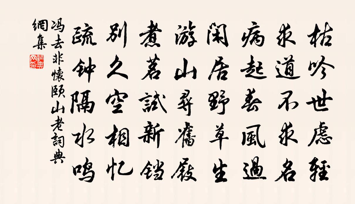 詩詞名句歷史字典書法欣賞書法字典國語詞典說文解字康熙字典古漢語字典標 題 作 者 詩 句 懷頤山老作者:馮去非 朝代:宋代懷頤山老原文枯吟世慮輕,求道不求名。病起春風過,閒居野草生。游山尋舊屐,煮茗試新鐺。別久空相憶,疏鍾隔水鳴。詩詞問答問:懷頤山老的作者是誰?答:馮去非問:懷頤山老寫於哪個朝代?答:宋代問:懷頤山老是什麼體裁?答:五律馮去非懷頤山老書法欣賞懷頤山老書法作品詩詞推薦偈頌一百二十三首釋崇岳〔宋代〕年年此日潑惡水,個事從悉達多起。自雲遍界獨稱尊,後代兒孫誰管你。夢遊秦宮(一作題宮門)沈亞之〔唐代〕君王多感放東歸,從此秦宮不復期。春景似傷秦喪主,落花如雨淚胭脂。山果張舜民〔宋代〕煮酒堆山果,新茶下粉團。似梅嫌足核。如蜜少加酸。公子傾金彈,行人漏蠟丸。吾鄉元不識,歸日畫圖看。暮春龜堂即事陸游〔宋代〕日月無根去若馳,故園又見落花時。杯中綠酒不肯飲,鏡里蒼顏應自知。千丈新堤湖水滿,五更殘漏角聲悲。暮年東岡王安石〔宋代〕東岡歲晚一登臨,共望長河映遠林。萬竅怒呺風喪我,千波競湧水無心。成都運司西園亭詩玉溪堂許將〔宋代〕朱堂俯玉溪,玉溪清且幽。從公暫偃息,撫景空夷猶。浮雲冠圓島,白日回方流。抵此有光碧,何必崑崙洲。程大卿書宿猿洞陳襄〔宋代〕聞說山光是舊山,衣冠家此百年間。自嗟亦有同來祖,兩處松楸得往還。憶仙姿(九之六)賀鑄〔宋代〕柳下玉驄雙鞚。蟬鬢寶鈿浮動。半醉倚迷樓,聊送斜陽三弄。豪縱。豪縱。一覺揚州春夢。雨中自萬壽宮歸張瓊〔宋代〕草草登臨未擬回,煙昏雨濕賦歸哉。山寒未放遷鶯出,地勝先聞駕鶴來。老去春光都是夢,嬾邊心事總如灰。歸尋弟觀喜董稼山至有詩因次韻二首陳著〔宋代〕蒼狗白衣紛過雲,到頭故我始為真。山林高看平沈世,風雨難摧獨樂春。時出苦言醫俗耳,多培好事壽閒身。仰天題義門胡氏華林書院宋綬〔宋代〕六闕表門榮,華林地氣靈。烏衣王氏族,玉樹謝家庭。鄒魯多亟犬,荀陳更聚星。怡神虛室白,講學夜燈青。篇籍寄武昌簿孫彥常孔武仲〔宋代〕羈旅悠悠歲月殘,勝游無復似西山。從容把酒來天上,滴瀝嗚泉滿坐間。醉思隨風飄碧落,離襟和月墮荒灣。遙應田家雜興二首方夔〔元代〕樵路通村暗蒺藜,數椽茅蕝護疏籬。陰陰清樾風生樹,拍拍蒼鵝水滿陂。記日旋鋤燒地粟,上時新賣下車絲。晚晴題寐宮詩佚名〔宋代〕農桑不擾幾常登,邊將無功吏不能。四十二年如夢過,東風吹唳灑昭陵。劍客 / 述劍賈島〔唐代〕十年磨一劍,霜刃未曾試。今日把示君,誰有不平事。金剛隨機無盡頌福智無比分第二十四釋印肅〔宋代〕無為福勝田,頓覺如來禪。阿鼻剎那滅,八萬及四千。楚狂接輿歌先秦無名〔先秦〕鳳兮鳳兮何德之衰。往者不可諫。來者猶可追。已而已而。今之從政者殆而。悼室人詩江淹〔南北朝〕夏雲多雜色。紅光鑠蕤鮮。苒弱屏風草。潭拖曲池蓮。黛葉鑒深水。丹華香碧煙。臨彩方自吊。擥氣以傷然。命知山行愁思羅與之〔宋代〕日落煙欲橫,山寒翠將滴。荒村渺愁人,跬步觸四塞。路遙兩髀酸,頗恨身不翼。舍策還悵然,倦倚松下石。游龍山寺六祖故居也胡寅〔宋代〕范陽盧以仕南遷,卜宅空山不計年。間氣有鍾超象類,美材無匠制方圓。誰能判斷風旛話,等是追隨粥飯緣。攜客名句推薦輕淘起,香生玉塵,雪濺紫甌圓。米芾《滿庭芳·詠茶》 總把春山掃眉黛,不知供得幾多愁?李商隱《代贈二首》 李白如今已仙去,月在青天幾圓缺?唐寅《把酒對月歌》 欲剪箱中一尺天,吳娥莫道吳刀澀李賀《羅浮山父與葛篇》 日日深杯酒滿,朝朝小圃花開。朱敦儒《西江月·日日深杯酒滿》 三人行,必有我師焉。擇其善者而從之,其不善者而改之。孔子弟子《論語·述而篇》 生則盡力,死則死耳!張廷玉《明史·列傳·卷二十》 思牽今夜腸應直,雨冷香魂吊書客。李賀《秋來》 還卿一缽無情淚,恨不相逢未剃時。蘇曼殊《本事詩十首·選二》 人間萬事,毫髮常重泰山輕。辛棄疾《水調歌頭·壬子三山被召陳端仁給事飲餞席上作》