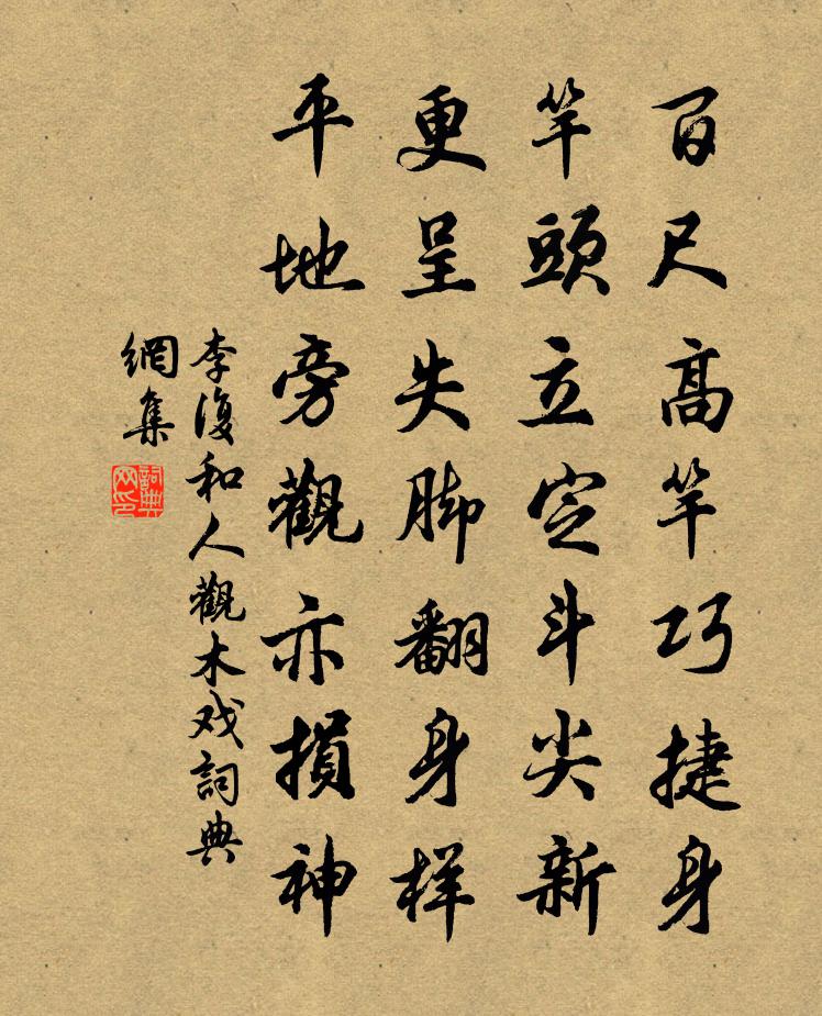 詩詞名句歷史字典書法欣賞書法字典國語詞典說文解字康熙字典古漢語字典標 題 作 者 詩 句 和人觀木戲作者:李復 朝代:宋代和人觀木戲原文百尺高竿巧捷身,竿頭立定斗尖新。更呈失腳翻身樣,平地旁觀亦損神。詩詞問答問:和人觀木戲的作者是誰?答:李復問:和人觀木戲寫於哪個朝代?答:宋代李復和人觀木戲書法欣賞和人觀木戲書法作品詩詞推薦春日寄岳州從事李員外二首溫庭筠〔唐代〕苒弱樓前柳,輕空花外窗。蝶高飛有伴,鶯早語無雙。剪勝裁春字,開屏見曉江。從來共情戰,今日欲歸降。從小重遊道岩吳棟〔宋代〕玄都重到拂題塵,屈指於今十四春。白石煙消丹灶冷,蒼崖日永畫樓新。山中自笑黔驢技,天外誰知海鶴身。洞口偈六十九首釋道寧〔宋代〕脫透玄關,更無凝滯。一瞖落眼,空華亂墜自詠陸游〔宋代〕宦遊疇昔偏天涯,萬里東歸歲月賒。古道泥塗居士屩,荒畦煙雨故侯瓜。園公溪父逢皆友,野寺山郵到即家。病思野步張耒〔宋代〕帶水依城一徑微,出城桃杏雨來枝。最憐楊柳身無力,付與春風自在吹。孤鶩李復〔宋代〕孤鶩何時失舊群,空郊迥立如長人。疾風拂地忽驚顧,欲起不起低昂頻。遼東八月霜氣早,萬里旅飛來南賓。雲間餘寒劉克莊〔宋代〕老子今年八十三,怕寒渾未試春衫。尚存晉宋間人意,折得南枝帶雪簪。寄蔡昆宋白〔宋代〕卻憶醉相逢,雲深太白東,離別經臘雪,魂夢又春風。芳草晴天滋闊,黃鸝細雨中。倚筇愁望處,煙樹過錯蒙籠。木蘭花慢 轉輪丘處機〔元代〕嘆靈源曠代,本無極,信優遊。自朴散形生,銷磨混沌,落入行囚。**四方宛轉,向迷津、大海苦淹留。法界群句趙訥軒〔宋代〕門外須臾風竹定,櫓聲搖曳出蘆花。白鳥一雙簾外去,蘆花風靜釣舟閒。偈頌四十一首釋普寧〔宋代〕臘月八夜眼見鬼,便開大口說道理。若向衲僧門下過,爛槌一頓無疑矣。柳長春(上董倅)趙長卿〔宋代〕梅喜先春,雁驚未臘。於門瑞氣浮周匝。正當月應上弦時,長庚夢與良辰合。螺水恩濃,旴江德洽。壽杯勸處燃紅久過重陽菊英粲然即事十首方回〔宋代〕早伴茱萸插帽紗,尚堪薦酒更堪茶。花邊行立花邊坐,不是閒花是菊花。暮秋陸游〔宋代〕十日都門雨,風煙己暮秋。甑香新菽粟,篝暖故衣裘。意氣臨書健,形骸顧影愁。何時剡中路,秣蹇憩山郵?感懷示兒輩辛棄疾〔宋代〕窮處幽人樂,徂年烈士悲。歸田曾有志,責子且無詩。舊恨王夷甫,新交蔡克兒。淵明去我久,此意有誰知。神光燦王處一〔元代〕石中隱玉,蚌內藏珠,須憑匠手功夫。裡面真光,顯現恰似元初。欲要明心識性,把般般、打破空虛。清淨處,見對月寄同志劉得仁〔唐代〕霜滿中庭月在林,塞鴻頻過又更深。支頤不語相思坐,料得君心似我心。頌古八首釋道顏〔宋代〕四海同一家,萬口同一舌。趙州勘婆子,有理向誰說。已亥雜詩 62龔自珍〔清代〕古人制字鬼神泣,後人識字百憂集。我不畏鬼復不憂,靈文夜補秋燈碧。自桃川至辰州絕句四十有二趙蕃〔宋代〕咫尺青山曉未分,旋開還吐尚紛紛。煙雲變態有如此,安得斯奇付大文。名句推薦東風不與周郎便,銅雀春深鎖二喬。杜牧《赤壁》 異鄉物態與人殊,惟有東風舊相識歐陽修《春日西湖寄謝法曹歌》 日往菲薇,月來扶疏。左思《三都賦》 滿目山河空念遠,落花風雨更傷春。晏殊《浣溪沙·一向年光有限身》 春來遍是桃花水,不辨仙源何處尋。王維《桃源行》 臣無隱忠,君無蔽言,國之祿也。劉向《戰國策·趙二·武靈王平晝閒居》 晴雲滿戶團傾蓋,秋水浮階溜決渠。杜甫《柏學士茅屋》 予若洞庭葉,隨波送逐臣。李白《送郄昂謫巴中》 明月松間照,清泉石上流。王維《山居秋暝》 乃翁知國如知兵,塞垣草木識威名。黃庭堅《送范德孺知慶州》