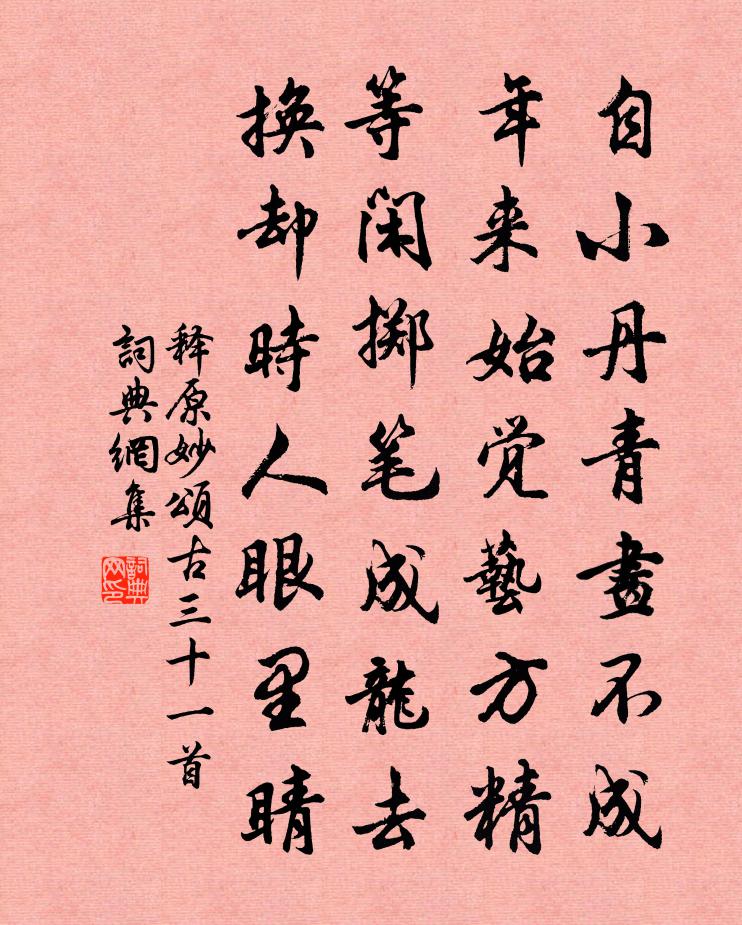 詩詞名句歷史字典書法欣賞書法字典國語詞典說文解字康熙字典古漢語字典標 題 作 者 詩 句 頌古三十一首作者:釋原妙 朝代:宋代頌古三十一首原文自小丹青畫不成,年來始覺藝方精。等閒擲筆成龍去,換卻時人眼裡睛。詩詞問答問:頌古三十一首的作者是誰?答:釋原妙問:頌古三十一首寫於哪個朝代?答:宋代釋原妙頌古三十一首書法欣賞頌古三十一首書法作品詩詞推薦寄姜梅山雷字詩陸游〔宋代〕章台官柳映宮槐,寶馬蹄輕不動埃。只怪好詩無與敵,誰知古學有從來。江山常逐客帆遠,歲月不禁衙鼓催。剩約用前韻呈照老李流謙〔宋代〕吏部稱文暢,愚溪進浩初。深慚詆佛奏,更著廣交書。情契遠猶合,義乘隣亦疎。詫予無騃習,固自起犁鋤。方竹杖和功遠李廌〔宋代〕性稟方外正,人憐節瘦輕。持攜防水潦,殺活奈山精。直以中圓稱,名因義類清。若將靈壽比,未可賤書生。和象之雨後望少室山白雲黃庶〔宋代〕塵埃奔趨插手板,十年已賣山中閒。相逢少室若交舊,白雲與我開容顏。風驅煙氣雲敝幕,天覆碧玉無瑕瘢。我疑酬陳校書見寄趙希邁〔宋代〕日長松院靜,孤坐對殘編。雨久波平岸,山高燒接天。春酲茶可解,詩病藥難痊。獨喜君清政,南中客共傳。雪徐元傑〔宋代〕瓦聲初聽響疏疏,頃刻庭除百斛珠。寒雀不知來啄米,群雞粥粥亦相呼。月夜趙蕃〔宋代〕振厲山風作,咆哮澗水喧。不堪蛙取鬧,更奈鴨能言。月色雖雲好,雲浮竟自繁。白頭清不寐,止酒罷芳樽。句趙師睪〔宋代〕都在吟情句眼中。假中閉戶終日偶得絕句陸游〔宋代〕老夫昔是青城客,酒肉淋漓豈本心。還我山家本來面,數拳春筍薦孤斟。送劉{弓弓夂}秘校赴婺源梅堯臣〔宋代〕雲木蔥蘢處,雞鳴古縣城。山高地多險,源近水偏清。斫漆資商貨,栽茶雜賦征。案頭龍尾硯,切莫苦求精。亦好園海棠秋開紅英滿樹喻良能〔宋代〕微雲澹日映寒流,畫出西園一幅秋。白帝幻成紅玉蘂,金風吹綻碧枝頭。睡余艷艷真妃子,夢罷愔愔一解愁。熟賞送潛同年調官歸洪咨夔〔宋代〕以君一年長,為我異姓兄。衡從玄圃玉,出入武庫兵。急手搏蒼兕,雋氣鞭長鯨。議論到千古,慷慨吐不平。漢以臨江仙石孝友〔宋代〕一霎狂雲驚雨過,月華恰到簾帷。檻前疊石翠參差。洞房相見處,燈 * 涼時。睡玉眠花愁夜短,匆匆共惜佳期。春月勸農至華林寺周震〔宋代〕飛廉怒息海天明,十里籃輿出勸耕。隴麥低頭須雨意,林花仰面笑春晴。熙寮連轡勤因事,父老傳杯識至情。及物永遇樂王仲甫〔宋代〕風折新英,雨肥繁實,又還如豆。玉核初成,紅腮尚淺,齒軟酸透。粉牆低亞,佳人驚見,不管露沾襟袖。一枝釵贈川官五星先生王邁〔宋代〕談星這士如星密,得似川官萬之一。雅籌到手疾如飛,口觜翻瀾眼波碧。相逢笑問雌甲辰,掀髯慫惥曲江春。自憐戲作舒岳祥〔宋代〕莫笑山居僻,山居號令明。芭蕉工報雨,鴝鵒解知更。樵長專封拜,詩壇擁甲兵。開窗一壺酒,新句賞新晴。道傍菊高邁〔宋代〕荊棘叢中是故鄰,更無君子與相親。含英吐秀西風裡,空把芳心向路人。紹興以後祀五方帝六十首佚名〔宋代〕萬彙揫斂,時惟冬序。蠢爾黎氓,入此室處。酌獻告神,禮以時舉。賴此陰下,民有所怙。中秋步月羅與之〔宋代〕幽人披襟來,步此一庭月。如渡滹沱冰,似泛山陰雪。誰將羌管急,間彼鄰杵切。冉冉秋思生,令人慾愁絕。名句推薦疏是枝條艷是花,春妝兒女競奢華。曹雪芹《詠紅梅花得“花”字》 利莫長乎簡,福莫久於安。韓非及後人《韓非子·大體》 鳳林關里水東流,白草黃榆六十秋。張籍《涼州詞三首·其三》 北方有佳人,絕世而獨立。李延年《李延年歌》 晴風初破凍,柳眼梅腮,已覺春心動。李清照《蝶戀花·暖雨晴風初破凍》 馬毛縮如蝟,角弓不可張。鮑照《代出自薊北門行》 此身如傳舍,何處是吾鄉。蘇軾《臨江仙·送王緘》 高風吹玉柱,萬籟忽齊飄司空曙《風箏》 生前心已碎,死後性空靈。曹雪芹《紅樓夢·第五回》 綠暗汀州三月暮,落花風靜帆收。晁補之《臨江仙·綠暗汀洲三月暮》