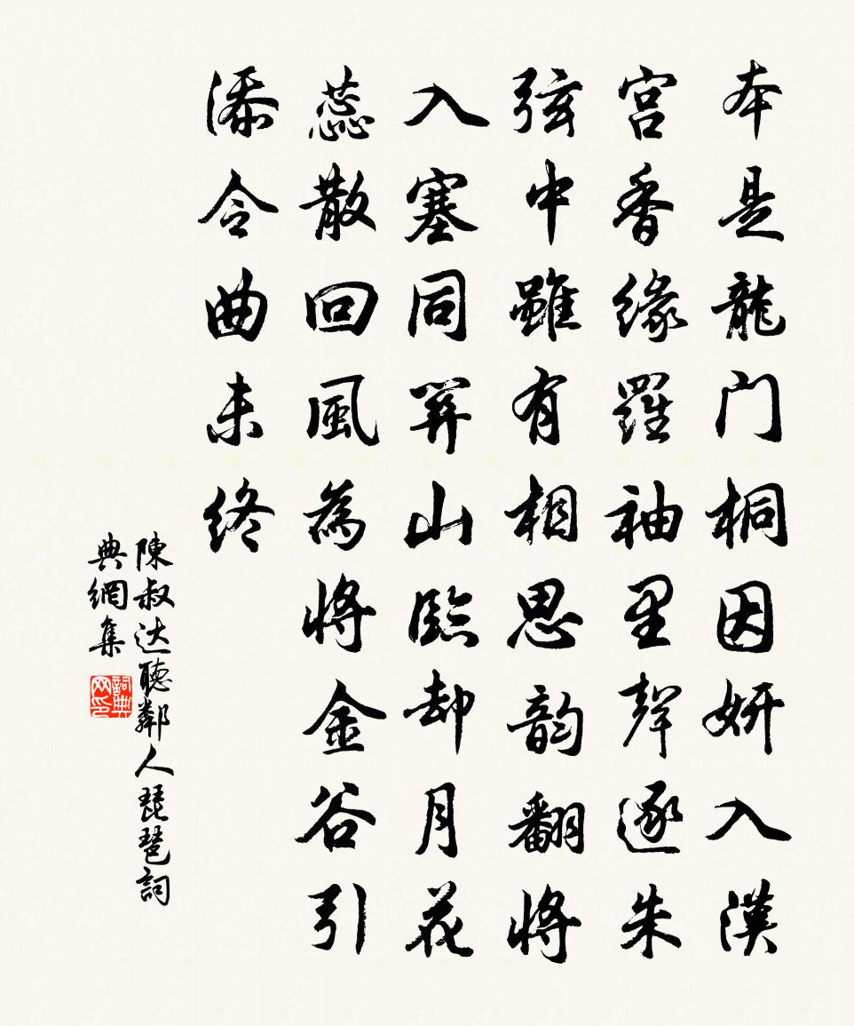 詩詞名句歷史字典書法欣賞書法字典國語詞典說文解字康熙字典古漢語字典標 題 作 者 詩 句 聽鄰人琵琶作者:陳叔達 朝代:唐代聽鄰人琵琶原文本是龍門桐,因妍入漢宮。香緣羅袖裡,聲逐朱弦中。雖有相思韻,翻將入塞同。關山臨卻月,花蕊散迴風。為將金谷引,添令曲未終。詩詞問答問:聽鄰人琵琶的作者是誰?答:陳叔達問:聽鄰人琵琶寫於哪個朝代?答:唐代問:聽鄰人琵琶是什麼體裁?答:五古陳叔達聽鄰人琵琶書法欣賞聽鄰人琵琶書法作品注釋全唐詩:卷30_5詩詞推薦賦得荊溪夜湍送蔣逸人歸義興山皇甫冉〔唐代〕驚湍流不極,夜度識雲岑。長帶溪沙淺,時因山雨深。方同七里路,更遂五湖心。揭厲朝將夕,潺湲古至今。花源雨過 其一王冕〔元代〕雨過山光潤,煙浮野色昏。清泉流近砌,黃葉擁衡門。世事憑誰論?高情只自存。忽思浣花老,又欲向東屯。避寇白沙驛作貫休〔唐代〕避亂無深淺,蒼黃古驛東。草枯牛尚齕,霞濕燒微紅。□□時時□,人愁處處同。猶逢好時否,孤坐雪濛濛。奉和左司郎中春物暗度感而成章韋莊〔唐代〕才喜新春已暮春,夕陽吟殺倚樓人。錦江風散霏霏雨,花市香飄漠漠塵。今日尚追巫峽夢,少年應遇洛川神。有時京師故僚以余退居近畿數賜存問因敘懷自感宋庠〔宋代〕多年京洛寓靈台,貪見三山縹帙開。野鶴據軒真冒祿,跛{特寺換羊}生奧苦為災。茂陵養疾愔愔骨,莊室刳心寂頌古釋道顏〔宋代〕掌中擎白日,舌上覆金錢。壁立爭千仞,毫光徹梵天。乘舟過賈收水閣,收不在,見其子,三首蘇軾〔宋代〕嫋嫋風蒲亂,猗猗水荇長。小舟浮鴨綠,大杓瀉鵝黃。得意詩酒杜,終身魚稻鄉。樂哉無一事,何處不清涼。再游南華有祖師衣缽曾豐〔宋代〕佛自無言人自訛,但留衣缽說能多。假令和履多留下,誰奈沙門頰舌何。採菊韓竹坡〔宋代〕擷我百結衣,為君采東籬。半日不盈掬,明朝還滿枝。悠然何處是,千古正如斯。浣溪沙(寒食初晴東堂對酒)毛滂〔宋代〕小雨初收蝶做團。和風輕拂燕泥乾。鞦韆院落落花寒。莫對清尊追往事,更催新火續餘歡。一春心緒倚闌乾。春帖子詞皇帝閣十二首宋祁〔宋代〕宜春苑裡報春回,寶勝繒花百種催。瑞羽關關遷木早,神魚潑潑上冰來。游翠岩六首舒坦〔宋代〕繆悠此投閒,邂逅如得請。終日對林僧,是樂非世境。千秋紙上塵,萬事空中影。既往悔可追,無能味何永。仍幸菩薩蠻晏殊〔宋代〕秋花最是黃葵好。天然嫩態迎秋早。染得道家衣。淡妝梳洗時。曉來清露滴。一一金杯側。插向綠雲鬢。便隨王母和游景叔月報三捷黃庭堅〔宋代〕漢家飛將用廟謀,復我匹夫匹婦讎。真成折箠禽胡月,不是黃榆牧馬秋。幄中已斷匈奴臂,軍前可飲月氏頭。願見鳳棲梧(題泥溪驛)盧氏〔宋代〕蜀道青天煙靄翳。帝里繁華、迢遞何時至。回望錦川揮粉淚。鳳釵斜嚲烏雲膩。鈿帶雙垂金縷細。玉珮玎璫,露滴題畢叔文所藏趙祖文畫趙蕃〔宋代〕數月湖山路,未看湖上山。塵埃苦相敗,疾病亦多關。見此微茫畫,如行慘澹間。小舟帆正飽,何日載余還。幽棲陸游〔宋代〕幽棲少人客,積病得衰殘。身納分司祿,兒須遠次官。新寒換衣典,閒日借書觀。更嘆秋來瘦,晨興覺帽寬。頌古三十一首釋如本〔宋代〕才出胞胎便逸群,周行七步獨稱尊。當時若見雲門老,不到如今累子孫。自延安回道中作晁說之〔宋代〕延州紅勝洛州花,打剝工夫阿那家。我亦勞心添病骨,悔將黃卷負年華。次單君范袖來汪西皋所譔詠秋十章以示因和之陳著〔宋代〕飛飛鴻雁舊山川,有淚沾衣感昔賢。猛拍闌乾因猛省,從來滄海變桑田。名句推薦藍橋何處覓雲英。只有多情流水、伴人行。蘇軾《南歌子·寓意》 皎皎窗中月,照我室南端。潘安《悼亡詩三首》 教婦初來,教兒嬰孩。顏之推《顏氏家訓·教子篇》 行雲卻在行舟下,空水澄鮮,俯仰留連,疑是湖中別有天。歐陽修《採桑子·畫船載酒西湖好》 鷫鸘換美酒,舞衣罷雕龍。李白《怨歌行》 佳人獨立相思苦。薄袖欺寒脩竹暮。劉鎮《玉樓春·東山探梅》 雙眼自將秋水洗,一生不受古人欺。袁枚《隨園詩話·補遺 卷三》 君知否,是山西將種,曾系詩盟。劉過《沁園春·張路分秋閱》 鳳凰台上鳳凰游,鳳去台空江自流。李白《登金陵鳳凰台》 不畏浮雲遮望眼,自緣身在最高層。王安石《登飛來峰》