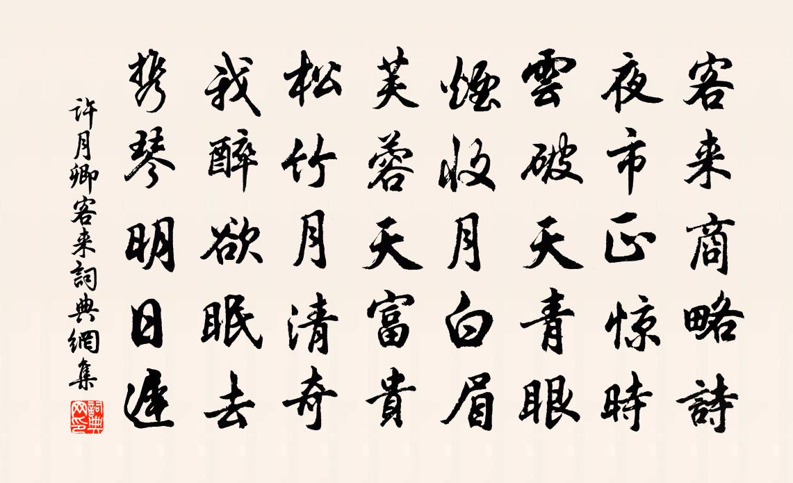 詩詞名句歷史字典書法欣賞書法字典國語詞典說文解字康熙字典古漢語字典標 題 作 者 詩 句 客來作者:許月卿 朝代:宋代客來原文客來商略詩,夜市正驚時。雲破天青眼,煙收月白眉。芙蓉天富貴,松竹月清奇。我醉欲眠去,攜琴明日遲。詩詞問答問:客來的作者是誰?答:許月卿問:客來寫於哪個朝代?答:宋代許月卿客來書法欣賞客來書法作品詩詞推薦滿江紅(壽慶元西倅·孫元寶)陳著〔宋代〕越水稽山,清明氣、鍾為人極。D44B纓早、□中學問,從頭施設。不受塵來霜壁立,常生意處春流活。與世間晚歸張耒〔宋代〕學省歸來門巷秋,伴眠書史滿床頭。低雲漠漠梧桐晚,屏上江山亦解愁。頌古七首三聖逢人即出釋慧勤〔宋代〕城南措大騎驢子,市北郎君跨馬兒。各各四蹄俱著地,三春同到月明池。月兒彎彎照九州佚名〔宋代〕月兒彎彎照九州,幾家歡樂幾家愁。幾家夫婦同羅帳,幾家飄零在外頭。水仙盛開,留子上弟小酌楊萬里〔宋代〕手種凌波香,今歲便十斛。要知誠齋中,富底水仙國。有酒偏欠花,有花恨無客。與子對花前,不醉便了得。待勸偈頌一百一十七首釋紹曇〔宋代〕八月十五中秋節,人皆競賞天邊月。心月孤圓自不知,不涉圓虧光影滅。馬師父子錯商量,拂袖便行猶未徹。諸人晚春四首張耒〔宋代〕洗雨吹風送晚春,盡收紅紫布青雲。眼前消長諳已久,清坐不妨長閉門。臨江仙王阜民〔宋代〕家法從來師靜治,趙張高掩前蹤。清才八斗繼宗風。年年正月尾,桃李滿城中。已把長江成九醞,請將太白浮公。郊廟歌辭。享太廟樂章。光大舞佚名〔唐代〕大業龍祉,徽音駿尊。潛居皇德,赫嗣天昆。展儀宗祖,重誠孝孫。春秋無極,享奏存存。送元上人歸寧魏野〔宋代〕禪性雖無著,偏親奈白頭。直應飛錫到,方是倚門休。雪裡猶思去,花前豈易留。如何迎侍得,住近免離愁。題陳氏淨香亭袁說友〔宋代〕人生樂事難,清節視險夷。遇坎而履坦,詎以得喪虧。我觀萬物間,獨此琅玕宜。頎然挺冰操,得之風雨時。秋風喜遷鶯令(呈富樞)張元乾〔宋代〕雲葉亂,月華光。羅幕卷新涼。玉醅初泛嫩鵝黃。花露滴秋香。地行仙,天上相。風度世間人樣。懸知洗盞徑開嘗晚晴趙蕃〔宋代〕溪雨無常度,陰晴日幾回。山容朝政合,水面晚仍開。乍覺巉岩盡,又看平遠來。高人欠摩詰,空為襪留材。歸故園二首姜特立〔宋代〕向來叨趁內朝班,宮漏雞聲曉夢間。今日身閒無一事,五年睡債一時還。贈黃子真張嵲〔宋代〕江漢知名士,石城黃子真。殷勤能過我,坎壈嘆斯人。此去仍為客,舟行任過春。無資振游舊,懷抱不能伸。蝶戀花晏幾道〔宋代〕卷絮風頭寒欲盡。墜粉飄紅,日日香成陣。新酒又添殘酒困。今春不減前春恨。蝶去鶯飛無處問。隔水高樓,望斷慈湖夾阻風五首蘇軾〔宋代〕捍索桅竿立嘯空,篙師酣寢浪花中。故應菅蒯知心腹,弱纜能爭萬里風。此生歸路愈茫然,無數青山水拍天。猶有臨江仙山主〔元代〕萬象分明時景現,寒光不用磨揩。大千沙界盡融該。清虛雖昧,一氣貫三才。高下岳瀆平等相,毛鱗大小同階。凡九月雪十月雷記異方回〔宋代〕九月二十五夜雪,南天稻梁未全結。十月二十五夜雷,東風桃李俱誤開。七十三翁駭何謂,雷舊慣聞雪則未。水旱看花曲戴表元〔宋代〕種花郎君愛花好,看花兒女笑花老,牆東花開鬧喧喧,馬蹄蹴醉牆西草。遊人賤草只看花,明日重來還可嗟。但見名句推薦人間更有風濤險,翻說黃河是畏途。宋琬《渡黃河》 看朱成碧思紛紛,憔悴支離為憶君。武則天《如意娘》 念故人,千里至此共明月。寇準《踏莎行·寒草煙光闊》 對酒捲簾邀明月,風露透窗紗。蘇軾《少年游·潤州作》 金剛則折,革剛則裂。劉向《說苑·敬慎》 秉忠貞之誠,守退讓之實。陳壽《三國志·魏書·荀彧攸賈詡傳》 無田似我猶欣舞,何況田間望歲心。曾幾《蘇秀道中》 荒煙涼雨助人悲,淚染衣襟不自知。王安石《送和甫至龍安微雨》 近水樓台先得月,向陽花木易為春。蘇麟《斷句》 波光水鳥驚猶宿, 露冷流螢濕不飛。湯顯祖《江宿》