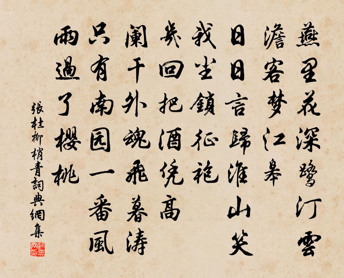 詩詞名句歷史字典書法欣賞書法字典國語詞典說文解字康熙字典古漢語字典標 題 作 者 詩 句 柳梢青作者:張杜 朝代:宋代柳梢青原文燕里花深,鷺汀雲澹,客夢江皋。日日言歸,淮山笑我,塵鎖征袍。幾回把酒憑高。闌乾外、魂飛暮濤。只有南園,一番風雨,過了櫻桃。詩詞問答問:柳梢青的作者是誰?答:張杜問:柳梢青寫於哪個朝代?答:宋代問:柳梢青是什麼體裁?答:詞張杜柳梢青書法欣賞柳梢青書法作品詩詞推薦題真繼翁司令新居二首聽雨樓劉克莊〔宋代〕共極堂中聽雨樓,誰知華扁有源流。追攀應物並和仲,友愛全真與子由。老監情尤種冢嗣,放翁語亦本前修。文忠送郡守張宗丞蕭元之〔宋代〕淮漢秋風起,邊聲不可聽。九重選良牧,內地著郎星。土沃桑麻長,城荒草樹青。民居多近水,一一是江亭。永遇樂王吉昌〔元代〕一氣氤氳,斡旋宇宙,萬端神變。造化升沉,東西顛倒,金木情相戀。紅霞千縷,金光一派,應是日歸蟾殿。異香【越調】憑闌人 香印徐再思〔元代〕煙裊蟠龍花上枝,火引冰蠶繭內絲。燒殘錦字詩,似人腸斷時。 春情 髻擁春雲松玉釵,眉淡秋山羞鏡台。海題鶴林寺綦毋潛〔唐代〕道林隱形勝,向背臨層霄。松覆山殿冷,花藏谿路遙。珊珊寶幡掛,焰焰明燈燒。遲日半空谷,春風連上潮。少憑秋屏作趙師秀〔宋代〕凡有欄乾處,秋來遍往還。就中惟此地,全得見西山。雁落遙沙小,人登廢壘閒。因憐一州景,皆在夕陽間。空謠吟曹勛〔宋代〕抗轡躡飛景,攜手仰員羅。空謠發新聲,群響隨節和。瓊音動虛籟,神宇凌高歌。偃蓋滄浪宮,整襟翔玉華。流目臨江仙張弘范〔元代〕愛煞林泉風物好,羨他歸去來兮。世緣相挽又還思。功名當壯歲,疏懶記當時。肝膽自知塵輩異,鳳池麟閣須期。木芙蓉劉兼〔唐代〕素靈失律詐風流,強把芳菲半載偷。是葉葳蕤霜照夜,此花爛熳火燒秋。謝蓮色淡爭堪種,陶菊香穠亦合羞。誰道團垸俞大夫釋紹曇〔宋代〕貫鳳團花巧施設,黑漫漫地轉希奇。做教底板堅賓著,自有傍人彩畫伊。寫懷釋行海〔宋代〕話別蘇堤第一橋,白頭孤客悵難消。山中蹈華皈來晚,只有青燈作寂寥。見雪馮時行〔宋代〕前日揮輕扇,今日御重衣。重衣御則已,仍驚朝雪飛。數峰起天末,練練生光輝。有如老大臣,正色立玉墀。風自秋懷十首末章稍自振起亦古義也陸游〔宋代〕短蓑榜輕舟,時過野僧舍。長衫掛數珠,亦入法華社。平生無揀擇,生死均早夜,餘年猶幾何,久已付造化。常嫌句周文璞〔宋代〕淒涼一似觀堂僧。賈天錫惠寶薰乞詩多以兵衛森畫戟燕寢凝清香黃庭堅〔宋代〕險心游萬仞,躁欲生五兵。隱几香一炷,露台湛空明。滿江紅洪邁〔宋代〕雨澀風慳,雙溪閟、幾曾洋溢。長長是、非霞散綺,岫雲凝碧。修禊歡游今不講,流觴故事何從覓。待它時、水到答及甫見和二首洪咨夔〔宋代〕我愛湖南客,從橫正復奇。短裳甘制芰,破斧懶燃萁。憤世惟堪飲,憂邊不到詩。最憐孤寂甚,欲為喚羅龜。茶潘牥〔宋代〕不因將軍打門驚,瓦釜何從得此聲。誰道枯腸三碗怯,能令俗骨一生清。鴻漸絕怕膏新絕,党進那知雪水烹。從此對卷劉克莊〔宋代〕妙在心通與理融,卓然有見是英雄。大儒晚作韓考異,往哲曾非墨尚同。折角爭希郭有道,鬀眉求似狄梁公。可憐依韻攀和通判員外題金觀之作楊克讓〔宋代〕沖虛脫屣世綿綿,勝地人來尚凜然。不見彩雲迎皓鶴,空留怪石漱清泉。侵階蔓草 * 逕,偃蓋寒松雜暮煙。靜化名句推薦先到為君,後到為臣。佚名《增廣賢文·上集》 洛陽城裡見秋風,欲作家書意萬重。張籍《秋思》 秋氣堪悲未必然,輕寒正是可人天。楊萬里《秋涼晚步》 事無終始,無務多業。墨子《墨子·02章 修身》 蔞蒿滿地蘆芽短,正是河豚欲上時。蘇軾《惠崇春江晚景 / 惠崇春江曉景》 寒泉貯、紺壺漸暖,年事對、青燈驚換了。吳文英《花犯·謝黃復庵除夜寄古梅枝》 渺萬裡層雲,千山暮雪,隻影向誰去?元好問《摸魚兒·雁丘詞 / 邁陂塘》 相恨不如潮有信,相思始覺海非深。白居易《浪淘沙·借問江潮與海水》 只有精忠能報國,更無樂土可為家。 * 《元旦口占用柳亞子懷人韻》 清夜何湛湛,孤燭映蘭幕。江淹《銅爵妓》