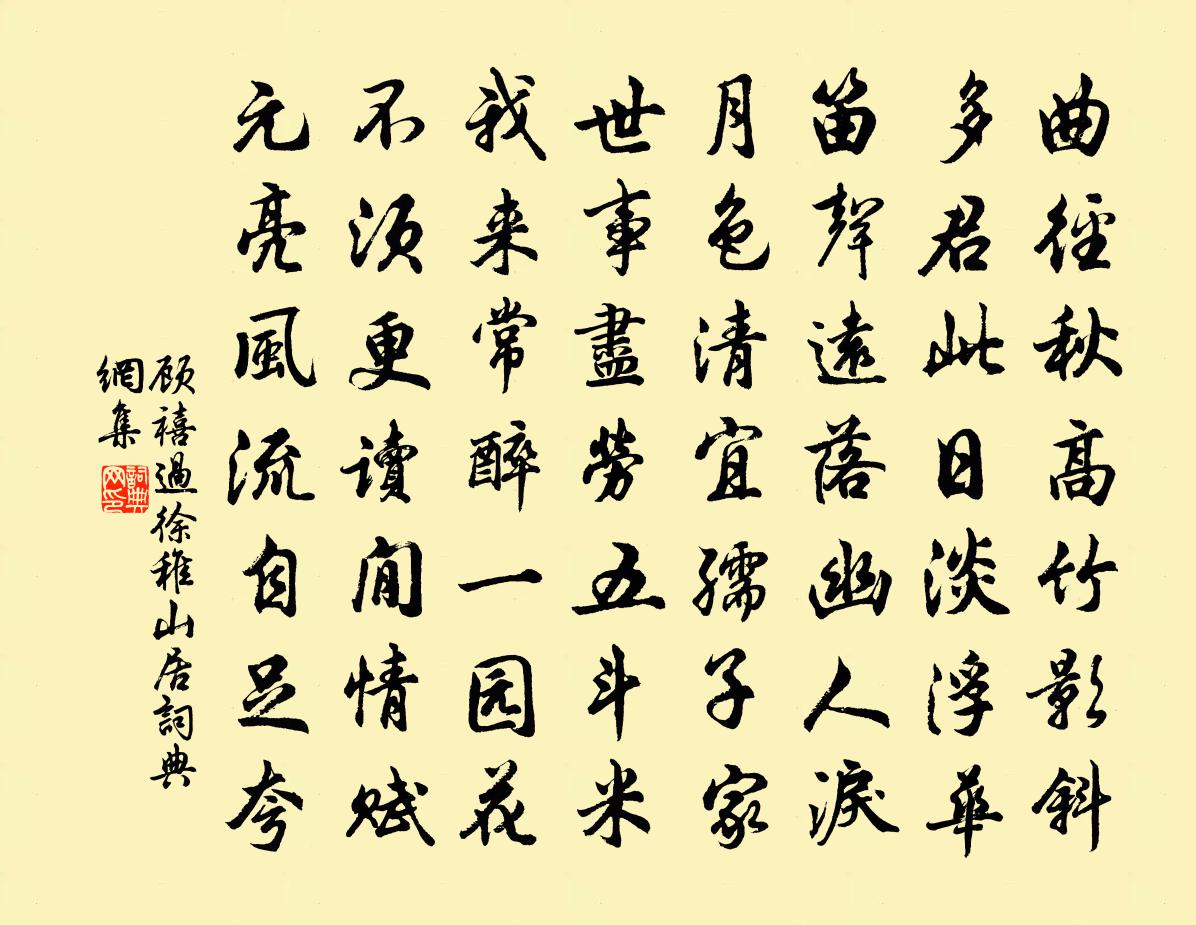 詩詞名句歷史字典書法欣賞書法字典國語詞典說文解字康熙字典古漢語字典標 題 作 者 詩 句 過徐稚山居作者:顧禧 朝代:宋代過徐稚山居原文曲徑秋高竹影斜,多君此日淡浮華。笛聲遠落幽人淚,月色清宜孺子家。世事盡勞五斗米,我來常醉一園花。不須更讀閒情賦,元亮風流自足夸。詩詞問答問:過徐稚山居的作者是誰?答:顧禧問:過徐稚山居寫於哪個朝代?答:宋代顧禧過徐稚山居書法欣賞過徐稚山居書法作品詩詞推薦許洞歸吳中錢惟演〔宋代〕草薰風暖接長亭,一曲驪歌倒醁醽。懷古更投玄石賦,艤舟閒采紫莖萍。醉拋隋岸楊花白,吟過淮山桂樹青。可使三山杜門作歌陸游〔宋代〕高宗下詔傳神器,嗣皇御殿猶揮涕。當時獲綴鵷鷺行,百寮拜舞皆歔欷。小臣疏賤亦何取,即日趨召登丹陛。鳴呼當句有對李商隱〔唐代〕密邇平陽接上蘭,秦樓鴛瓦漢宮盤。池光不定花光亂,日氣初涵露氣乾。但覺游蜂饒舞蝶,豈知孤鳳憶離鸞。三星題清遠峽和光洞安昌期〔宋代〕蕙帳將辭去,猨猱不忍啼。琴書自為樂,朋友孰相攜。丹灶非無藥,青雲別有梯。峽山余暫隱,人莫擬夷齊。次前韻謝王主簿二首項安世〔宋代〕南州高士到湘州,山鬼湘娥暮暮愁。行世頭顱渾欲老,賀天胸次未經酬。搜殘風月三千界,吟破江湖九十洲。誰報汪狀元燕坐軒釋宗杲〔宋代〕不於三界現身意,棹舉何如憒憒時。寄語軒中燕坐者,好看新月下前溪。經古觀有感李中〔唐代〕古觀寥寥枕碧溪,偶思前事立殘暉。漆園化蝶名空在,柱史猶龍去不歸。丹井泉枯苔鎖合,醮壇松折鶴來稀。回頭送圭子赴淮南總所排岸任陳宓〔宋代〕久叨簪紱裔,初筮帝王州。祖德期無忝,君恩要力酬。存心惟敬謹,律已必清修。千里書頻寄,重親鬢已秋。贈韓翃牟融〔唐代〕京國久知名,江河近識荊。不辭今日醉,便有故人情。細雨孤鴻遠,西風一棹輕。暫時分手去,應不負詩盟。浣溪沙晏幾道〔宋代〕團扇初隨碧簟收。畫檐歸燕尚遲留。靨朱眉翠喜清秋。風意未應迷狹路,燈痕猶自記高樓。露花菸葉與人愁。又布袋贊釋了惠〔宋代〕布袋沒半邊,烏藤欠一橛。手指空中底,要且不是佛。是什麽,咄咄咄。紹興朝會十三首佚名〔宋代〕鉤陳肅列,金奏棄庭。顒印南面,如日之升。垂衣拱手,治無能名。順屐獻幾,大安大榮。絕句黃載〔宋代〕社寒比臘更清嚴,花蕊蕭疏半欲緘。過手重裘猶得力,莫將晴煗信春衫。夏日雜詩陳文述〔清代〕水窗低傍畫欄開,枕簟蕭疏玉漏催。一夜雨聲涼到夢,萬荷葉上送秋來。題王侍御池亭白居易〔唐代〕朱門深鎖春池滿,岸落薔薇水浸莎。畢竟林塘誰是主?主人來少客來多。然上人還松台宋慶之〔宋代〕白頭寧俯仰,自覺住山非。舊業雙松在,初秋一錫歸。從人借茶具,就日補寒衣。團黨委見新詩久,朝來叩我扉。賈天錫惠寶薰乞詩多以兵衛森畫戟燕寢凝清香黃庭堅〔宋代〕衣篝麗紈綺,有待乃芬芳。當念真富貴,自薰知見香。再用前韻二首吳潛〔宋代〕翦水工夫入細難,篩塵屑末粲豪端。司寒便合修年譜,凌空何妨踐世官。惠可立時師受記,焦先臥處眾爭看。只緣鷓鴣天楊冠卿〔宋代〕歲月如馳烏兔飛。情懷著酒強支持。經年不見宮妝面,穠碧誰斟翡翠卮。江路晚,夕陽低。奚奴空負錦囊歸。欲憑閒居述事邵雍〔宋代〕一點天真都不耗,千鍾人祿是難來。太平自慶無他事,有酒時時三五杯。名句推薦良醫之門多病人。荀子《荀子·法行》 花枝出建章,鳳管發昭陽。皇甫冉《婕妤怨》 兼聽之明,而無矜奮之容;有兼覆之厚,而無伐德之色。荀子《荀子·正名》 試問閒愁都幾許?賀鑄《青玉案·凌波不過橫塘路》 千古興亡多少事?悠悠。辛棄疾《南鄉子·登京口北固亭有懷》 我報路長嗟日暮,學詩謾有驚人句。李清照《漁家傲·天接雲濤連曉霧》 刑天舞乾戚,猛志固常在。陶淵明《讀山海經·其十》 末路驚風雨,窮邊飽雪霜文天祥《除夜》 攀荷弄其珠,蕩漾不成圓。李白《折荷有贈》 獨自立瑤階,透寒金縷鞋。納蘭性德《菩薩蠻·隔花才歇廉纖雨》