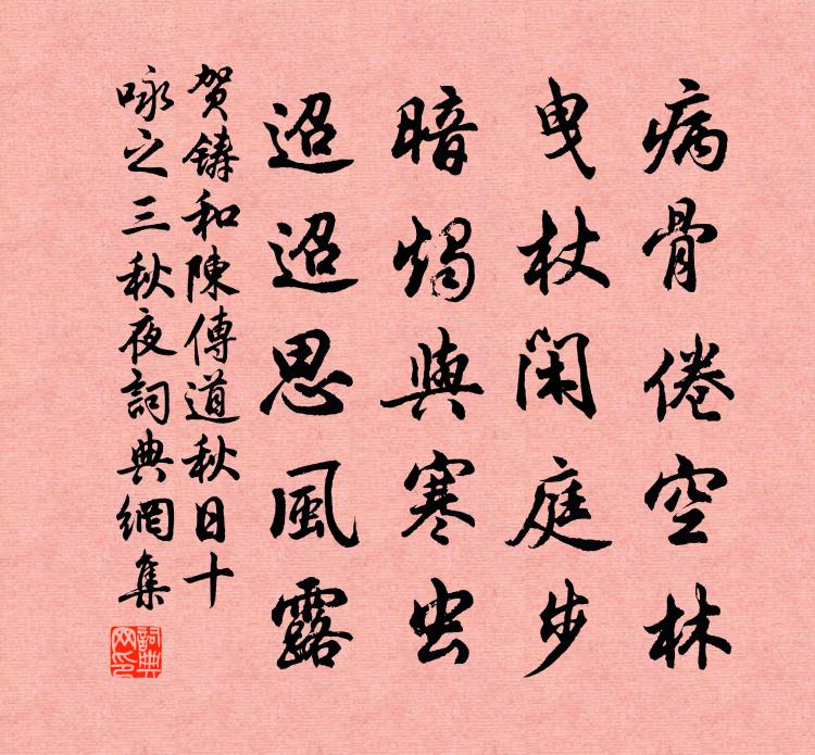 詩詞名句歷史字典書法欣賞書法字典國語詞典說文解字康熙字典古漢語字典標 題 作 者 詩 句 和陳傳道秋日十詠之三秋夜作者:賀鑄 朝代:宋代和陳傳道秋日十詠之三秋夜原文病骨倦空林,曳杖閒庭步。暗燭與寒蟲,迢迢思風露。詩詞問答問:和陳傳道秋日十詠之三秋夜的作者是誰?答:賀鑄問:和陳傳道秋日十詠之三秋夜寫於哪個朝代?答:宋代問:賀鑄的名句有哪些?答:賀鑄名句大全賀鑄和陳傳道秋日十詠之三秋夜書法欣賞和陳傳道秋日十詠之三秋夜書法作品詩詞推薦喜遷鶯佚名〔宋代〕萬緣多暇。便杖屨閒遊,田園鄰舍。雨笠風巾,鶉衣鶴骨,韜晦翠微峰下。眼底世情群擾,方外天機獨霸。德風化共工怒觸不周山佚名〔〕昔者,共工與顓頊爭為帝,怒而觸不周之山,天柱折,地維絕。天傾西北,故日月星辰移焉;地不滿東南,故水潦登洪慶觀河亭高昌〔宋代〕霜旄行郡試尋幽,一曲圍垣繞縣周。山色迎人來黛嵋,河聲驚夢撼黃流。禹門水迥鄉關月,濟廟煙連草樹秋。遙指奉和王元二相避暑懷杜太尉李端〔唐代〕艱難嘗共理,海晏更相悲。況復登堂處,分明避暑時。綠槐千穗綻,丹藥一番遲。蓬蓽今何幸,先朝大雅詩。宋理宗南樓風月橫披(二首選—)劉因〔元代〕物理興衰不可常,每從氣韻見文章。誰知萬古中天月,只辦南樓一夜涼!句司馬光〔宋代〕不肯那錢買珠翠,任教堆插階前菊潘丞孩子皎然〔唐代〕愛子性情奇,初生玉樹枝。人曾天上見,名向月中知。我識嬰兒意,何須待佩觿。鴻溝張祜〔唐代〕龍蛇百戰爭天下,各制雄心指此溝。寧似九州分國土,地圖初割海中流。和天休龍圖經句署懷舊憶道卿舍人並見寄宋祁〔宋代〕帝梧春早二鸞飛,羈羽孤翻得樹遲。今日並巢阿閣畔,依然同識舊棲枝。同徐員外除太子舍人寓直之作郭震〔唐代〕太子擅元良,宮臣命偉長。除榮辭會府,直宿總書坊。露濕幽岩桂,風吹便坐桑。閣連雲一色,池帶月重光。葉死雜詠黃庚〔宋代〕新綠園林微雨後,落紅庭院夕陽時。一聲杜宇催春去,貪睡棠妃未必知。沁園春(謝劉小山頻寄所作)程珌〔宋代〕君有新詞,何妨為我,時遣奚奴。看此山大小,風流晉宋,眼中餘子,苦自侏儒。九曲清溪,千枝楊柳,還記新條種菊張鎡〔宋代〕今年植菊良寡謀,叢萎滿望如田疇。黃深白淺欠旌別,未表勁淨專高秋。初移風雨連朝惡,才到暄晴驟開卻。鋪氈偈頌二百零五首釋正覺〔宋代〕一陽生,萬物潛萌。隱隱有像,寥寥未形。蚌腸含妙蘊,犀角暈通星。密密用,細細行,本智虛融與理冥。露地白減字木蘭花張掄〔宋代〕冥冥窈窕。□□□□□□□。□□□□。□□□□□□□。□□□□。□□□□□□□。□□□□。□□□□□□再次前韻三首陳造〔宋代〕茗甌對客乳花濃,靜聽揮犀發異同。度臘迎春如此過,不知人世有王公。點絳唇仇遠〔宋代〕黃帽B639鞋,出門一步為行客。幾時寒食。岸岸梨花白。馬首山多,雨外青無色。誰禁得。殘鵑孤驛。撲地春木蘭花/玉樓春張先〔宋代〕西湖楊柳風流絕。滿縷青春看贈別。牆頭簌簌暗飛花,山外陰陰初落月。秦姬穠麗雲梳發。持酒唱歌留晚發。驪駒再繼土修三絕王洋〔宋代〕一身何適非真盜,淺識常虞世俗識。我俗似君專盜酒,常謀卜夜不謀歸。霜夜陸游〔宋代〕黃甘磊落圍三寸,赤蟹輪囷可一斤。更喚東陽麴道士,與君霜夜策奇勳。名句推薦竹徑通幽處,禪房花木深。常建《題破山寺後禪院》 白髮漁樵江渚上,慣看秋月春風。楊慎《臨江仙·滾滾長江東逝水》 蕭蕭落木不勝秋,莫回首、斜陽下。納蘭性德《一絡索·過盡遙山如畫》 木落雁南度,北風江上寒。孟浩然《早寒江上有懷 / 早寒有懷 / 江上思歸》 靄芳陰未解,乍天氣、過元宵。周端臣《木蘭花慢·送人之官九華》 離宮絕曠,身體摧藏,志念沒沉,不得頡頏。王昭君《怨詞》 見出以知入,觀往以知來列子及其弟子《列子·說符》 片雲天共遠,永夜月同孤。杜甫《江漢》 門外子規啼未休,山村落日夢悠悠。陳與義《送人歸京師》 力田已告成,計日宜收藏。黃燮清《秋日田家雜詠》