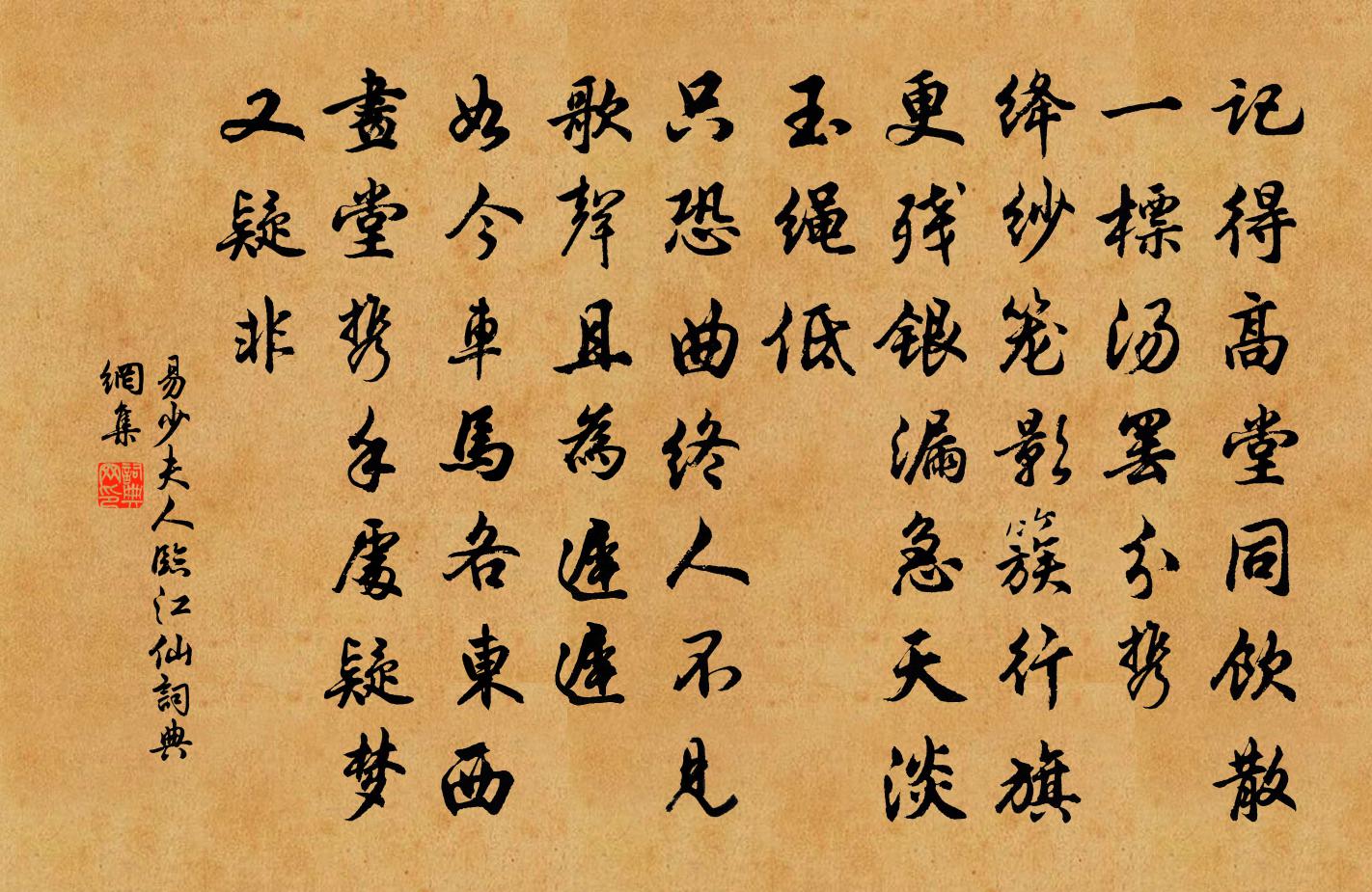 詩詞名句歷史字典書法欣賞書法字典國語詞典說文解字康熙字典古漢語字典標 題 作 者 詩 句 臨江仙作者:易少夫人 朝代:宋代臨江仙原文記得高堂同飲散,一標湯罷分攜。絳紗籠影簇行旗。更殘銀漏急,天淡玉繩低。只恐曲終人不見,歌聲且為遲遲。如今車馬各東西。畫堂攜手處,疑夢又疑非。詩詞問答問:臨江仙的作者是誰?答:易少夫人問:臨江仙寫於哪個朝代?答:宋代問:臨江仙是什麼體裁?答:詞易少夫人臨江仙書法欣賞臨江仙書法作品詩詞推薦八月十一日晨興張耒〔宋代〕老人秋少睡,禪誦每晨興。鄰碓舂殘月,床蛩語暗燈。高林鳥聲起,幽草露華凝。筇杖兼禪榻,生涯一野僧。閒居寄包何錢起〔唐代〕去名即棲遁,何必歸滄浪。種藥幽不淺,杜門喧自忘。林眠多曉夢,鴉散驚初陽。片雪幽雲至,迴風鄰果香。佳期雨中過陸家園張至龍〔宋代〕斜搭鞦韆窗半扃,行人屐送隔牆聲。群花相倚啼妝面,苦不催晴怨懶鶯。次韻王亞夫景存縣帝春二首林表民〔宋代〕欲勸東君盡一杯,臨岐無語獨遲回。晚風自有留連意,遞得鶯聲過柳來。答陳宗道見寄仇遠〔宋代〕蹇予山澤臞,飄飄一鷗似。天風忽假便,飲此金瀨水。朝隨章句儒,暮逐副墨子。肯嘆飯不足,可戀惟酒美。賦茅小重山(數椽甫葺,知府載酒寵臨,輒次日近環湖所賦韻為一杯壽)李壁〔宋代〕燕雀風輕二月天。一枝何處是家園。有花不惜是誰憐。生嫌怕,不為老人妍。眉黛擁連娟。高情時載酒、雁湖邊。客有傳朝議欲以子瞻使高麗大臣有惜其去者白秦觀〔宋代〕學士風流異域傳,幾航雲海使南天,不因名動五千里,豈見文高二百年。貢外別題求妙札,錦中翻樣織新篇。淹留偈傾一百三十三首釋法薰〔宋代〕萬古長空,一朝風月。有祖以來,話作兩橛。石田好是明明說,八十翁翁嚼生鐵。懷寄彭城朋好十首之三劉四賀鑄〔宋代〕子仲安貧者,毗陵久罷歸。秋風一相憶,賴有燕西飛。秋浦樓趙葵〔宋代〕麗譙岧曉壯城關,萬里關河歸日睫。雨餘漁釣玉奮開,煙生芙蓉翠屏列。吳頭楚尾二十秋,滿耳鉉歌聲未絕。不才胡姬年十五擬劉越石張憲〔元代〕胡姬年十五,芍藥正含葩。何處相逢好,并州賣酒家。面開春月滿,眉抹遠山斜。一笑既相許,何須羅扇遮。東林寺貫休上人篆隸題詩黃滔〔唐代〕師名自越徹秦中,秦越難尋師所從。墨跡兩般詩一首,香爐峰下似相逢。司天台-引古以儆今也白居易〔唐代〕司天台,仰觀俯察天人際。羲和死來職事廢,官不求賢空取藝。昔聞西漢元成間,上陵下替謫見天。北辰微闇少光漫成呈文潛五首晁補之〔宋代〕不是生情薄桃李,廣陵一株名最高。俱飛蛺蝶莫猜忌,端為蜻蜓避伯勞。紹興祀先農攝事七首佚名〔宋代〕有周膺歷,實起居稷。相時豈功,率同稼檣。振古稱祀,先農亞食。阜我昌我,時萬時億。題城南杜邠公林亭(時公鎮淮南自西蜀移節)溫庭筠〔唐代〕卓氏壚前金線柳,隋家堤畔錦帆風。貪為兩地分霖雨,不見池蓮照水紅。句宋肇〔宋代〕知君也厭雕肝腎,分我江南數斛愁。白鶴峰新居欲成夜過西鄰翟秀才二首蘇軾〔宋代〕林行婆家初閉戶,翟夫子舍尚留關。連娟缺月黃昏後,縹緲新居紫翠間。系悶豈無羅帶水,割愁還有劍鋩山。中原句陳摶〔宋代〕萬頃白雲獨自有,一枝仙桂阿誰無。宿陟岵寺雲律師院楊衡〔唐代〕像宇郁參差,寶林疏復密。中有彌天子,燃燈坐虛室。心證紅蓮喻,跡羈青眼律。玉爐揚翠煙,金經開縹帙。肆陳名句推薦梅雪爭春未肯降,騷人閣筆費評章。盧鉞《雪梅·其一》 看來豈是尋常色,濃淡由他冰雪中。曹雪芹《詠紅梅花得“紅”字》 只在此山中,雲深不知處。賈島《尋隱者不遇 / 孫革訪羊尊師詩》 人無遠慮,必有近憂。佚名《增廣賢文·上集》 秋風萬里動,日暮黃雲高。岑參《鞏北秋興寄崔明允》 采采黃金花,何由滿衣袖。杜甫《九日寄岑參》 千里馬常有,而伯樂不常有。韓愈《馬說》 白髮書生神州淚,盡淒涼、不向牛山滴劉克莊《賀新郎·九日》 東家頭白雙女兒,為解挑紋嫁不得。元稹《織婦詞》 所向泥活活,思君令人瘦。杜甫《九日寄岑參》