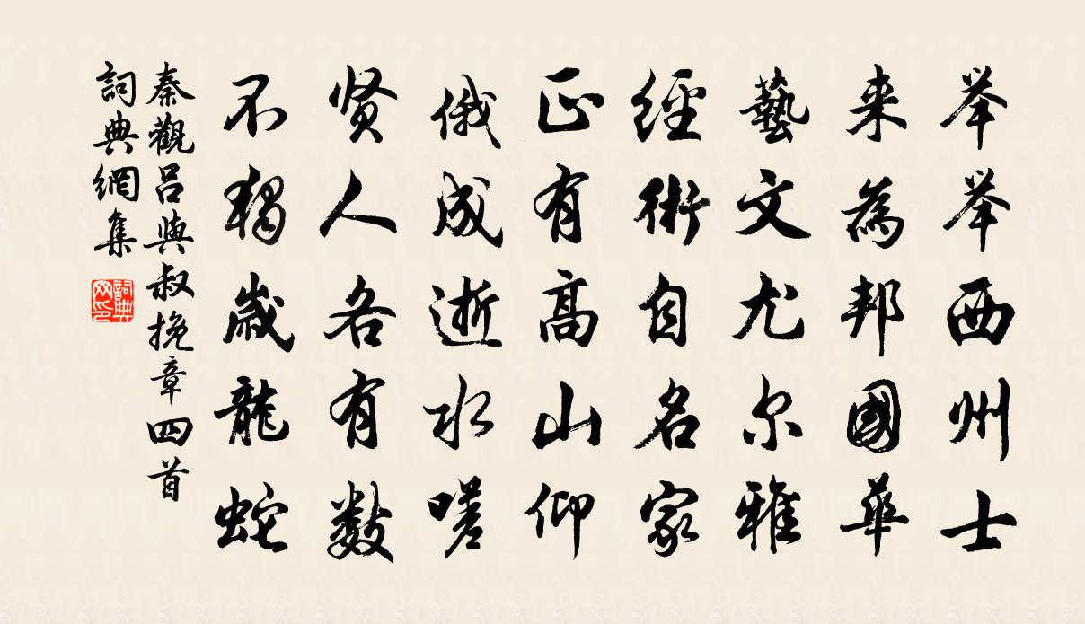 詩詞名句歷史字典書法欣賞書法字典國語詞典說文解字康熙字典古漢語字典標 題 作 者 詩 句 呂與叔挽章四首作者:秦觀 朝代:宋代呂與叔挽章四首原文舉舉西州士,來為邦國華。藝文尤爾雅,經術自名家。正有高山仰,俄成逝水嗟。賢人各有數,不獨歲龍蛇。詩詞問答問:呂與叔挽章四首的作者是誰?答:秦觀問:呂與叔挽章四首寫於哪個朝代?答:宋代問:秦觀的名句有哪些?答:秦觀名句大全秦觀呂與叔挽章四首書法欣賞呂與叔挽章四首書法作品詩詞推薦寒棲館方士繇〔宋代〕蒼崖凌絳霄,橫席坐高迥。遙夜聞 * ,山空月華冷。摸魚兒(和巽吾留別韻)劉辰翁〔宋代〕懶能看、海桑世界,風花過眼如傳。月明昨夜庭流水,天色朝來都變。塵石爛。銖衣壞,和衣減盡誰能怨。秦亡楚貧居春怨雍陶〔唐代〕貧居盡日冷風煙,獨向檐床看雨眠。寂寞春風花落盡,滿庭榆莢似秋天。贈恪上人吳芾〔宋代〕上人來訪我,袖裡出佳篇。窮理通三命,知音妙七弦。不妨時對榻,聊與共談禪。一飯雖粗糲,閒中且結緣。感夢因接夢中所得詩句金君卿〔宋代〕我後同堯舜,君臣詠載歌。天顏春日煦,庭列眾星羅。雅奏鈞音合,穠香瑞氣和。逢辰膺帝睠,既醉任顏酡。薦翣滿江紅佚名〔宋代〕雪共梅花,念動是、經年離拆。重會面、玉肌真態,一般標格。誰道無情應也妒,暗香埋沒教誰識。卻隨風、偷入游清都觀尋沈道士得芳字趙中虛〔唐代〕青溪阻千仞,姑射藐汾陽。未若游茲境,探玄眾妙場。鶴來疑羽客,雲泛似霓裳。寓目雖靈宇,游神乃帝鄉。道存洞庭題詠十一首小湖寺王阮〔宋代〕去年禱雨旃檀林,慈雲賜我三日霖。今年包山小湖寺,更得因緣禮大士。小湖氣象似寶陁,怪石列岸騰嵯峨。近山步蟾宮佚名〔宋代〕垂弧門左當今日。恰過了、元宵六夕。喜妙齡秀髮步蟾宮,信富貴、榮華莫敵。紀年甲子才三七。即翰苑、從容西送蕭山錢著作王安石〔宋代〕才高諸彥故無嫌,兄弟同時舉孝廉。東觀外除方墨綬,西州相見已蒼髯。靈胥引水清穿市,神禹分山翠入簾。好去南陽送客李白〔唐代〕斗酒勿為薄,寸心貴不忘。坐惜故人去,偏令遊子傷。離顏怨芳草,春思結垂楊。揮手再三別,臨岐空斷腸。頌古三十二首釋明辯〔宋代〕盤走珠兮珠走盤,當機脫略好生觀。世人知貴不知價,信手拈來也不難。八窗叔用前韻相寄時留村舍和以謝之李曾伯〔宋代〕洛川已矣不復見,斯地巋然猶獨存。九仞成功忍虧簣,百年種德在深根。依稀舊燕空梁語,俯仰飛鴻踏雪痕。多少六言詩孔融〔兩漢〕從洛到許巍巍。曹公憂國無私。減去廚膳甘肥。羣僚率從祁祁。雖得俸祿常飢。念我苦寒心悲。詠王主敬張敬忠〔唐代〕有意嫌兵部,專心望考功。誰知腳蹭蹬,幾落省牆東。哭藝堂湯先生劉黻〔宋代〕天地之性人為貴,四骸仁義一隻具。先生領之皇降初,繇稚及耆全故步。深居獨觀昭曠原,學不師傳能自悟。真貧敝笱佚名〔先秦〕敝笱在梁,其魚魴鰥。齊子歸止,其從如雲。敝笱在梁,其魚魴鱮。齊子歸止,其從如雨。敝笱在梁,其魚唯唯。湖州歌九十八首 其七十一汪元量〔宋代〕第二筵開入九重,君王把酒勸三宮。駝峰割罷行酥酪,又進雕盤嫩韭蔥。晚寒(晚一作暝)白居易〔唐代〕急景流如箭,淒風利似刀。暝催雞翅斂,寒束樹枝高。縮水濃和酒,加綿厚絮袍。可憐冬計畢,暖臥醉陶陶。春日山行二首洪咨夔〔宋代〕雨點眼光牛背上,一窩春色落花邊。世緣不到山深處,只恐深山起世緣。名句推薦亡國至亡而後知亡,至死而後知死荀子《荀子·強國》 西窗下,風搖翠竹,疑是故人來。秦觀《滿庭芳·碧水驚秋》 十年愁眼淚巴巴。今日思家。明日思家。汪元量《一剪梅·懷舊》 孤舟蓑笠翁,獨釣寒江雪。柳宗元《江雪》 欲持一瓢酒,遠慰風雨夕。韋應物《寄全椒山中道士》 大者不能,小者不為,是棄國捐身之道也。荀子《荀子·大略》 秋到邊城角聲哀,烽火照高台。陸游《秋波媚·七月十六日晚登高興亭望長安南山》 雙飛燕子幾時回?夾岸桃花蘸水開。徐俯《春遊湖》 天與秋光,轉轉情傷,探金英知近重陽。李清照《行香子·天與秋光》 功蓋三分國,名成八陣圖。杜甫《八陣圖》