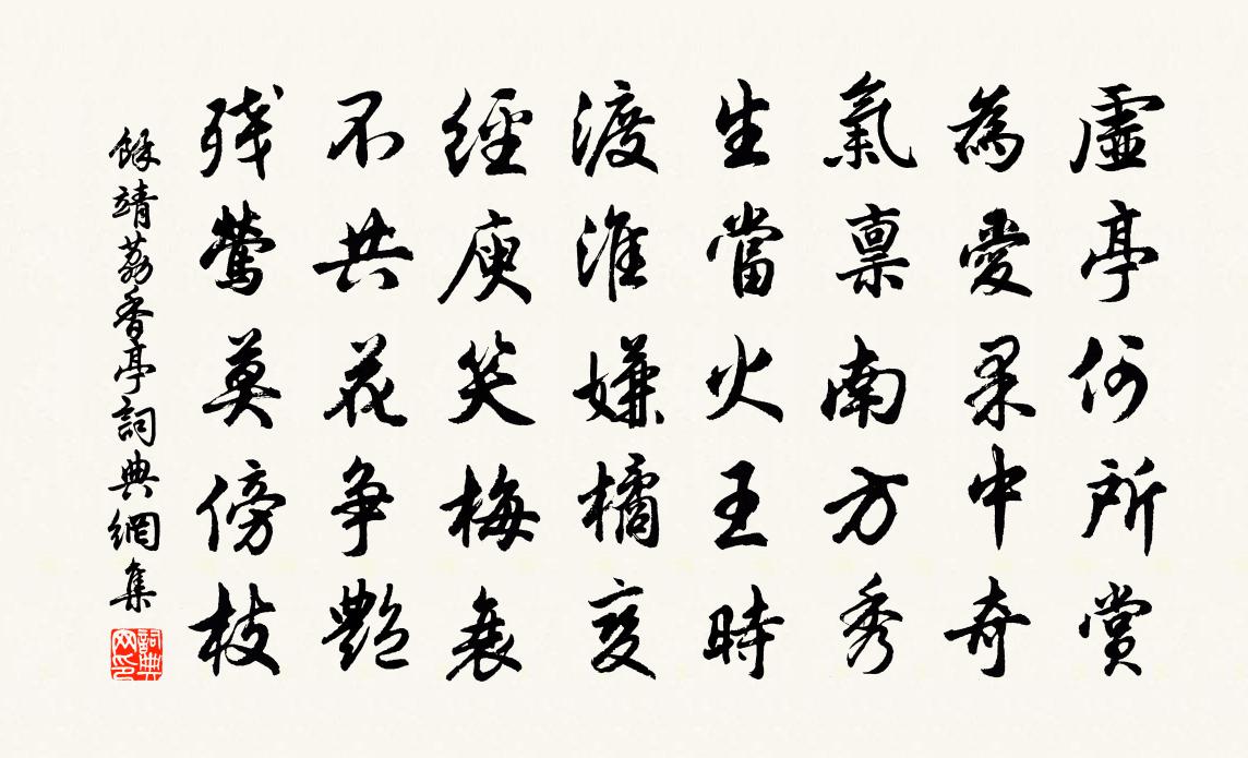 詩詞名句歷史字典書法欣賞書法字典國語詞典說文解字康熙字典古漢語字典標 題 作 者 詩 句 荔香亭作者:余靖 朝代:宋代荔香亭原文虛亭何所賞,為愛果中奇。氣稟南方秀,生當火王時。渡淮嫌橘變,經庾笑梅衰。不共花爭艷,殘鶯莫傍枝。詩詞問答問:荔香亭的作者是誰?答:余靖問:荔香亭寫於哪個朝代?答:宋代余靖荔香亭書法欣賞荔香亭書法作品詩詞推薦柳梢青葛郯〔宋代〕空中雨閣。一段輕陰,翠鋪林薄。橘內仙翁,棋邊公子,共成清樂。主人有井留車,看席上、雲輕柳弱。斗轉檐頭瑞香花新開五首楊萬里〔宋代〕短短熏籠小,團團錦帊圍。浮陽烘酒思,沉水著人衣。抹利通家遠,楠花具體微。春愁渾瘦盡,別有瘦中肥。句陳瓘〔宋代〕拶破黃龍第四關,世人猶問生緣法。又和再寄二首范祖禹〔宋代〕花落春台靜,鶯啼曉枕驚。竹間流水過,窗外白雲生。襟抱懷冰爽,詩篇叩玉清。荒唐漆園吏,環堵但披荊。鄧郁鄧林〔宋代〕雲母餱糧五嶽樓,繡袿少嫗導仙遊。不應輕信雙青鳥,便遣東都事業休。用坡仙梅花十韻遇梅劉黻〔宋代〕冷淡生涯合晚開,老天故遣雪頻催。相逢喚醒平生夢,不悞山翁特地來。擬古四色詩范雲〔南北朝〕丹如桓公廟。青如夕郎門。黑如南岩{石肅}。白如東山猨。寄題蠲流亭唐士恥〔宋代〕烏傷仇覽仙,一弓扁蠲流。清流從誰蠲,濁流石之幽。石之幽定可,齒齒翻成憂。君看得失珠,象罔無全牛。同伯氏還鄉胡宏〔宋代〕江村沙暖蔞蒿長,味比枸杞新甘香。茁茁荻芽生近渚,紫花台萊初未嘗。牡羊烏牸俱在牧,茅舍竹籬是故鄉。人生生查子陸游〔宋代〕梁空燕委巢,院靜鳩催雨。香潤上朝衣,客少閒談麈。鬢邊千縷絲,不是吳蠶吐。孤夢泛瀟湘,月落聞柔櫓。禪人並化主寫真求贊釋正覺〔宋代〕垂老之姿,鬚髮如絲。淵默之味,耳口無疵。秋高河影闊,露冷月行遲。答呼若穀神之應,對事得珠色之隨。步虛四章白玉蟾〔宋代〕昔在神霄府,飛雲步玉天。玉天三十六,六梵聚飛仙。太帝升煙殿,東皇駕鳳軿。真靈來億萬,聽演太靈篇。隆州道中晁公溯〔宋代〕冉冉晨霧重,暉暉冬日微。草黃迷犢臥,水白見鷗飛。在野樵牧少,閉關商旅稀。妻孥屬長至,遙想望吾歸。乞數珠贈南禪湜老蘇軾〔宋代〕從君覓數珠,老境仗消遣。未能轉千佛,且從千佛轉。儒生推變化,乾策數大衍。道士守玄牝,龍虎看舒捲。我老菩薩蠻向子諲〔宋代〕天仙醉把真珠擲。荷翻寫入玻璃碧。雨過酒尊涼。紅蕖苒苒香。飛來雙白鷺。屢作僛僛舞。山鳥起清歌。晚來情更諸人頗有和余百梅詩者各賦一首劉克莊〔宋代〕貧兒籬下看花窠,曾見千株玉雪麽。畫得詩禪三昧少,詩如無住一聯多。過時結實心猶苦,從古調羹味在和。我坐上下華池陳岩〔宋代〕聽鍾吃飯東西寺,就水烹茶上下池。二百年來陳跡在,摩挲苔蘚日西時。畫貓圖王冕〔元代〕吾家老烏圓,斑斑異今古。抱負頗自奇,不尚威與武。坐臥青氈旁,優遊度寒暑。豈無尺寸功?衛我書籍圃。去年減字浣溪沙(十五之八)賀鑄〔宋代〕鸚鵡無言理翠襟。杏花零落晝陰陰。畫橋流水半篙深。芳徑與誰尋鬥草,繡床終日罷拈針。小箋香管寫春心。南堂對竹懷江十鄰幾韓維〔宋代〕端居無所聊,稍復治文字。南堂冬日明,窗戶暖可喜。圖書羅滿前,意覽不由次。聊收靜者趣,以亂憂人思。亭亭名句推薦害人之心不可有,防人之心不可無!佚名《增廣賢文·下集》 山光悅鳥性,潭影空人心。常建《題破山寺後禪院》 便覺眼前生意滿,東風吹水綠參差。張栻《立春偶成》 入世冷挑紅雪去,離塵香割紫雲來。曹雪芹《訪妙玉乞紅梅》 欲窮千里目,更上一層樓。王之渙《登鸛雀樓》 自是人生長恨水長東。李煜《相見歡·林花謝了春紅》 君子之於子,愛之而勿面,使之而勿視,道之以道而勿強。荀子《荀子·大略》 功名萬里外,心事一杯中。高適《送李侍御赴安西》 能脫身牢籠外,便是大英雄。王永彬《圍爐夜話·第二八則》 問弄雪飄枝,無雙亭上,何日重遊。鄭覺齊《揚州慢·瓊花》