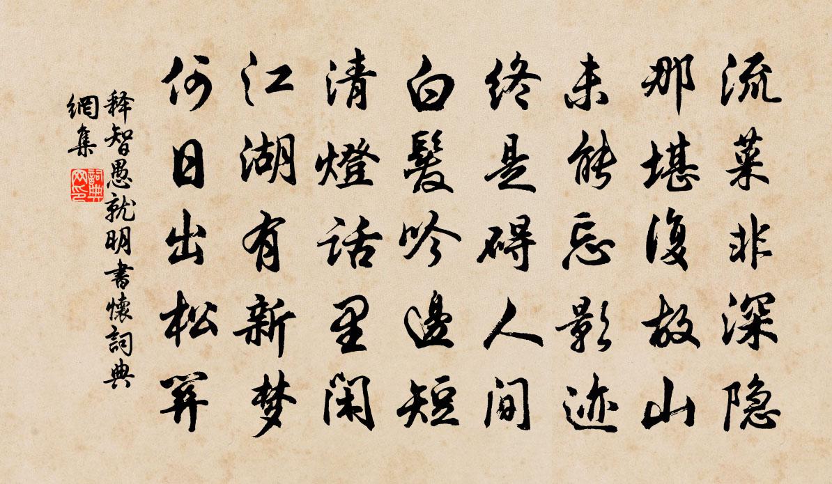 詩詞名句歷史字典書法欣賞書法字典國語詞典說文解字康熙字典古漢語字典標 題 作 者 詩 句 就明書懷作者:釋智愚 朝代:宋代就明書懷原文流菜非深隱,那堪復故山。未能忘影跡,終是礙人間。白髮吟邊短,清燈話里閒。江湖有新夢,何日出松關。詩詞問答問:就明書懷的作者是誰?答:釋智愚問:就明書懷寫於哪個朝代?答:宋代釋智愚就明書懷書法欣賞就明書懷書法作品詩詞推薦偈頌八十七首釋慧開〔宋代〕歸來一月余日,內外人事已畢。恣意飽飯噇眠,說甚金圈栗棘。分明告報諸禪,直下便須委悉。更若擬議躊躇,照經少林精舍,寄都邑親友韋應物〔唐代〕息駕依松嶺,高閣一攀緣。前瞻路已窮,既詣喜更延。出巘聽萬籟,入林濯幽泉。鳴鐘生道心,暮磬空雲煙。獨往鷓鴣天佚名〔宋代〕絳蠟銀台晃繡幃。一簾香霧擁金猊。人間歡會于飛宴,天上佳期乞巧時。傾合卺,醉淋漓。同心結了倍相宜。從今浣溪沙周密〔宋代〕絲雨籠煙織晚晴。睡餘春酒未全醒。翠鈿輕脫隱香痕。生怕柳綿縈舞蝶,戲拋梅彈打啼鶯。最難消遣是殘春。綺羅香佚名〔宋代〕酒醒後、一枕清風,夢斷處、半窗殘月。驀山溪黃庭堅〔宋代〕山明水秀,盡屬詩人道。應是五陵兒,見衰翁、孤吟絕倒。一觴一詠,瀟灑寄高閒,松月下,竹風間,試想為襟抱黃葵花李涉〔唐代〕此花莫遣俗人看,新染鵝黃色未乾。好逐秋風上天去,紫陽宮女要頭冠。悶歌行十二首楊萬里〔宋代〕一風拋起萬瓊樓,几子康郎總掉頭。莫怕浪高洲盡沒,海船下碇並無洲。寄舟中諸吟友胡仲弓〔宋代〕溪流何太急,畫槳去如飛。詩壘才無敵,愁城醉解圍。日斜帆影亞,風細樂聲微。誤入桃源去,月明猶未歸。登總持寺閣耿湋〔唐代〕今日登高閣,三休忽自悲。因知筋力減,不及往年時。草樹還如舊,山河亦在茲。龍鍾兼老病,更有重來期。好事近佚名〔宋代〕王母慶生辰,方過中秋五日。子舍文場鏖戰,想功名來逼。看看喜德捷音傳,果信名登桂籍。行拜君恩爵賞,壽萱楊秀才書屋有墨竹一枝為其添補數葉五絕胡寅〔宋代〕掃盡鵝溪匹練霜,未知三尺映茅堂。此君不是塵中物,何必區區較色香。石子澗二首范仲淹〔宋代〕鑿開奇勝翠微間,車騎笙歌暮未還。彥國才如謝安石,他時即此是東山。太清舞史浩〔宋代〕游塵世、到仙鄉。喜君王。躋治虞唐。文德格遐荒。四裔盡來王。干戈偃息歲豐穰。三萬里農桑。歸去告穹蒼。錫秋熱方岳〔宋代〕山氣燭燭旱火光,牆頭枯草半青黃。飢腸慣作晴雷吼,且乞梧桐一夜涼。次懷安骨肉自簡池來會李流謙〔宋代〕來往金澗道,尋常不隔年。異方何契闊,渾舍此團圓。老子風埃甚,孫兒玉雪娟。妻孥勞行役,爭勸吸長川。六月五日偶成倪瓚〔元代〕坐看青苔欲上衣,一池春水靄餘輝。荒村盡日無車馬,時有殘雲伴鶴歸。宮詞宋白〔宋代〕水心高殿接蘭塘,才拂龍鬚一簟涼。瑟瑟枕函雲母帳,冰盤仙果近人香。採桑子佚名〔宋代〕飛瓊欲赴瑤台宴,先具威儀。雲駕霓衣。從者皆騎白鳳飛。人間盡變為銀海,此景偏奇。姑射冰姿。昨夜前村見一下第寄友人馬戴〔唐代〕金門君待問,石室我思歸。聖主尊黃屋,何人薦白衣?年來御溝柳,贈別雨霏霏。名句推薦今年對花最匆匆,相逢似有恨,依依愁悴。周邦彥《花犯·小石梅花》 馬嘶經戰地,雕認打圍山。王鎡《塞上曲》 易挑錦婦機中字。難得玉人心下事。劉克莊《玉樓春·戲林推》 行人無限秋風思,隔水青山似故鄉。戴叔倫《題稚川山水》 國無九年之蓄曰不足,無六年之蓄曰急,無三年之蓄曰國非其國也。戴聖《禮記·王制》 此情無計可消除,才下眉頭,卻上心頭。李清照《一剪梅·紅藕香殘玉簟秋》 黃昏鼓角似邊州,三十年前上此樓。李益《上汝州郡樓》 春城無處不飛花,寒食東風御柳斜。韓翃《寒食 / 寒食日即事》 啼號升斗抵千金,凍雀飢鴉共一音。范成大《雪中聞牆外鬻魚菜者求售之聲甚苦有感》 舉觴酹先酒,為我驅憂煩。柳宗元《飲酒》