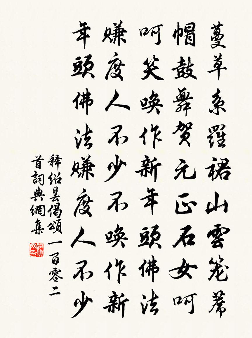 詩詞名句歷史字典書法欣賞書法字典國語詞典說文解字康熙字典古漢語字典標 題 作 者 詩 句 偈頌一百零二首作者:釋紹曇 朝代:宋代偈頌一百零二首原文蔓草系羅裙,山雲籠蓆帽。鼓舞賀元正,石女呵呵笑。喚作新年頭佛法,賺度人不少。不喚作新年頭佛法,賺度人不少。詩詞問答問:偈頌一百零二首的作者是誰?答:釋紹曇問:偈頌一百零二首寫於哪個朝代?答:宋代釋紹曇偈頌一百零二首書法欣賞偈頌一百零二首書法作品詩詞推薦霜後紀園中草木十二絕范成大〔宋代〕牡丹初翦時,已具新花眼。代謝不容發,笑殺鐵門限。挽和靖先生同閌〔宋代〕身占河南第一功,力行篤信守家風。淵源漫說斯文喪,深切今知此道東。七日夢楹終有待,三年築室恨無從。嵩伊過水羅漢圖劉克莊〔宋代〕陟淺猶須杖,誰雲佛有神。乃知杯渡者,只是熱瞞人。富谷館王珪〔唐代〕萬雀噪山館,重來一扣扉。去年寒夢在,今日遠書違。殘雪留春橐,疏星掛曉衣。帝鄉不可望,心與白雲飛。送明老游雁盪五首吳芾〔宋代〕昔年曾作雁山游,倒指今逾四十敉。嘆我豈勞蝴蝶夢,羨師重到大龍湫。送蕭世秀才鮑溶〔唐代〕心交別我西京去,愁滿春魂不易醒。從此無人訪窮病,馬蹄車轍草青青。題澤翁小巷王柏〔宋代〕縹緲雲煙外,迢迢江水明。數家藏密樹,一塔峭孤城。鳩銜枝謍巢樹間經月不成而去楊萬里〔宋代〕鳩婦那知自不棧,樹陰疏處起樓台。可憐積木如山樣,一桷何曾絮得來。府會次士特韻劉子翬〔宋代〕夜宴芙蓉苑,華榱燭影光。史君頻會客。侍女慣新妝。劇飲不勝醉,論詩非所長。倚欄霄漢近,宮殿郁相望。唐享昊天樂第四武則天〔唐代〕巍巍睿業廣,赫赫聖基隆。菲德承先顧,禎符萃眇躬。銘開武岩側,圖薦洛川中。微誠詎幽感,景命忽昭融。有懷避難雪竇之西坑游西麓庵陳著〔宋代〕山閒築屋古西坡,小小規模淨似磨。兩壁鼓鍾來雪竇,四圍松竹護雲窩。軒窗有趣高僧遠,門戶無遮俗客多。我寄越問舜禹孫因〔宋代〕帝舜生於姚丘兮,地近夷而居東。母握登感天瑞兮,漾祥光於大虹。歷山其所耕稼兮,陶漁皆有遺蹟。二女降於媯經局感言王安石〔宋代〕自古能全已不才,豈論騏驥與駑駘。放歸自食情雖適,絡首猶存亦可哀。送叔昭上人附施屯田還宣城梅堯臣〔宋代〕瓶巾過江去,遠託故人船。借問風濤勢,何如杯度年。食早荔七首劉克莊〔宋代〕蜀道閩山各有之,千林紅綠任紛披。杜詩息響難追和,蔡譜孤行欠補遺。寄舍弟徐璣〔宋代〕寄問安仁弟,弦歌又一年。流來溪水遠,清到縣門前。故里人情樂,新居物色鮮。宦歸言話款,正及早梅邊。禪人寫師真請贊釋慧遠〔宋代〕按輪王劍,全生殺機。豁開正眼,當頭者誰。從來無忌諱,底事沒商量。趙州密意憑誰訴,鐵作心肝也斷腸。送孫德諭罷官往黔州(孫父曾牧此州,因寄家也)苗發〔唐代〕中歲分符典石城,兩朝趨陛謁承明。闕下昨承歸老疏,天南今切去鄉情。親知握手三秋別,几杖扶身萬里行。伯道水仙花二首來氏〔宋代〕瑤池來宴老仙家,醉倒風流萼綠華。白玉斷笄金暈頂,幻成痴絕女兒花。郊廟歌辭祀圜丘樂章豫和褚亮〔唐代〕上靈眷命膺會昌,盛德殷薦葉辰良。景福降兮聖德遠,玄化穆兮天曆長。名句推薦思欲委符節,引竿自刺船。元結《賊退示官吏》 官無恆友,禍存斯虛,勢之所然,智者弗怠焉。來俊臣《羅織經·謀劃卷第九》 清香隨風發,落日好鳥歸。李白《詠鄰女東窗海石榴》 馬嘶人散後,秋風換、故園夢裡。吳文英《丁香結·夷則商秋日海棠》 滿衣血淚與塵埃,亂後還鄉亦可哀。高啟《送陳秀才還沙上省墓》 虛靜無事,以暗見疵。韓非及後人《韓非子·主道》 草色煙光殘照里,無言誰會憑闌意。柳永《蝶戀花·佇倚危樓風細細》 若言言悅耳,事事快心,便把此生埋在鴆毒中矣。洪應明《菜根譚·概論》 嘆鳳嗟身否,傷麟怨道窮。李隆基《經鄒魯祭孔子而嘆之》 風回雲斷雨初晴,返照湖邊暖復明。白居易《南湖早春》