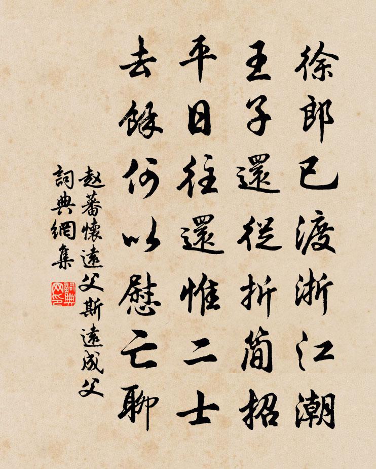 詩詞名句歷史字典書法欣賞書法字典國語詞典說文解字康熙字典古漢語字典標 題 作 者 詩 句 懷遠父斯遠成父作者:趙蕃 朝代:宋代懷遠父斯遠成父原文徐郎已渡浙江潮,王子還從折簡招。平日往還惟二士,去余何以慰亡聊。詩詞問答問:懷遠父斯遠成父的作者是誰?答:趙蕃問:懷遠父斯遠成父寫於哪個朝代?答:宋代趙蕃懷遠父斯遠成父書法欣賞懷遠父斯遠成父書法作品詩詞推薦偶作二首曾協〔宋代〕身閒贏得閉齋房,不向塵中染色香。靜處試尋真面目,光陰非短亦非長。江神子慢田為〔宋代〕玉台掛秋月。鉛素淺,梅花傅香雪。冰姿潔。金蓮襯、小小凌波羅襪。雨初歇。樓外孤鴻聲漸遠,遠山外、行人音題鮑行軍小閣嚴維〔唐代〕宇下無留事,經營意獨新。文房已得地,相閣是推輪。]席上招賢急,山陰對雪頻。虛明先旦暮,啟閉異冬春。談左目痛六言九首劉克莊〔宋代〕詩到歌行尤妙,傳與國語並行。艱辛張籍病瞎,浮誇左丘失明。再和四首郭印〔宋代〕天際油雲不肯收,全妨寓目向層樓。日車難把長繩挽,春事渾同去水流。可奈餘寒猶作沴,懸知徂暑未能秋。此方一剪梅·懷舊汪元量〔宋代〕十年愁眼淚巴巴。今日思家。明日思家。一團燕月照窗紗。樓上胡笳。塞上胡笳。玉人勸我酌流霞。急拈琵琶。緩春山衛宗武〔宋代〕青山四時好,春至尤盛麗。潤澤散沖融,華滋出枯悴。雲根鱗甲動,風柯羽旄曳。群芳間點染,一碧互經緯。組繡寄題龍泉李氏萬卷堂周必大〔宋代〕斷簡殘編已可披,排簽插架有餘師。五三載籍多為貴,九百虞初小不遺。潤屋殊非阿堵物,傳家自是寧馨兒。老來甲申上元前聞家君不快,西歸見梅有感二首楊萬里〔宋代〕千里來為五斗謀,老親望望且歸休。春光盡好關儂事?細雨梅花只做愁。領解後謝主司唐寅〔明代〕壯心未宜逐樵漁,泰運鹹思備掃除。劍責百金方折閱,玉遭三黜忽沽諸。紅綾敢望明年餅,黃絹深慚此日書。三策追和淵明貧土詩七首劉黻〔宋代〕扁舟溯西江,忽抵梅花州。二忠儼遺像,予愧非真儔。肝膽照冰雪,要亦狷者流。言直不砭時,掇禍貽親居。山禽再和時習五章取禮記一句玉藻習容觀玉聲袁甫〔宋代〕佩玉之聲清越長,此身無故詎容忘。挈渠方屨圜冠士,登我光風霽月堂。賡歌先秦無名〔先秦〕股肱喜哉。元首起哉。百工熙哉。元首明哉。股肱良哉。庶事康哉。元首叢脞哉。股肱惰哉。萬事墮哉。水調歌頭葛勝仲〔宋代〕勝友欣傾蓋,羈宦懶書空。愛君筆力清壯,名已在蟾宮。蕭散英姿直上,自有練裙葛帔,豈待半通銅。長短作新語柳梢青王庭珪〔宋代〕蘭亭絲竹。高會群賢,其人如玉。曲水流觴,燈前細雨,檐花蔌蔌。舞雩初試春衣,聽詠歌、童子五六。澤畔行吟雌雄曲楊維楨〔元代〕妾夫曉出塞,妾夜馳孤忠。誓作干將劍,一死雙雌雄。布袋和尚贊三首釋智朋〔宋代〕靠布袋作夢,有甚惺惺處。若遇當行家,喚醒吃茶去。歸田四時樂春夏二首歐陽修〔宋代〕南風原頭吹百草,草木叢深茅舍小。麥穗初齊稚子嬌,桑葉正肥蠶食飽。老翁但喜歲年熟,餉婦安知時節好。野棠群玉殿賜宴蔡襄〔宋代〕治道承炎歷,皇基亘萬年。深仁涵海岳,至德著坤乾。文物歸元首,臣鄰必巨賢。蓼蕭思及下,奕葉力追先。昕色頌古一百首釋智愚〔宋代〕青郊鳴錦雉,綠水漾金鱗。安得郢中客,共歌台上春。名句推薦窮巷多怪,曲學多辯。商鞅《商君書·更法》 記得去年今夕,釃酒溪亭,淡月雲來去。文徵明《念奴嬌·中秋對月》 步從容,立端正。揖深圓,拜恭敬。李毓秀《弟子規·謹》 下窺指高鳥,俯聽聞驚風。岑參《與高適薛據同登慈恩寺浮圖》 長江巨浪征人淚,一夜西風共白頭。宋琬《江上阻風》 鼙鼓動時雷隱隱,獸頭凌處雪微微。盧肇《競渡詩 / 及第後江寧觀競渡寄袁州剌史成應元》 山河風景元無異,城郭人民半已非。文天祥《金陵驛二首·其一》 悲吟雨雪動林木,放書輟劍思高堂。李白《留別於十一兄逖裴十三游塞垣》 士有妒友,則賢交不親;君有妒臣,則賢人不至。荀子《荀子·大略》 晚來風起花如雪,飛入宮牆不見人。劉禹錫《楊柳枝詞九首》
