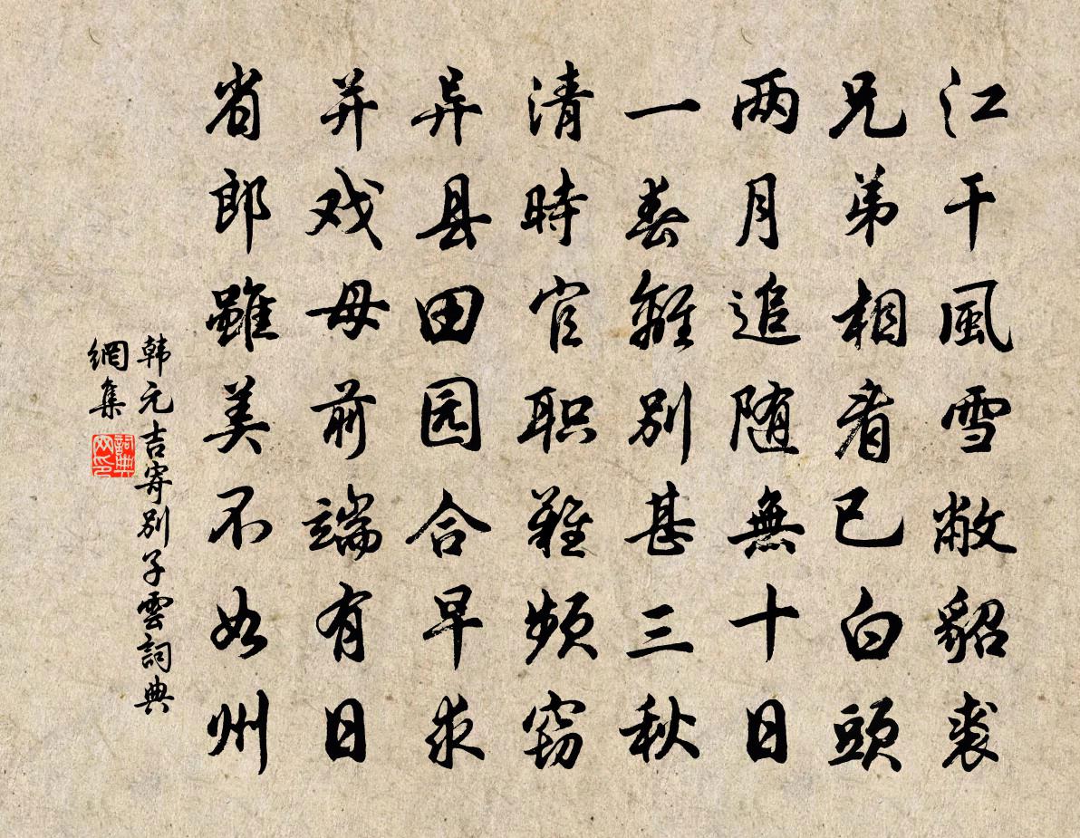 詩詞名句歷史字典書法欣賞書法字典國語詞典說文解字康熙字典古漢語字典標 題 作 者 詩 句 寄別子云作者:韓元吉 朝代:宋代寄別子云原文江乾風雪敝貂裘,兄弟相看已白頭。兩月追隨無十日,一春離別甚三秋。清時官職難頻竊,異縣田園合早求。並戲母前端有日,省郎雖美不如州。詩詞問答問:寄別子云的作者是誰?答:韓元吉問:寄別子云寫於哪個朝代?答:宋代問:韓元吉的名句有哪些?答:韓元吉名句大全韓元吉寄別子云書法欣賞寄別子云書法作品詩詞推薦少年李商隱〔唐代〕外戚平羌第一功,生年二十有重封。直登宣室螭頭上,橫過甘泉豹尾中。別館覺來雲雨夢,後門歸去蕙蘭叢。灞陵送褚校書歸舊山歌韋應物〔唐代〕握珠不返泉,匣玉不歸山。明皇重士亦如此,忽怪褚生何得還。方稱羽獵賦,未拜蘭台職。漢篋亡書已暗傳,嵩丘春曉聞鶯武元衡〔唐代〕寥寥蘭台曉夢驚,綠林殘月思孤鶯。猶疑蜀魄千年恨,化作冤禽萬囀聲。六言雜興陸游〔宋代〕世界庵摩勒果,聖賢優缽曇華。但解折衷六藝,何須和會三家。頌古釋慧空〔宋代〕不是風兮不是幡,胡僧兩耳帶金環。分明有語無人會,又上高樓看遠山。詠鴛鴦李遠〔唐代〕鴛鴦離別傷,人意似鴛鴦。試取鴛鴦看,多應斷寸腸。句高似孫〔宋代〕蓴逢鱸始服,橙入蟹偏香。感懷陸游〔宋代〕老病與世絕,屏跡三家村。我居一何陋,舉手屋可捫。客至不能迎,堅坐度朝昏。一窗修竹下,超然傲羲軒。外物再和十首蘇轍〔宋代〕城郭村墟共水雲,槿籬竹屋映柴門。隱居亦有高人在,岸幘無言倚釣軒。賦得聽邊鴻白居易〔唐代〕驚風吹起塞鴻群,半拂平沙半入雲。為問昭君月下聽,何如蘇武雪中聞?孝敬皇帝輓歌劉禕之〔唐代〕戒奢虛蜃輅,錫號紀鴻名。地葉蒼梧野,途經紫聚城。重照掩寒色,晨飆斷曙聲。一隨仙驥遠,霜雪愁陰生。太常引許有孚〔元代〕藕花無數半開時。池上客來稀。杖屨獨徘徊。忽翠蓋、因風盡欹。天工妝景,水神輸供,陶寫費新詩。身外杳難期逾嶺嶠止荒陬抵高要李紳〔唐代〕天將南北分寒燠,北被羔裘南卉服。寒氣凝為戎虜驕,炎蒸結作蟲虺毒。周王止化惟荊蠻,漢武鑿遠通孱顏。南標游南水陸院李新〔宋代〕蜀國山河在,梁原草樹深。暮雲千里色,無處不傷心。春日絕句陸游〔宋代〕二十四番花有信,一百七日食猶寒。眼中不是無春色,嘆息衰翁自鮮歡。秋日陝州道中作顧非熊〔唐代〕孤客秋風裡,驅車入陝西。關河午時路,村落一聲雞。樹勢標秦遠,天形到岳低。誰知我名姓,來往自棲棲。望鳴皋山白雲寄洛陽盧主簿李頎〔唐代〕飲馬伊水中,白雲鳴皋上。氛氳山絕頂,行子時一望。照日龍虎姿,攢空冰雪狀。嵡嵸殊未已,崚嶒忽相向。皎皎周祀圜丘歌 雲門舞庾信〔南北朝〕獻以誠。郁以清。山罍舉。沉齊傾。惟尚饗。洽皇情。降景福。通神明。軾近以月石硯屏獻子功中書公復以涵星硯獻純蘇軾〔宋代〕紫潭出玄雲,翳我潭中星。獨有潭上月,倒掛紫翠屏。我老不看書,默坐養此昏花睛。時時一開眼,見此雲月眼自傳上人之徑山釋子益〔宋代〕佛祖不傳希世寶,千人萬人覷不破。五峰相見索看時,切忌傾出一栲栳。名句推薦料因循誤了,殘氈擁雪,故人心眼。張炎《解連環·孤雁》 花隱掖垣暮,啾啾棲鳥過。杜甫《春宿左省》 勝日尋芳泗水濱,無邊光景一時新。朱熹《春日》 日邊訊息空沈沈。畫眉樓上愁登臨。鄭文妻《憶秦娥·花深深》 休問梁園舊賓客,茂陵秋雨病相如。李商隱《寄令狐郎中》 野花不種年年有,煩惱無根日日生。馮夢龍《警世通言·卷二十》 相思不管年華,喚酒吳娃市。吳文英《荔枝香近·送人游南徐》 移風易俗,莫善於樂。孔子及其弟子《孝經·廣要道》 鐘山抱金陵,霸氣昔騰發。李白《登梅岡望金陵贈族侄高座寺僧中孚》 相逢一醉是前緣,風雨散、飄然何處。蘇軾《鵲橋仙·七夕》