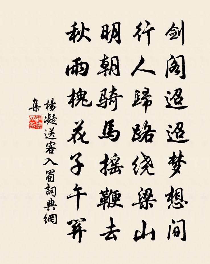 詩詞名句歷史字典書法欣賞書法字典國語詞典說文解字康熙字典古漢語字典標 題 作 者 詩 句 送客入蜀作者:楊凝 朝代:唐代送客入蜀原文劍閣迢迢夢想間,行人歸路繞樑山。明朝騎馬搖鞭去,秋雨槐花子午關。詩詞問答問:送客入蜀的作者是誰?答:楊凝問:送客入蜀寫於哪個朝代?答:唐代問:送客入蜀是什麼體裁?答:七絕楊凝送客入蜀書法欣賞送客入蜀書法作品注釋全唐詩:卷290_26詩詞推薦詠浣紗溪王昌齡〔唐代〕錢塘江上是誰家,江上女兒全勝花。吳王在時不得出,今日公然來浣紗。憶京雒木芍藥三絕蘇籀〔宋代〕沈薌亭北壓欄桿,眩耀熒煌障幄寬。不薄官梅伴飛霰,只饒蘭蕙楚騷寒。送鄭丈媚孚先改秩用廣西諸公韻陳宓〔宋代〕間關萬里游嶺海,誰知丈夫志有在。古賢足跡滿四方,豈但青編勤摭採。胸多聞見益崔嵬,節歷險夷終不改。山川題邵古香乾坤一亭何夢桂〔宋代〕一亭亦直寄,作者知為誰。結薜開戶牖,柱桂辛一夷楣。百年此宴樂,常恐生憂悲。天地一傳舍,過客安可羈。唐梅月吟姚宋佐〔宋代〕梅花得月太清生,月得梅花越樣明。梅月蕭疏兩奇絕,有人踏月繞花行。代書寄吳仲權趙蕃〔宋代〕長沙失會面,龍陽將叩門。君行黃鶴樓,我乃桃花源。裴回遂兩月,問訊非一言。時時得新作,日日思高軒。寧知金陵雜興二百首蘇泂〔宋代〕五陵歌舞換埃塵,地下黃金出尚新。碑字已漫青草死,酸風吹殺石麒麟。已亥雜詩 136龔自珍〔清代〕萬卷書生颯爽來,夢中喜極故人回。湖山曠劫三吳地,何日重生此霸才。連日得雜花數株藝之池亭感而有作韓元吉〔宋代〕七十已過半,所向意不如。一官計大州,僕僕畏簡書。酒薄不可醉,歌舞見已疏。亦有淡生活,詩成自相紓。池面次韻奉答廖袁州懷舊隱之詩黃庭堅〔宋代〕詩題怨鶴與驚猿,一幅溪藤照麝煙。聞道省郎方結綬,可容名士乞歸田。嚴安召見天嗟晚,賈誼歸來席更前。何況張轉運席上宋祁〔宋代〕偃藩多式宴,佳雪屢飄霙。意感年將盡,歡容酒剩行。伊公調鼎樂,羊祜衣裘輕。況屬輶軒暇,須容心賞並。次昌叔韻王安石〔宋代〕寄公無國寄鍾山,垣屋青松晻靄間。長以聲音為佛事,野風蕭颯水潺湲。天籟堂白玉蟾〔宋代〕到此令人玉骨寒,四圍紫翠玉迴環。玲瓏蒼壁竹敲竹,重疊畫屏山間山。猿笛曉聞冥漠外,松濤夜吼有無間。我將和三鄉詩王滌〔唐代〕浣紗游女出關東,舊跡新詞一夢中。槐陌柳亭何限事,年年回首向春風。放船和子遠韻王之道〔宋代〕冬溫寒日好,歲晚早梅開。帆腳隨風轉,江流與岸回。坐憐青嶂遠,靜見白鷗來。水驛三千里,斯游亦壯哉。句嚴大猷〔宋代〕笏未到身難擊泚,兵如入手易擒吳。偈二十首釋鼎需〔宋代〕虎頭帶角人難措,石火電光須密布。假饒烈士薦應難,懵底那能解回互。侍香金童蔡伸〔宋代〕寶馬行春,緩轡隨油壁。念一瞬、韶光堪重惜。還是去年同醉日。客里情懷,倍添悽惻。記南城、錦徑名園曾遍歷癸未至節以病晚起走筆戲書紀事排悶十首方回〔宋代〕雲無事書者,泥屨隔牆聲。小市扃虛肆,荒庖絕美烹。流涎淮蟹紫,入夢海柑頳。莫殢閉關卦,兵戈商不行。南朝楊億〔宋代〕五鼓端門漏滴稀,夜簽聲斷翠華飛。繁星曉埭聞雞度,細雨春場射雉歸。步試金蓮波濺襪,歌翻玉樹涕沾衣。龍盤名句推薦衣帶漸寬終不悔,為伊消得人憔悴。柳永《蝶戀花·佇倚危樓風細細》 何時更杯酒,再得論心胸。李白《魏郡別蘇明府因北游》 燕簾鶯戶,雲窗霧閣,酒醒啼鴉。張炎《朝中措·清明時節》 夫寵而不驕,驕而能降,降而不憾,憾而能珍者鮮矣。左丘明《左傳·隱公·隱公三年》 料峭春寒中酒,交加曉夢啼鶯。吳文英《風入松·聽風聽雨過清明》 思其艱以圖其易佚名《尚書·周書·君牙》 不可以一時之得意,而自誇其能;亦不可以一時之失意,而自墜其志。馮夢龍《警世通言·卷十七》 不鳴則已,一鳴驚人。司馬遷《滑稽列傳》 既秉上皇心,豈屑末代誚。謝靈運《七里瀨》 築室兮水中,葺之兮荷蓋;屈原《九歌·湘夫人》