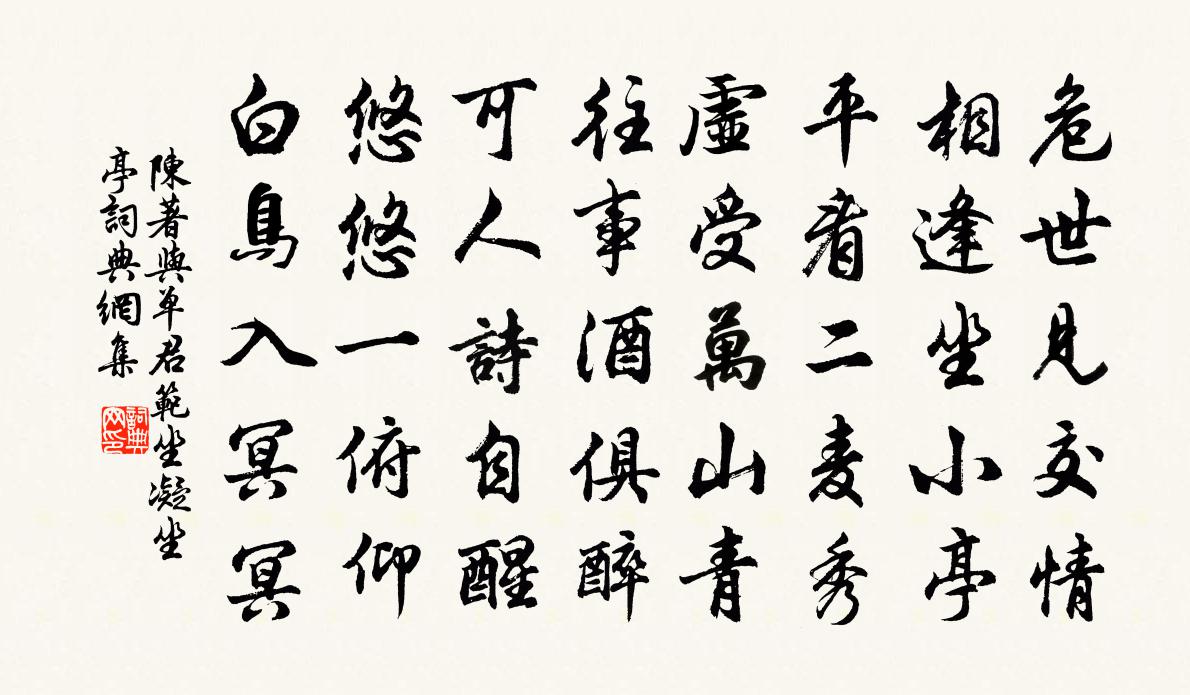詩詞名句歷史字典書法欣賞書法字典國語詞典說文解字康熙字典古漢語字典標 題 作 者 詩 句 與單君范坐凝坐亭作者:陳著 朝代:宋代與單君范坐凝坐亭原文危世見交情,相逢坐小亭。平看二麥秀,虛受萬山青。往事酒俱醉,可人詩自醒。悠悠一俯仰,白鳥入冥冥。詩詞問答問:與單君范坐凝坐亭的作者是誰?答:陳著問:與單君范坐凝坐亭寫於哪個朝代?答:宋代陳著與單君范坐凝坐亭書法欣賞與單君范坐凝坐亭書法作品詩詞推薦點絳唇蒲道源〔元代〕西蜀咽喉,鉤連閣道蒼崖斗。□皇天授。故國□江口。往事浮雲,依舊梁山秀。時延首。淡煙疏柳。欲畫無奇手。青玉案尹志平〔元代〕群魔散盡真何亂。萬事無縈絆。一點光同青玉案。纖塵不掛,永無障礙,得見虛空面。勸君早把塵情拚。下手速修和尉遲侍郎夏杪聞蟬戴叔倫〔唐代〕楚人方苦熱,柱史獨聞蟬。晴日暮江上,驚風一葉前。盪搖清管雜,幽咽野風傳。旅舍聞君聽,無由更晝眠。夢中作晁公溯〔宋代〕舉鞭重到故都行,予亦咨嗟恨不勝。心與隴雲留漢苑,目隨煙樹繞秦陵。次韻趙去華提乾夏日雜興七首蘇泂〔宋代〕老子軒冕總相忘,歸辦芙蓉製作裳。多少隱淪天下士,無人知我亦何傷。何秀才郊園五首司馬光〔宋代〕主人耽詩書,樂道深居久。挾策往來游,東岡復南畝。次韻沈元吉兵火後初食羊王之道〔宋代〕時難盆甑久無羶,夢寐何郎食萬錢。一臠乍驚肥羜美,五紽應喜敝裘全。好從牛炙論蓴菜,堪笑河魨詠柳綿。彈鋏北苑十詠試茶蔡襄〔宋代〕兔毫紫甌新,蟹眼青泉煮。雪凍作成化,雲間未垂縷。願爾池中波,去作人間雨。句吳璋〔宋代〕倒懸欲墮花如綴,背立將飛鳥似驚。和邵康節蒼蒼吟徐僑〔宋代〕穹窿奠計幾層蒼,繚繞難輸九曲腸。七曜運空機不斷,百川流下礙無妨。千林松柏獨堅正,一草薰蕕異臭香。祥戾句幸夤遜〔唐代〕苦教作鎮居中國,爭得泥金在泰山。才聞暖律先偷眼,既待和風始展眉。蒙君知重惠瓊實,薄起金刀釘玉深。嚼處詠史上楚元王交陳普〔宋代〕荒蕪新語不堪聽,猛士淒淒北鄙聲。楚醴不延風雅客,詩書猶未脫秦坑。悼廣鈞師釋智圓〔宋代〕北僧傳示滅,高跡更難尋。故國房空在,新墳草已深。雲泉違舊約,風月罷論心。默坐看遺偈,西窗月又沈。次韻徐宰集珠溪方岳〔宋代〕山家鳧鶩散平田,沙路雲深屐屢穿。半醉半醒寒食酒,欲晴欲雨杏花天。春能醞藉如相識,柳自風流未肯眠。野老感遇之五陳子昂〔唐代〕市人矜巧智。於道若童蒙。傾奪相夸侈。不知身所終。曷見玄真子。觀世玉壺中。窅然遺天地。乘化入無窮。已亥雜詩 199龔自珍〔清代〕野冬修竹欲連天,苦費西鄰買筍錢。此是商鞅墾土令,不同鑿空誤開邊。頌十玄談演教釋印肅〔宋代〕三乘次第演金言,義體周天應自連。黃葉止啼兒不叫,方知累劫困如眠。題資福院平綠軒王用亨〔宋代〕禪窗虛敞瞰西南,野色溪光接畫檐。云云碧天無間斷,一眉依約見山尖。歸自郡中道上口占吳芾〔宋代〕禾黍離離壓道旁,蹇驢歸去晚風涼。揚鞭西指吾廬近,想見新醅已可嘗。東林作寄金陵知己齊己〔唐代〕十八賢真在,時來拂榻看。已知前事遠,更結後人難。泉滴勝清磬,松香掩白檀。憑君聽朝貴,誰欲厭簪冠。名句推薦學而不思則罔,思而不學則殆。孔子弟子《論語·為政篇》 新樣靚妝,艷溢香融,羞殺蕊珠宮女。趙佶《燕山亭·北行見杏花》 對菱花、與說相思,看誰瘦損。陸叡《瑞鶴仙·梅》 對望中天地,洞然如刷。史達祖《滿江紅·中秋夜潮》 他鄉逢七夕,旅館益羈愁。孟浩然《他鄉七夕》 功被天下,守之以讓。荀子《荀子·宥坐》 玉在山而草木潤,淵生珠而崖不枯。荀子《荀子·勸學》 日落波平。愁損辭鄉去國人。朱敦儒《採桑子·彭浪磯》 昔孟母,擇鄰處。子不學,斷機杼。王應麟《三字經·全文》 春如舊。人空瘦。淚痕紅浥鮫綃透。陸游《釵頭鳳·紅酥手》