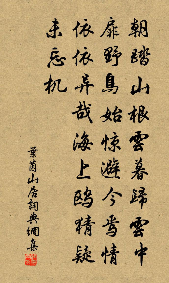 詩詞名句歷史字典書法欣賞書法字典國語詞典說文解字康熙字典古漢語字典標 題 作 者 詩 句 山居作者:葉茵 朝代:宋代山居原文朝踏山根雲,暮歸雲中扉。野鳥始驚避,今焉情依依。異哉海上鷗,猜疑未忘機。詩詞問答問:山居的作者是誰?答:葉茵問:山居寫於哪個朝代?答:宋代葉茵山居書法欣賞山居書法作品詩詞推薦過法雲寺王安石〔宋代〕路過潮溝 * 盤,招提雪脊隱雲端。金鈿一一花總老,翠被重重山更寒。別曾源一葉茵〔宋代〕梅邊又上帝王都,柳上俄空處士廬。漢月楚星人去後,淮雲蜀雨事何如。東龜不食西征缺,南雁難期北信疏。此去寄{左亻中麼右刃}堂仁和尚釋慧遠〔宋代〕一擊當機,千聖莫窺。佩無文印,著糞掃衣。踞魔王殿,開邪見扉。說禪說道,惡口臊齒。論心論性,撒屎撒尿。相和歌辭賈客詞劉禹錫〔唐代〕賈客封無定游,封所游惟利封並。眩俗封雜良苦,乘時知重輕。心計析秋毫,搖鉤侔懸衡。錐刀既無棄,轉化日已題尤使君郡圃十二詩樂山堂李庚〔宋代〕青山如避世,詎肯詣公府。仁人如好賢,招邀入庭戶。拄笏對朝氣,捲簾當暮雨。是中有佳趣,莫與兒輩語。嶺外守歲(一作李德裕詩)李福業〔唐代〕冬去更籌盡,春隨斗柄回。寒暄一夜隔,客鬢兩年催。送友人之揚州(一作游淮南)李頻〔唐代〕一別長安後,晨征便信雞。河聲入峽急,地勢出關低。綠樹叢垓下,青蕪闊楚西。路長知不惡,隨處得詩題。僧舍白牡丹二首吳融〔唐代〕膩若裁雲薄綴霜,春殘獨自殿群芳。梅妝向日霏霏暖,紈扇搖風閃閃光。月魄照來空見影,露華凝後更多香。天生添字浣溪沙/山花子佚名〔宋代〕蜜室蜂房別有香。臘前偏會泄春光。凝佇清容何所似,笑姚黃。蠟注金鍾誠得意,風飄氣味壓群芳。不似壽陽夸粉海棠圖陸游〔宋代〕人間奇草木,天必付名流。菊待陶元亮,竹須王子猷。我為西蜀客,辱與海棠游。再見應無日,開圖特地愁。竹書筒二首石介〔宋代〕過者創奇制,霜圓斷竹尋。蒼筤破雲色,蕭瑟移風音。徑寸不為短,探幽乃覺深。中間自空洞,枝幹何嶔崟。投恐應天長(平湖秋月)張矩〔宋代〕候蛩探暝,書雁寄寒,西風暗剪綃織。報導鳳城催鑰,笙歌散無跡。冰輪駕,天緯逼。漸款引、素娥遊歷。夜妝靚九日奉懷子濟兄李洪〔宋代〕霜天寥落雁行孤,九日還能行樂無。料想山風吹醉帽,也應溪女解攜壺。賞心樂事今難偶,弟勸兄酬嘆莫俱。籬下夜宿橋岸岳珂〔宋代〕裊纜宿前灣,平蕪泱漭間。舫移星在戶,岸迥斗藏山。淺瀨不勝揭,浮竹何日閒。夜深聞過櫓,知自溧陽還。贈婦詩秦嘉〔兩漢〕曖曖白日。引曜西傾。啾啾雞雀。羣飛赴楹。皎皎明月。煌煌列星。嚴霜悽愴。飛雪覆庭。寂寂獨居。寥寥空室。和浦城買舟趙希逢〔宋代〕倦客逢萸節,生涯寄葉舟。窮途危不雇,飛棹去難留。舊菊重陽日,寒蘆兩岸秋。多情惟破帽,猶恐老人頭。城西野行釋紹嵩〔宋代〕細草疏花自在春,悠悠煙水似天津。垂揚一徑深深去,白鳥雙飛不避人。裴大夫見過姚合〔唐代〕湖南譙國盡英髦,心事相期節義高。解下佩刀無所惜,新聞天子付三刀。宮詞王珪〔唐代〕玉兔何年上月宮,夜間搗藥特無蹤。神丹不老姮娥鬢,乞取刀圭駐玉容。雜劇·小張屠焚兒救母佚名〔元代〕楔子(外末上,開)老夫王員外便是,家住在汴梁西北角隱賢莊居住。家中有萬貫錢財。有個孩兒,喚做萬寶奴,名句推薦六翮飄颻私自憐,一離京洛十餘年。高適《別董大二首》 太乙近天都,連山接海隅王維《終南山》 朝騁騖兮江皋,夕弭節兮北渚;屈原《九歌》 山際見來煙,竹中窺落日。吳均《山中雜詩》 人之生不能無群荀子《荀子·富國》 挽弓當挽強,用箭當用長。杜甫《前出塞九首》 秦時明月漢時關,萬里長征人未還。王昌齡《出塞二首·其一》 休說鱸魚堪膾,盡西風,季鷹歸未?辛棄疾《水龍吟·登建康賞心亭》 去來江口守空船,繞船月明江水寒。白居易《琵琶行 / 琵琶引》 客自長安來,還歸長安去。李白《金鄉送韋八之西京》