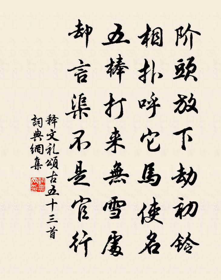詩詞名句歷史字典書法欣賞書法字典國語詞典說文解字康熙字典古漢語字典標 題 作 者 詩 句 頌古五十三首作者:釋文禮 朝代:宋代頌古五十三首原文階頭放下劫初鈴,相撲呼它馬使名。五棒打來無雪處,卻言渠不是官行。詩詞問答問:頌古五十三首的作者是誰?答:釋文禮問:頌古五十三首寫於哪個朝代?答:宋代釋文禮頌古五十三首書法欣賞頌古五十三首書法作品詩詞推薦句釋仲休〔宋代〕護塔雲偏重。二月初十日自荻浦絕湖三首趙蕃〔宋代〕二月風濤壯,扁舟性命輕。白頭高浪接,青眼遠山橫。客子空懷怖,漁家自樂生。須渠一杯酒,助我五言城。如夢令史浩〔宋代〕試把珠簾低卷。宛見梅妝粉面。綠繞更紅圍,齊捧瑤卮來勸。堪羨。堪羨。此是神仙閬苑。感懷 其二王冕〔元代〕蒙莊曠達士,魯連倜儻生。不徼一時利,乃有千載名。雎澤務詭譎,儀秦尚縱橫。反覆弄小技,於道未為貞。聖賢過南雄調木倅陳元晉〔宋代〕道遠胡為至此哉,班行見說正須才。多應詩興清無奈,特為觀梅故一來。春濃曲周弼〔宋代〕雨膏蒸土蘭芽熱,粉魂淡艷凝緗纈。柳條無力受東風,桃葉春江弄花月。枕函墜發昏眠重,綺帳驚寒替花恐。屏瑣病中戲詠陸游〔宋代〕八十行加二,清秋住故山。新涼足眠睡,舊疾害躋攀。雪白紛殘鬢,梔黃染病顏。疲牛臥斜日,羸馬噍枯菅。貧廢次韻康平仲侍郎叢丞相張公登倚雲停二首李彌遜〔宋代〕皂蓋凌虛豈易陪,捫參那復歡高哉。雲關□處塵蹤斷,松蓋陰中寶地開。戎幕寇平高臥鼓,賓筵詩罷細銜杯。笑談冬暮白玉蟾〔宋代〕風落松梢雪,山收竹外煙。清吟凝醉眼,獨立聳新肩。太湖周文璞〔宋代〕太湖我污池,茂苑我林莽。橘柚我堆盤,鱸魚我登俎。區區為苹花,移去溪上住。終當賦歸歟,來此臥煙雨。道釋六言二首劉克莊〔宋代〕蕭衍老公苦行,捨身之舉壯哉。只怕侯丞相者,不許梁朝贖回。伯謙招飲龍潭攀桂亭程公許〔宋代〕碧潭四繞水仙墳,老桂團團蔭綠尊。拚與故人償一醉,梅花吹夢過前村。赴官鹹平蔡河阻水泊舟宛兵皇華亭下三首張耒〔宋代〕夜空如監碧新磨,倒影疏星亂素波。天色水光無別處,為君垂手攬銀河。呂武第一百一十三文天祥〔宋代〕疾惡懷剛腸,世人皆欲殺。魂魄猶正直,回首肝肺熱。和富公權宗丞十站王之道〔宋代〕嗟予少也戇無奇,才力而今老更衰。文陣異時逢大敵,猶能斬將復搴旗。玉樓春李朝卿〔宋代〕厭玉為漿麟作□。玉樹瓊葩長不謝。翠簾繡暖燕歸來,寶鴨花香蜂上下。沙堤佩馬催公駕,月白風清天不夜。重來點絳唇(只林寺勸農)郭應祥〔宋代〕小隊郊坰,耄倪爭看銅章史。來宣德意。勸相遵彝制。夜雨連明,百穀應滋遂。真奇事。開禧元二。總是豐登歲。九日和向巨源送行韻吳芾〔宋代〕世事無窮生有涯,羞將白髮對黃花。一江秋水涵初雁,萬里暮天飛落霞。昔日自憐長作客,今朝方喜得還家。尊前讀福建謙廉訪輔大使遺事戴表元〔宋代〕臬官難稱是閩中,遺愛堂堂得比公。姓字丹青太史筆,歲時籩豆素王宮,一生薑桂那時辣,百死江湖必向東。從古慶壽寺 其一王冕〔元代〕寶剎都城內,今朝曠野中。浮圖瞻寶志,書記憶劉聰。畫屋煙花繞,青松雨露濃。徘徊增感慨,歷落問英雄。名句推薦一點烽傳散關信,兩行雁帶杜陵秋。陸游《秋晚登城北樓》 未怪平陽客,雙淚落、笛中哀曲周邦彥《大酺·春雨》 山圍故國周遭在,潮打空城寂寞回。劉禹錫《金陵五題·石頭城》 知者樂水,仁者樂山。孔子弟子《論語·雍也篇》 天變不足畏,祖宗不足法,人言不足恤。脫脫《宋史·列傳·卷八十六》 玩人喪德,玩物喪志。佚名《尚書·周書·旅獒》 迎醉面,暮雪飛花,幾點黛愁山暝。吳文英《十二郎·垂虹橋》 歸雲一去無蹤跡,何處是前期?柳永《少年游·長安古道馬遲遲》 綺席象床寒玉枕,美人何處醉黃花。汪元量《望江南·幽州九日》 願君多採擷,此物最相思。王維《相思》