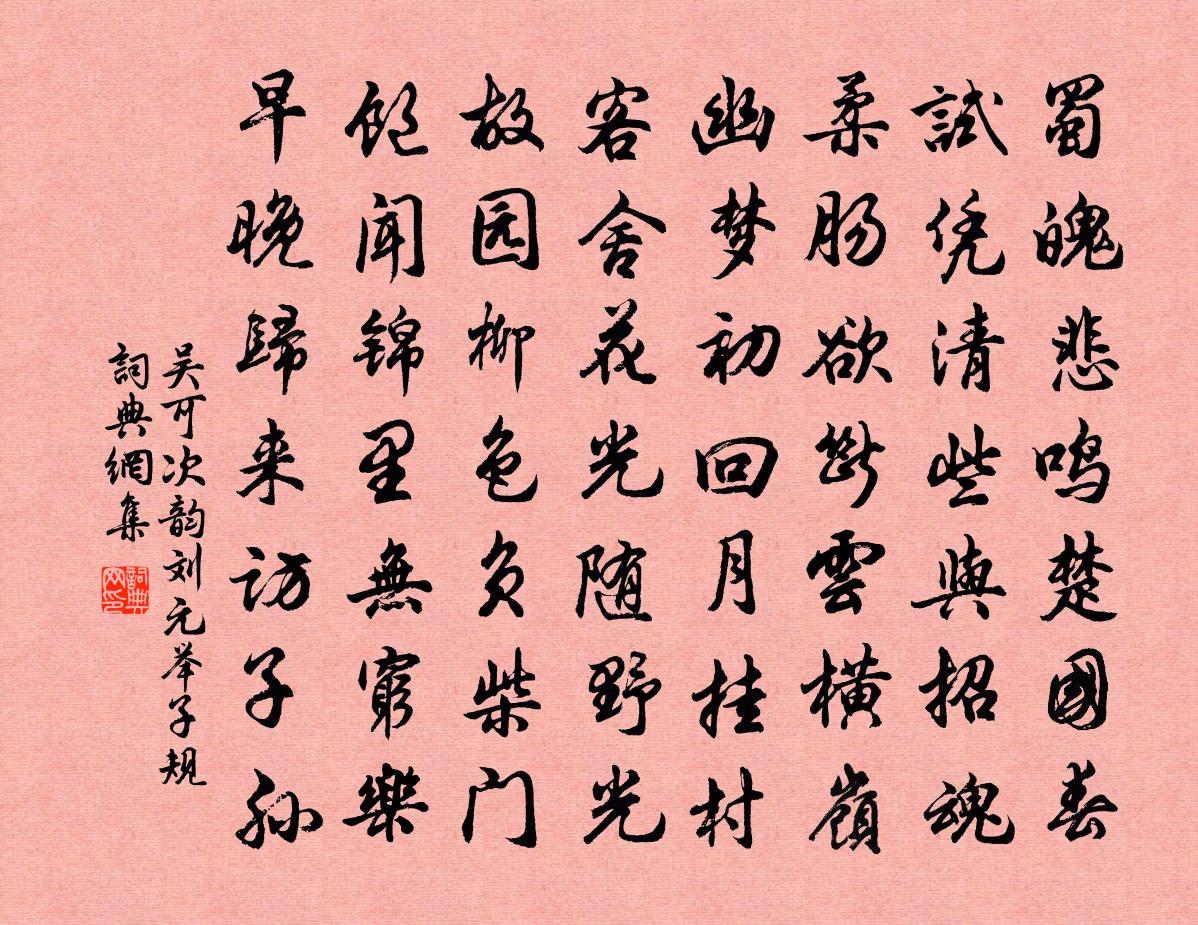 詩詞名句歷史字典書法欣賞書法字典國語詞典說文解字康熙字典古漢語字典標 題 作 者 詩 句 次韻劉元舉子規作者:吳可 朝代:宋代次韻劉元舉子規原文蜀魄悲鳴楚國春,試憑清些與招魂。柔腸欲斷雲橫嶺,幽夢初回月掛村。客舍花光隨野光,故園柳色負柴門。飽聞錦里無窮樂,早晚歸來訪子孫。詩詞問答問:次韻劉元舉子規的作者是誰?答:吳可問:次韻劉元舉子規寫於哪個朝代?答:宋代吳可次韻劉元舉子規書法欣賞次韻劉元舉子規書法作品詩詞推薦陳繹越州從事梅堯臣〔宋代〕母夫人老母兄黜,夫人從爾之會稽。恐傷爾心不敢泣,春崗細雨聞竹雞。時亦藏淚未出臉,奈何相與頭傾低。誠知滿庭芳(戊戍上元喜霽,訪開桃洞)程珌〔宋代〕去臘飛花,今春未已,迤邐將度元宵。俄然甲子,青帝下新條。淨掃一天沈靄,紅輪滿、大地山河。從今好,便當寄右省李起居韋莊〔唐代〕已向鴛行接雁行,便應雙拜紫薇郎。才聞闕下征書急,已覺回朝草詔忙。白馬似憐朱紱貴,彩衣遙惹御爐香。多慚入峽歌楊萬里〔宋代〕峽山未到日日愁,峽山已到愁卻休。不是朝來愁便散,愁 * 來山不管。昨宵遠望最高尖,今朝近看雲隔簾。樓船潛佚名〔先秦〕猗與漆沮,潛有多魚。有鱣有鮪,鰷鱨鰋鯉。以享以祀,以介景福。蠶谷行杜甫〔唐代〕天下郡國向萬城,無有一城無甲兵。焉得鑄甲作農器,一寸荒田牛得耕。牛盡耕,蠶亦成。不勞烈士淚滂沱,男谷題張氏隱居二首杜甫〔唐代〕春山無伴獨相求,伐木丁丁山更幽。澗道餘寒歷冰雪,石門斜日到林丘。不貪夜識金銀氣,遠害朝看麋鹿游。乘興鷓鴣天(壽四十舅)廖行之〔宋代〕飛盡林花綠葉絲。十分春色在荼蘼。多情幾日風朝雨,留戀東風未許歸。天意好,與君期。如今且醉□蛾眉。明年工侍國史李丈奉御香禱雪上竺前一夕雪瑞已應程公許〔宋代〕憂旱憂蝗恰一年,未春喜見六花妍。極知氣脈艱調護,須得醫和為保全。六祖釋安永〔宋代〕黃梅半夜錯分付,才得星兒便亂做。一庾嶺頭屙一堆,後代兒孫遭點污。發大通趙蕃〔宋代〕五更催發船無限,及此風收浪不生。何事漁舟亦爭進,始知為利總營營。贈天僧晁說之〔宋代〕驅馳疲朔馬,邂逅見吳僧。便覺秋容淨,彌憐客恨澄。青山尋舊賞,白社語新燈。他日扁舟去,儂家一笑能。三月二十六日工部宿直喻良能〔宋代〕邃宇近霄漢,微風搖竹梢。漏聲通五夜,鍾韻自三茅。衣裌偏宜睡,杯單詎用庖。夙興那敢後,雞唱已嘐嘐。好事近蔡伸〔宋代〕十幅健帆風,天意巧催行客。極目五湖雲浪,泛滿空秋色。玉人應怪誤佳期,凝恨正脈脈。錦鱗為傳尺素,報蘭舟長城鮑溶〔唐代〕蒙公虜生人,北築秦氏冤。禍興蕭牆內,萬里防禍根。城成六國亡,宮闕啟千門。生人半為土,何用空中原。奈何寄滁州邵子發同年二首張耒〔宋代〕夫子才豪官尚卑,窮城冷落有誰知。莫嫌五斗紆高興,且與青山賦好詩。得失可齊陶令酒,功名休問蜀莊蓍。三年竹枝皇甫松〔唐代〕斜江風起動橫波,劈開蓮子苦心多。晚臥二首趙蕃〔宋代〕軒小才堪置竹床,晚來新浴快初涼。掃除諸妄歸真想,檐卜林中聞妙香。飲百花洲四首黎廷瑞〔宋代〕桃花繞屋竹參天,曾向湖西住五年。回首但余葵麥在,古今何必更桑田。次韻子瞻和淵明飲酒二十首蘇轍〔宋代〕南方有貧士,狂怪如病風。垢面發如葆,自污屠酒中,導我引河水,上與崑崙通。長箭挽不盡,不中無尤弓。名句推薦星稀河影轉,霜重月華孤。張孝祥《臨江仙·試問梅花何處好》 十輪霜影轉庭梧,此夕羈人獨向隅。晏殊《中秋月》 泉聲咽危石,日色冷青松。王維《過香積寺》 來歲長安春事早,勸杏花、斷莫相思死。龔自珍《金縷曲·癸酉秋出都述懷有賦》 濤瀾洶湧,風雲開闔。蘇轍《黃州快哉亭記》 用人物,須明求。儻不問,即為偷。李毓秀《弟子規·謹》 欲寄書如天遠,難銷夜似年長。賀鑄《西江月·攜手看花深徑》 獨自淒涼還自遣,自製離愁。龔自珍《浪淘沙·寫夢》 小酌酒巡銷永夜,大開口笑送殘年。白居易《雪夜小飲贈夢得》 兵戈既未息,兒童盡東征。杜甫《羌村三首·其三》