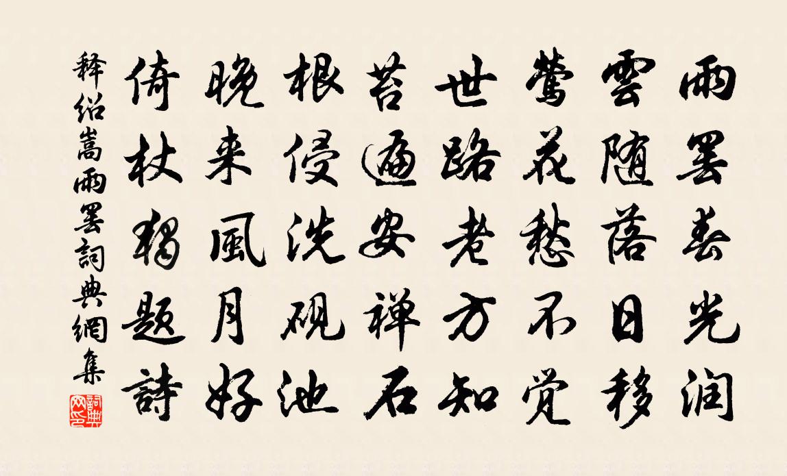 詩詞名句歷史字典書法欣賞書法字典國語詞典說文解字康熙字典古漢語字典標 題 作 者 詩 句 雨罷作者:釋紹嵩 朝代:宋代雨罷原文雨罷春光潤,雲隨落日移。鶯花愁不覺,世路老方知。苔遍安禪石,根侵洗硯池。晚來風月好,倚杖獨題詩。詩詞問答問:雨罷的作者是誰?答:釋紹嵩問:雨罷寫於哪個朝代?答:宋代釋紹嵩雨罷書法欣賞雨罷書法作品詩詞推薦菊畹秋香陳杰〔宋代〕金莖余孤標,青女滿殺氣。隨地堪百畦,流芳亦千歲。畫緋桃題詩賈蓬萊〔宋代〕硃砂顏色瓣重台,曾是劉郎舊看來。只好天台雲里種,莫教移近俗人栽。和方丞陳宓〔宋代〕人物方今正眇然,喔松依舊志逾堅,寧為雞口羞牛後,孔聖從來恥孰鞭。呂偉信求冰花詩賦得兩絕蘇籀〔宋代〕霰集柏杉霏靀鬆,瓦冰鐫畫葉柯葩。密移裁化鍾纖巧,梁苑詩盟斲句佳。惜余春慢(春雨)劉塤〔宋代〕玉勒絲鞭,彩旗紅索,總向愁中休了。偏憐景媚,為甚愁濃,都為雨多晴少。桃杏開到梨花,紅印香印,綠平幽沼夜聽黃仲立彈廣陵徐照〔宋代〕月色照君琴,移床出木陰。數聲廣陵水,一片古人心。投劍功無補,衝冠怒亦深。蹤能清客耳,還是亂時音。瀑布灣黃仲〔宋代〕飛來瀑布破青山,遂作寒流水一灣。民庶只疑投石效,豈知龍臥在其間。破虜凱歌六首周麟之〔宋代〕夜半江風金鼓聲,拔營初起石頭城。虜情不料諸軍渡,一戰淮西唾手平。霜晴陸游〔宋代〕萬瓦新霜白,一窗朝日晴。破裘身亦暖,細字眼猶明。耄喜譫諄語,衰常踸踔行。登封書不草,力穡報時平。次韻羅郢州送別項安世〔宋代〕江上相留不肯留,渡江沿岸卻回頭。漢江東去人西去,不見高城始是愁。六州歌頭劉辰翁〔宋代〕向來人道,真箇勝周公。燕然眇。浯溪小。萬世功。再建隆。十五年宇宙,宮中膺。堂中伴。翻虎鼠,搏鸇雀,覆清江引·棄微名去來心快哉貫雲石〔元代〕棄微名去來心快哉,一笑白雲外。知音三五人,痛飲何妨礙?醉袍袖舞嫌天地窄。 競功名有如車下坡,驚險誰次韻天平觀文龐相公以久留塞下見寄宋祁〔宋代〕昔駕軺封北護邊,已慚星鬢久凋年。御爐香外拋晨謁,刁斗聲中廢夜眠。梁雪送殘他日賦,郭舟誰共此時仙。思歸滿江紅洪咨夔〔宋代〕把酒西風酒,渾莫問酒、主賓誰酒惡。千古酒事、幾□遇合,幾人流落。肝膽輪囷溟渤小,精神浩蕩蓬萊薄。望拒和程德遠二首王之道〔宋代〕未盡通宵話,猶如一日秋。壯懷天共遠,歸意雨同留。燈燼何明滅,蛩聲靜應酬。十年為客夢,應不負瀛洲。丁氏厚德堂戴表元〔宋代〕賤士懷永憂,一物常恐枯。貴者止營私,智或遺妻孥。肉食從古鄙,黃金使人愚。我游四十年,錢塘車馬區。但見多福寺釋斯植〔宋代〕野鹿自成群,山中少隱君。鐘聲兩寺合,人語一溪分。泉響松間雨,苔生石上紋。多年僧住此,半榻鎖閒雲。江城子 寄張世傑馬需庵〔元代〕年華都逐水流東。再相逢。一衰翁。不道而今,豪氣減元龍。白髮青衫人老矣,才又向,舞雩風。片帆煙雨淡溟濛用文潛館中韻贈蔡學正天啟晁補之〔宋代〕蔡侯飽學囷千釜,濯足清江起南土。立談頗似燕客豪,快奪范睢如墜雨。東城禽羽未足言,柏直何為口方乳。蔣侯觀音詩釋契適〔宋代〕水精盤躍錦鱗魚,悶於淵沉海岸居。秀世竹鳴金鸑鷟,觀空波涌玉蟾蜍。輕明纓絡垂身後,重疊芙蓉襯足初。曾向名句推薦紅臉青腰,舊識凌波女。晏幾道《蝶戀花·笑艷秋蓮生綠浦》 閒夢江南梅熟日,夜船吹笛雨蕭蕭。皇甫松《夢江南·蘭燼落》 塞馬一聲嘶,殘星拂大旗。納蘭性德《菩薩蠻·朔風吹散三更雪》 同心一人去,坐覺長安空。白居易《別元九後詠所懷》 疏林紅葉,芙蓉將謝,天然妝點秋屏列。薛昂夫《西湖雜詠·秋》 屈盤戲白馬,大笑上青山。李白《登敬亭北二小山余時送客逢崔侍御並登此地》 燈半昏時,月半明時。徐再思《折桂令·春情》 浮雲遮月不分明,誰挽長江一洗放天青?董士錫《虞美人·韶華爭肯偎人住》 離堂思琴瑟,別路繞山川。陳子昂《春夜別友人二首·其一》 寂寂竟何待,朝朝空自歸。孟浩然《留別王侍御維 / 留別王維》