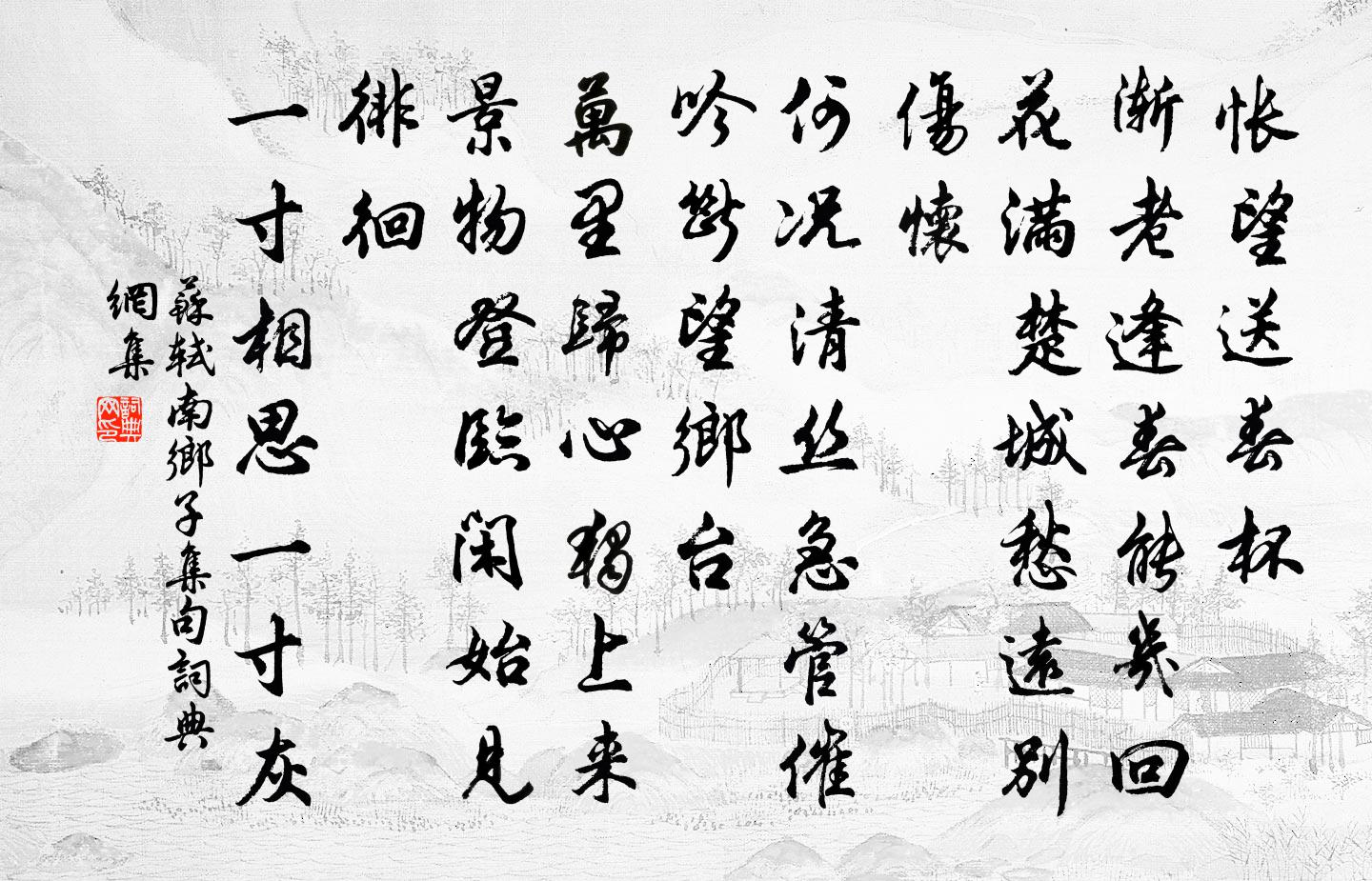 “悵望送春懷 ”,起筆取杜牧《惜春》詩句,點對酒傷春意境。悵望著這杯送春之酒,撩起了比酒更濃的傷春之情。次句直抒傷春所以傷老 。“漸老逢春能幾回”取杜甫《絕句漫興九首》之句。杜甫此詩是飄泊成都時作。漸老,語意含悲。逢春,則一喜。能幾回?又一悲。非但一悲,且將逢春之喜也一併化而為悲。一句之中一波三折,筆致淡宕而蒼老。前人謂杜詩筆老,說得極是。東坡拿來此句,妙在正好寫照了自己在“烏台詩案”後貶謫黃州的相似心情。東坡黃州詩《安國寺尋春》雲“看花嘆老憶年少,對酒思家愁老翁 ”,可盡此句意蘊。此時正是看花嘆老,對酒思家,所以下句便道:“花滿楚城愁遠別。”此句取自許渾《竹林寺別友人》詩 。時當春天,故曰花滿。