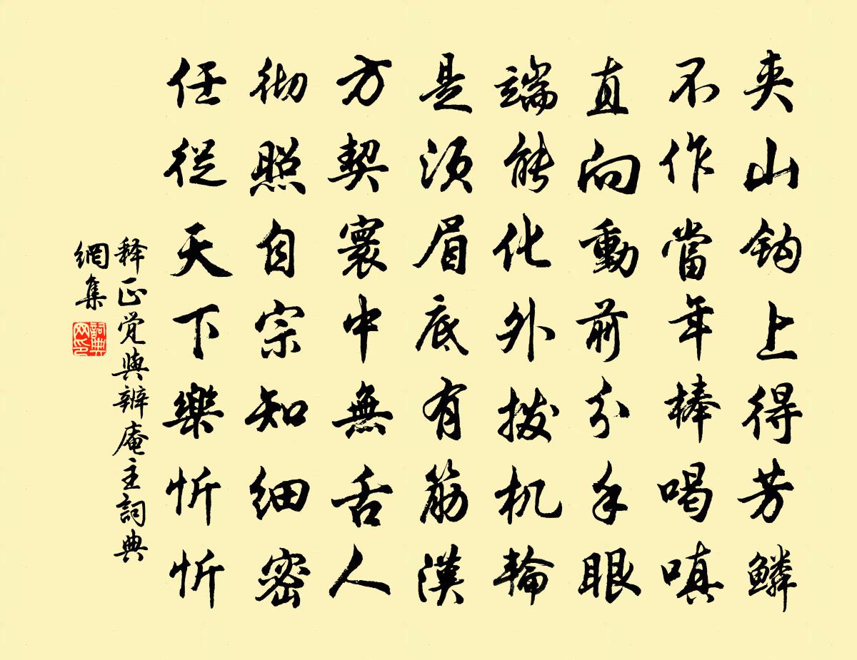 詩詞名句歷史字典書法欣賞書法字典國語詞典說文解字康熙字典古漢語字典標 題 作 者 詩 句 與辨庵主作者:釋正覺 朝代:宋代與辨庵主原文夾山鉤上得芳鱗,不作當年棒喝嗔。直向動前分手眼,端能化外撥機輪。是鬚眉底有筋漢,方契寰中無舌人。徹照自宗知細密,任從天下樂忻忻。詩詞問答問:與辨庵主的作者是誰?答:釋正覺問:與辨庵主寫於哪個朝代?答:宋代釋正覺與辨庵主書法欣賞與辨庵主書法作品詩詞推薦首尾吟邵雍〔宋代〕堯夫非是愛吟詩,詩是堯夫試筆時。以至死生猶處了,自余榮辱可知之。適居堂上行堂上,或在水湄言水湄。不止和利州鮮于轉運公劇八詠竹軒司馬光〔宋代〕茲軒最灑落,歷歷種琅玕。正書簿書稀,蕭蕭風雨寒。翠陰涼宴坐,疏韻承清歡。錦籜裁夏扇,玉筍供春盤。晴蝸春日雜詠九首李彌遜〔宋代〕幽棲足春事,晴日苦相催。屐齒穿沙隱,筇須礙竹回。風光初轉蕙,殘雪欲欺梅。自是經過少,柴門日日開。風流子 中州樂府以上趙萬里輯本金吳激東山吳激〔金代〕書劍憶游梁。當時事、底事不堪傷。念蘭楫嫩漪,向吳南浦,杏花微雨,窺宋東牆。鳳城外,燕隨青步障,絲惹紫及第後上主司王起姚鵠〔唐代〕三年竭力向春闈,塞斷浮華眾路岐。盛選棟樑非昔日,平均雨露及明時。登龍舊美無邪徑,折桂新榮盡直枝。莫道樓潘牥〔宋代〕突兀樓居倚碧空,松江西畔太湖中。天垂十二闌乾角,月滿三千世界中。支提宏老請贊釋妙倫〔宋代〕搭一隻手,揮三尺鐵。天下衲僧,望風膽裂。豈料豐乾院裡撞著個匾頭魔孽,盡把家私俱漏洩。卻向玉融側童峰前金縷曲(壽朱氏老人七十三歲)劉辰翁〔宋代〕七十三年矣。記小人、四百四十五番甲子。看到蓬萊水清淺,休說樹猶如此。但夢夢、昨非今是。一曲尊前離鸞操生日謝朱約山和來韻文天祥〔宋代〕元豐五年正月日,洛中耆英佳話出。當時韓公七十九,歡噱賡酬老吟筆。偉然冠劍照孔鸞,鮐背鳩杖蒲輪安。韓公送盧五方春分教端州趙汝回〔宋代〕柳南矯矯蛟龍騫,古詩古文高入天。奉試詞場三十年,柳度夜夜魁星躔。集英殿下聽臚傳,唱在第十眾所冤。天豈頌古十七首釋大觀〔宋代〕葉脫風高天地秋,長江袞袞只東流。行人不折離亭柳,羌笛空吹落日愁。提舉劉學士以某論守江之策未行作詩見遺謹次蘇泂〔宋代〕福胎當日起燕然,始信興亡不屬天。謀國自知無秘計,何時歸把牧羊鞭。詩一首釋邁賢〔宋代〕揚子江頭浪最深,行人到此盡沉吟。他時若向無波處,還似有波時用心出戶釋文珦〔宋代〕出戶逢幽客,相攜過別村。凍開泥徑滑,橋斷石星存。雲起難知處,泉流自有源。老農心甚適,耕鑿長兒孫。題劉功父與耕堂鄧林〔宋代〕默耕元不外靈台,何用錢添百屋堆。甘雨每從和氣出,祥風常自善心來。畛畦有礙皆除去,境界須寬更放開。種德早行界上迓何使者郭印〔宋代〕天星半牢落,月窗光炯炯。僮婢寐正酣,四鄰雞犬靜。而我獨何之,倒衣不及整。呵鞭驅蹇驢,霜風破裘領。既無感情白居易〔唐代〕中庭曬服玩,忽見故鄉履。昔贈我者誰,東鄰嬋娟子。因思贈時語,特用結終始。永願如履綦,雙行復雙止。自吾次韻蒲大受書懷十首郭印〔宋代〕世業工看卷,天資拙治生。吏曹容小隱,廩祿代深耕。痛飲中賢聖,高吟適性情。妻孥隨我慣,自不厭藜羹。王總卿生日二首魏了翁〔宋代〕上到青天更上頭,蜀人猶記舊得軺。安弦在昔猶危柱,掛壁於今倚大弨。棠樹留春便野茇,桂花和月引仙瓢。風雲池上趙師秀〔宋代〕朝來行藥向秋池,池上秋深病不知。一樹木犀供夜雨,清香移在菊花枝。名句推薦譬道之在天下,猶川谷之於江海。老子《老子·道經·第三十二章》 長江如虹貫,蟠繞其下。宋濂《閱江樓記》 疑行無成,疑事無功。商鞅《商君書·更法》 短景歸秋,吟思又接愁邊。史達祖《玉蝴蝶·晚雨未摧宮樹》 如切如磋,如琢如磨。佚名《淇奧》 故鄉歸去千里,佳處輒遲留。蘇軾《水調歌頭·安石在東海》 嫩寒鎖夢因春冷,芳氣籠人是酒香。曹雪芹《紅樓夢·第五回》 寂寞風蟬至,連翩霜雁來。陰行先《和張燕公湘中九日登高》 香非在蕊,香非在萼,骨中香徹。晁補之《鹽角兒·亳社觀梅》 強龍不壓地頭蛇。吳承恩《西遊記·第四十五回》