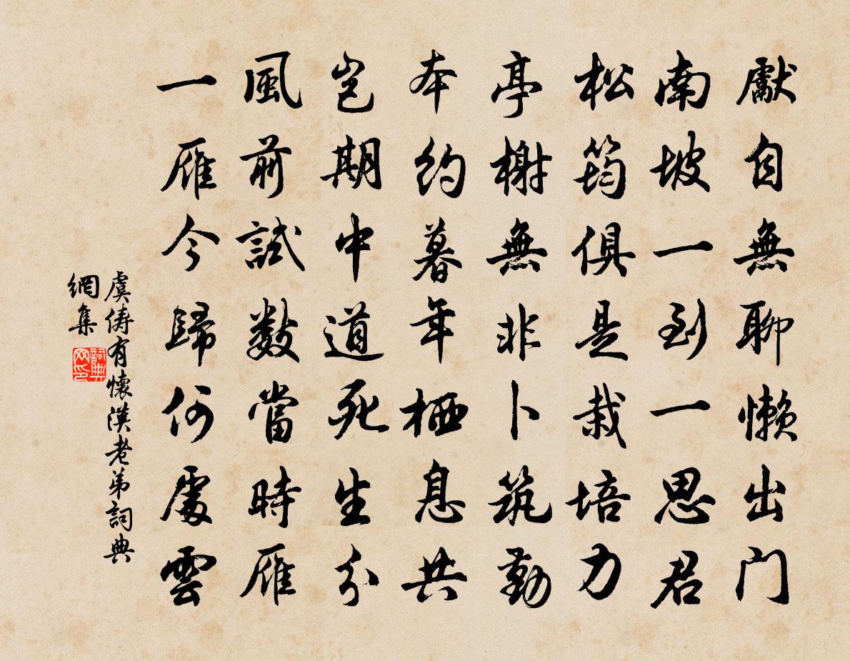 詩詞名句歷史字典書法欣賞書法字典國語詞典說文解字康熙字典古漢語字典標 題 作 者 詩 句 有懷漢老弟作者:虞儔 朝代:宋代有懷漢老弟原文先自無聊懶出門,南坡一到一思君。松筠俱是栽培力,亭榭無非卜築勤。本約暮年棲息共,豈期中道死生分。風前試數當時雁,一雁今歸何處雲。詩詞問答問:有懷漢老弟的作者是誰?答:虞儔問:有懷漢老弟寫於哪個朝代?答:宋代虞儔有懷漢老弟書法欣賞有懷漢老弟書法作品詩詞推薦金剛隨機無盡頌福智無比分第二十四釋印肅〔宋代〕無為福勝田,頓覺如來禪。阿鼻剎那滅,八萬及四千。題曹兄耕綠軒方岳〔宋代〕煙蒼蒼,水茫茫。鵓鴣喚雨蓑笠忙,春泥滑滑蒲稗長。駕犁叱叱牛力強,高田低田齊下秧。隔林人家炊黍香,有來過前岡見毀松有感趙善括〔宋代〕春來乘興泛孤篷,櫂影頻移鑒影中。昨夜忽添三寸雨,今朝尤喜一帆風。桃紅李白年年好,水綠青山處處同。屈指罷郡游何山虞儔〔宋代〕尋山多勝概,輟棹偶留連。南浦渾無緒,東風忽放顛。蹊成桃李退,人去蝶蜂喧。氣味餘禪榻,煎茶竹里煙。春晚客懷 其二王冕〔元代〕落落窮途客,年年不在家。寄眠聽夜雨,借景看春華。空著三山帽,難防兩鬢華。清晨覽明鏡,載笑復咨嗟。寄元規張繼先〔宋代〕白日未中氣色明,玉壺興入西源行。草堂羨我不共往,竹風為汝致幽清。後後閣端午貼子詞五首真德秀〔宋代〕過端辰又是誕辰,天家風物鎮長新。六宮競獻長生縷,一縷應期一萬春。三用韻十首楊公遠〔宋代〕人生期滿百,有興且追游。白髮來非約,青春去莫留。兔烏雙轉轂,今古一憑樓。莫問窮通事,從今付分休。送客南遊馬戴〔唐代〕擬卜何山隱,高秋指岳陽。葦乾雲夢色,橘熟洞庭香。疏雨殘虹影,回雲背鳥行。靈均如可問,一為哭清湘。風張嵲〔宋代〕一歲三百日,烈風朝暮吹。不知剖判來,曾有無風時。況茲逾年旱,小雨時散絲。蓬蓬從天來,一掃雲氣離。雖荷菩薩蠻李真人〔元代〕還丹水火將何作。須知兩位相交錯。火在水中求。水從火里流。水流遭火克。為有中男力。水被火凌持。相攜一室送孫從之秘監歸朝供職周必大〔宋代〕蚤看媠鵬萬里風,晚陪劍履大明宮。誰知九郡提封廣,還許三年使事同。我合掛冠尋舊隱,君當補袞用新功。中興南遊湘漢寄友人李頻〔唐代〕南去遠三京,三湘五月行。巴江雪水下,楚澤火雲生。向野聊中飲,乘涼探暮程。離懷不可說,已近峽猿聲。見劉後村先生吳龍翰〔宋代〕玻璃萬頃海天秋,相國如居天上頭。錦帳圍山丹荔熟,銀梭織水子魚游。地靈自古稱多士,人物當今列上流。二季與邵德芳同舍三首林景熙〔宋代〕葵心戀日還終在,橘性逾淮已不同。誰識鱸江持釣手,曾搴月窟一枝紅。胡笳曲二首曹勛〔宋代〕漢使通沙漠,胡人過渭橋。春風吹客恨,千里去迢迢。題壽樟亭曾幾〔宋代〕大屋連甍小容足,棟宇以來非一木。豫章不是十圍樗,受命於天何得獨。君莫厭老大蓬蒿間,應龍虹梁果非福。虛漫興 其二王冕〔元代〕關下險固憑三輔,隴右勾連線四川。簇簇樓台懸日月,盈盈花草爛雲煙。飈回海上沙飛雪,雨足江南水拍天。可笑冬夜憶謙之方翥〔宋代〕忽憶夫君阻笑言,出門南望欲飛翻。孤誠隔水初浸夜,畫敬愛因自入村。短句有時隨意得,古心近日與誰論。未除縹緲峰范成大〔宋代〕滿載清閒一棹孤,長風相送入仙都。莫愁懷抱無消豁,縹緲峰頭望太湖。名句推薦把酒送君天上去,瓊玉琚玉佩軝鴻列。嚴羽《滿江紅·送廖叔仁赴闕》 近來攀折苦,應為別離多王之渙《送別》 相望試登高,心隨雁飛滅。孟浩然《秋登蘭山寄張五》 桃根桃葉終相守,伴殷勤、雙宿鴛鴦。納蘭性德《一叢花·詠並蒂蓮》 蝸角虛名,蠅頭微利,算來著甚乾忙。蘇軾《滿庭芳·蝸角虛名》 舊時王謝、堂前燕子,飛向誰家。吳激《人月圓·南朝千古傷心事》 雨歇梧桐淚乍收,遣懷翻自憶從頭。納蘭性德《浣溪沙·雨歇梧桐淚乍收》 知者順時而謀,愚者逆理而動范曄《後漢書·列傳·朱馮虞鄭周列傳》 小知不可使謀事,小忠不可使主法。韓非及後人《韓非子·飾邪》 冬夜夜寒覺夜長,沉吟久坐坐北堂。李白《夜坐吟》
